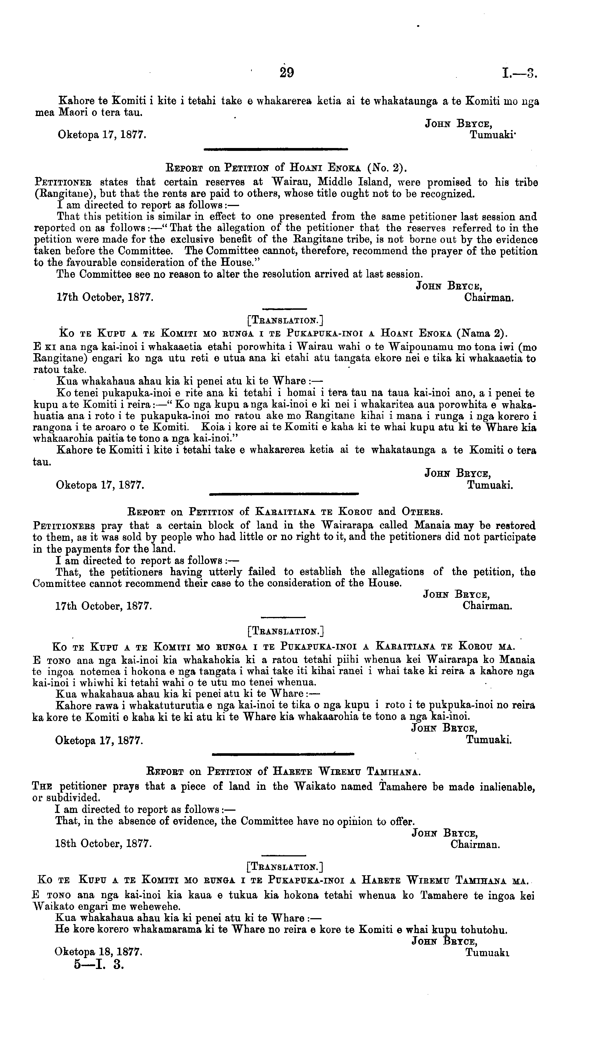 [Translation.] Ko te Kupu a te Komiti mo runga i te Pukapuka-inoi a Haeete Wiremu Tamihana ma. E tono ana nga kai-inoi kia kaua c tukua kia hokona tetahi whenua ko Tamahere te ingoa kei Waikato engari me wehewehe. Kua whakahaua ahau kia ki penei atu kite Whare : — He kore korero whakamarama kite Whare no reira c kore te Komiti c whai kupu tohutohu. John Beyce, Oketopa 18, 1877. Tumuaki s—l. 3.