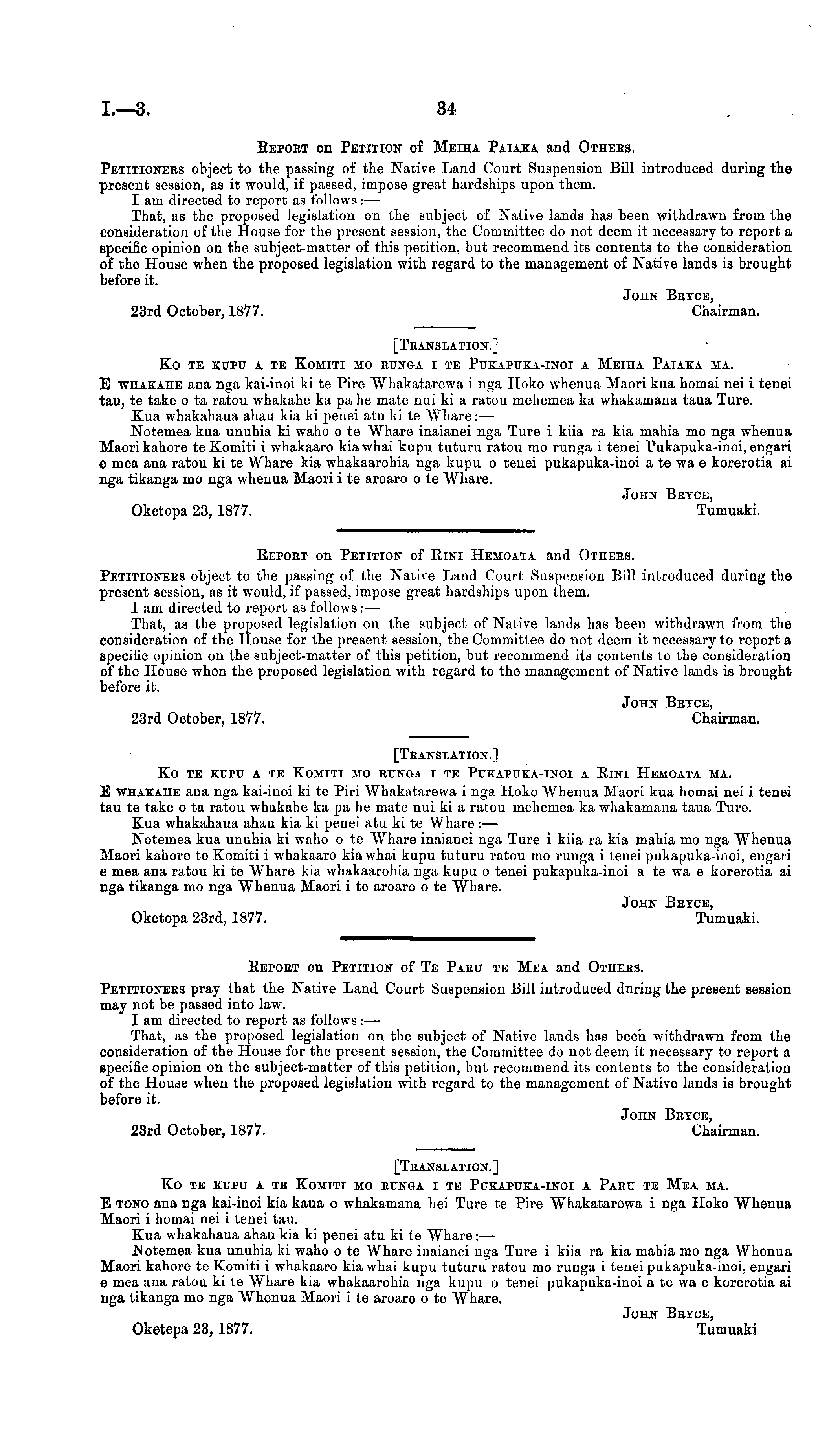 [Translation.] Ko TE KUPU A TE KOMITI MO EUNGA I TE PuKAPUKA-INOI A MEIHA PaTAKA MA. E whakahe ana nga kai-inoi kite Pire Whakatarewa i nga Hoko whenua Maori kua homai nei i tenei tau, te take o ta ratou whakahe ka pa he mate nui ki a ratou mehemea ka whakamana taua Ture. Kua whakahaua ahau kia ki penei atu kite Whare:— Notemea kua unuhia ki waho o te Whare inaianei nga Ture i kiia ra kia mahia mo nga whenua Maori kahore te Komiti i whakaaro kia whai kupu tuturu ratou mo runga i tenei Pukapuka-inoi, engari c mea ana ratou kite Whare kia whakaarohia nga kupu o tenei pukapuka-inoi a te wa c korerotia ai nga tikanga mo nga whenua Maori i te aroaro o te Whare. John Bryce, Oketopa 23, 1877. Tumuaki.