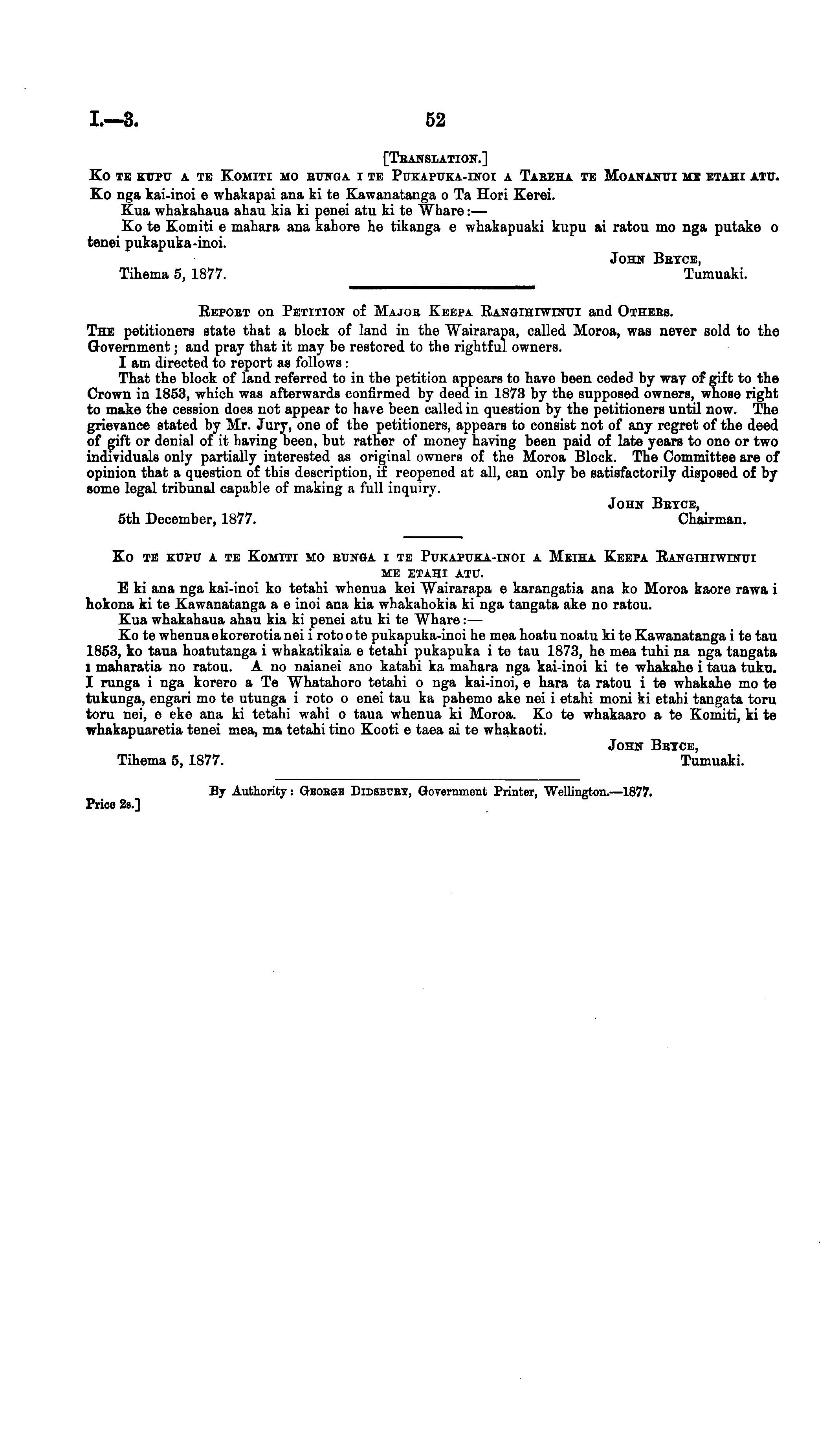 KO TE KUPU A TE KoMITI MO EUNGA I TE PUKAPUKA-INOI A MEIHA KeEPA EANGIHIWINUI ME ETAHI ATU. E ki ana nga kai-inoi ko tetahi whenua kei Wairarapa c karangatia ana ko Moroa kaore rawa i hokona kite Kawanatanga a c inoi ana kia whakahokia ki nga tangata ake no ratou. Kua whakahaua ahau kia ki penei atu kite Whare:— Ko te whenua ekorerotia nei i rotoote pukapuka-inoi he mea hoatu noatu kite Kawanatanga i te tau 1853, ko taua hoatutanga i whakatikaia c tetahi pukapuka i te tau 1873, he mea tuhi na nga tangata 1 maharatia no ratou. Ano naianei ano katahi ka mahara nga kai-inoi kite whakahe i taua tuku. I runga i nga korero a Te Whatahoro tetahi o nga kai-inoi, c hara ta ratou i te whakahe mo te tukunga, engari mo te utunga i roto o enei tau ka pahemo ake nei i etahi moni ki etahi tangata toru toru nei, c eke ana ki tetahi wahi o taua whenua ki Moroa. Ko te whakaaro ate Komiti, kite whakapuaretia tenei mea, ma tetahi tino Kooti c taea ai te whakaoti. John Beyce, Tihema 5, 1877. Tumuaki.