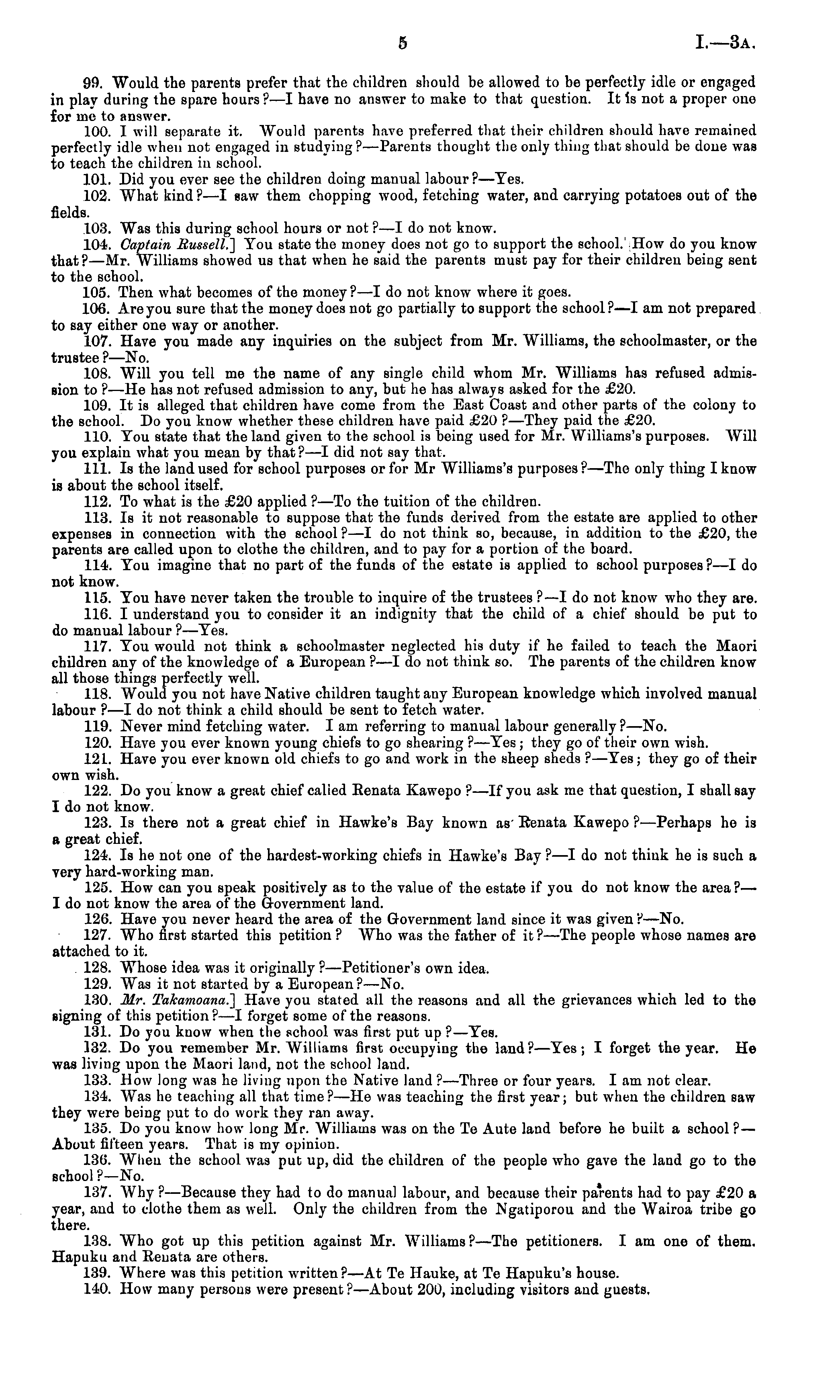 99. Would the parents prefer that the children should be allowed to be perfectly idle or engaged in play during the spare hours? —I have no answer to make to that question. It is not a proper one for me to answer. 100. I will separate it. Would parents have preferred that their children should have remained perfectly idle when not engaged in studying ? —Parents thought the only thing that should be done was to teach the children in school. 101. Did you ever see the children doing manual labour?—Tes. 102. What kind ?—I saw them chopping wood, fetching water, and carrying potatoes out of the fields. 103. Was this during school hours or not ?—I do not know. 104. Captain Russell.'] You state the money does not go to support the school. How do you know that? —Mr. Williams showed us that when he said the parents must pay for their children being sent to the school. 105. Then what becomes of the money? —I do not know where it goes. 106. Are you sure that the money does not go partially to support the school ?—I am not prepared to say either one way or another. 107. Have you made any inquiries on the subject from Mr. Williams, the schoolmaster, or the trustee ? —No. 108. Will you tell me the name of any single child whom Mr. Williams has refused admission to ?—-He has not refused admission to any, but he has always asked for the £20. 109. It is alleged that children have come from the East Coast and other parts of the colony to the school. Do you know whether these children have paid £20 ?—They paid the £20. 110. You state that the land given to the school is being used for Mr. Williarns's purposes. Will you explain what you mean by that ? —I did not say that. 111. Is the land used for school purposes or for Mr Williams's purposes?—The only thing I know is about the school itself. 112. To what is the £20 applied ?—To the tuition of the children. 113. Is it not reasonable to suppose that the funds derived from the estate are applied to other expenses in connection with the school ? —I do not think so, because, in addition to the £20, the parents are called upon to clothe the children, and to pay for a portion of the board. 114. You imagine that no part of the funds of the estate is applied to school purposes?—I do not know. 115. You have never taken the trouble to inquire of the trustees ?—I do not know who they are. 116. I understand you to consider it an indignity that the child of a chief should be put to do manual labour ?—Yes. 117. You would not think a schoolmaster neglected his duty if he failed to teach the Maori children any of the knowledge of a European ?—I do not think so. The parents of the children know all those things perfectly well. 118. Would you not have Native children taught any European knowledge which involved manual labour ?—I do not think a child should be sent to fetch water. 119. Never mind fetching water. I am referring to manual labour generally ?—No. 120. Have you ever known young chiefs to go shearing ?—Yes ; they go of their own wish. 121. Have you ever known old chiefs to go and work in the sheep sheds ?—Yes; they go of their own wish. 122. Do you know a great chief called Eenata Kawepo ?—If you ask me that question, I shall say I do not know. 123. Is there not a great chief in Hawke's Bay known as' Renata Kawepo ? —Perhaps ho is a great chief. 124. Is he not one of the hardest-working chiefs in Hawke's Bay ?—I do not think he is such a very hard-working man. 125. How can you speak positively as to the value of the estate if you do not know the area?— I do not know the area of' the Government land. 126. Have you never heard the area of the Government land since it was given ? —No. 127. Who first started this petition ? Who was the father of it ? —The people whose names are attached to it. 128. Whose idea was it originally ?—Petitioner's own idea. 129. Was it not started by a European? —No. 130. Mr. Takamoana.~\ Have you stated all the reasons and all the grievances which led to the signing of this petition?—I forget some of the reasons. 131. Do you know when the school was first put up ?—Yes. 132. Do you remember Mr. Williams first occupying the land?—Yes; I forget the year. He was living upon the Maori land, not the school land. 133. How long was he living upon the Native land ?—Three or four years. I am not clear. 134. Was he teaching all that time? —He was teaching the first year; but when the children saw they were being put to do work they ran away. 135. Do you know how long Mr. Williams was on the Te Aute land before he built a school ?— About fifteen years. That is my opinion. 136. Wlieu the school was put up, did the children of the people who gave the land go to the school ?—No. 137. Why ? —Because they had to do manual labour, and because their parents had to pay £20 a year, and to clothe them as well. Only the children from the Ngatiporou and the Wairoa tribe go there. 138. Who got up this petition against Mr. Williams? —The petitioners. I am one of them. Hapuku and lieuata are others. 139. Where was this petition written?—At Te Hauke, at Te Hapuku's house. 140. How many persous were present ?—About 200, including visitors aud guests.