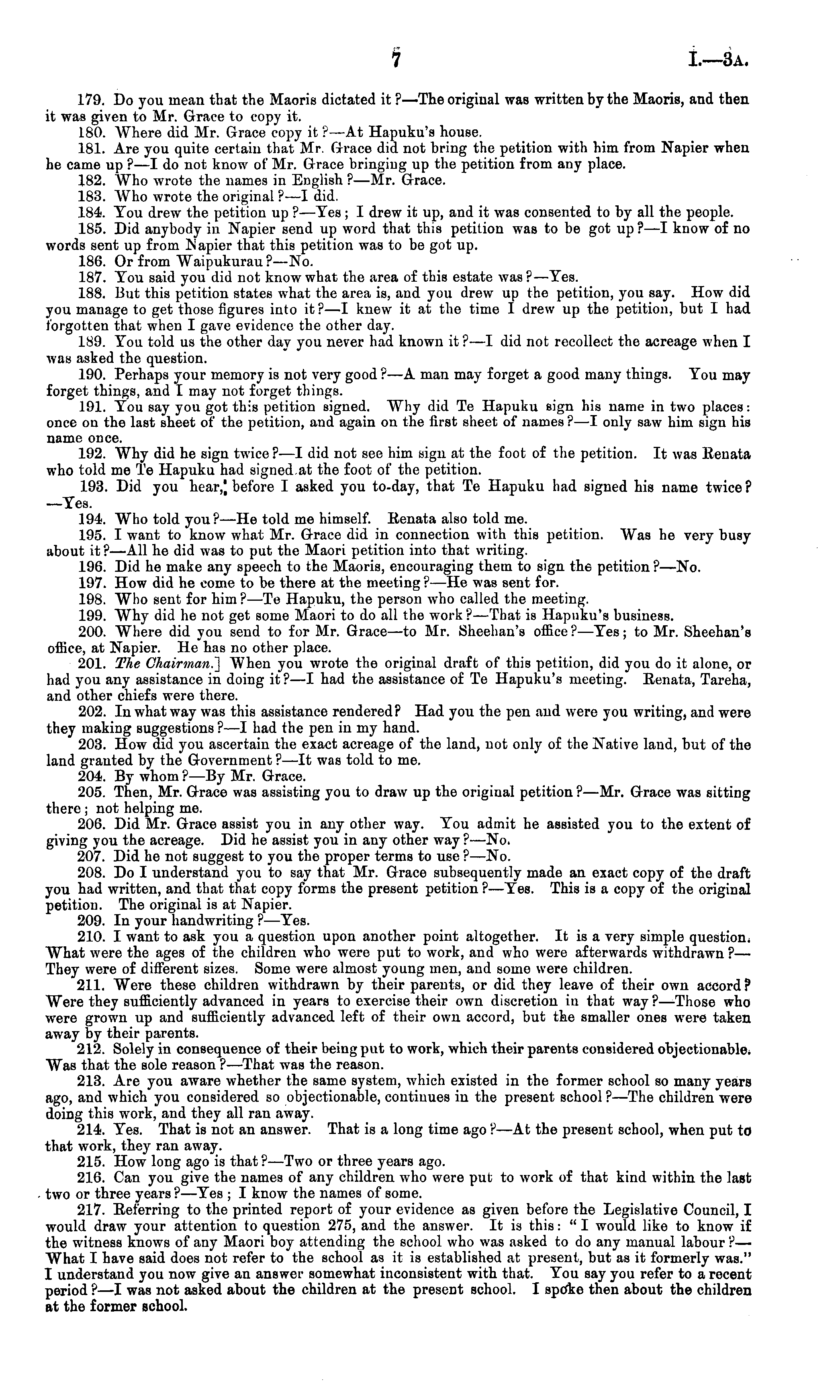 179. Do you mean that the Maoris dictated it ?—The original was written by the Maoris, and then it was given to Mr. Grace to copy it. 180. Where did Mr. Grace copy it P —At Hapuku's house. 181. Are you quite certain that Mr. Grace did not bring the petition with him from Napier when he came up ?—I do not know of Mr. Grace bringing up the petition from any place. 182. Who wrote the names in English ?—Mr. Grace. 183. Who wrote the original ? —I did. 184. You drew the petition up ? —Yes; I drew it up, and it was consented to by all the people. 185. Did anybody in Napier send up word that this petition was to be got up ? —I know of no words sent up from Napier that this petition was to be got up. 186. Or from Waipukurau ?—No. 187. You said you did not know what the area of this estate was?—Yes. 188. But this petition states what the area is, and you drew up the petition, you say. How did you manage to get those figures into it?—I knew it at the time I drew up the petition, but 1 had forgotten that when I gave evidence the other day. 189. You told us the other day you never had known it ? —I did not recollect the acreage when I was asked the question. 190. Perhaps your memory is not very good ?—A man may forget a good many things. You may forget things, and I may not forget tilings. 191. You say you got this petition signed. Why did Te Hapuku sign his name in two places: once on the last sheet of the petition, and again on the first sheet of names ?—I only saw him sign his name once. 192. Why did he sign twice ? —I did not see him sign at the foot of the petition. It was Eeuata who told me Te Hapuku had signed at the foot of the petition. 193. Did you hear,) before I asked you to-day, that Te Hapuku had signed his name twice ? —Yes. 194. Who told you? —He told me himself. Kenata also told me. 195. I want to know what Mr. Grace did in connection with this petition. Was he very busy about it?—All he did was to put the Maori petition into that writing. 196. Did he make any speech to the Maoris, encouraging them to sign the petition ?—No. 197. How did he come to be there at the meeting ? —He was sent for. 198. Who sent for him ?—Te Hapuku, the person who called the meeting. 199. Why did he not get some Maori to do all the work ?—That is Hapuku's business. 200. Where did you scud to for Mr. Grace—to Mr. Sheehan's office ? —Yes; to Mr. Sheehan's office, at Napier. He has no other place. 201. The Chairman.'] When you wrote the original draft of this petition, did you do it alone, or had you any assistance in doing it?—I had the assistance of Te Hapuku's meeting. Renata, Tareha, and other chiefs were there. 202. In what way was this assistance rendered? Had you the pen and were you writing, and were they making suggestions ?—I had the pen in my hand. 203. How did you ascertain the exact acreage of the land, not only of the Native laud, but of the land granted by the Government ?—It was told to me. 204. By whom ? —By Mr. Grace. 205. Then, Mr. Grace was assisting you to draw up the original petition ?—Mr. Grace was sitting there ; not helping me. 206. Did Mr. Grace assist you in any other way. You admit he assisted you to the extent of giving you the acreage. Did he assist you in any other way ?—No. 207. Did he not suggest to you the proper terms to use ?—No. 208. Do I understand you to say that Mr. Grace subsequently made an exact copy of the draft you had written, and that that copy forms the present petition ? —Yes. This is a copy of the original petition. The original is at Napier. 209. In your handwriting ? —Yes. 210. I want to ask you a question upon another point altogether. It is a very simple question. AVhat were the ages of the children who were put to work, and who were afterwards withdrawn ?— They were of different sizes. Some were almost young men, and somo were children. 211. Were these children withdrawn by their parents, or did they leave of their own accord? Were they sufficiently advanced in years to exercise their own discretion in that way ?—Those who were grown up and sufficiently advanced left of their own accord, but the smaller ones were taken away by their parents. 212. Solely in consequence of their being put to work, which their parents considered objectionable. Was that the sole reason ? —That was the reason. 213. Are you aware whether the same system, which existed in the former school so many years ago, and which you considered so objectionable, continues in the present school ?—The children were doing this work, and they all ran away. 214. Yes. That is not an answer. That is a long time ago ? —At the present school, when put to that work, they ran away. 215. How long ago is that ? —Two or three years ago. 216. Can you give the names of any children who were put to work of that kind within the last two or three years ?—Yes ; I know the names of some. 217. Referring to the printed report of your evidence as given before the Legislative Council, I would draw your attention to question 275, and the answer. It is this: " I would like to know if the witness knows of any Maori boy attending the school who was asked to do any manual labour ?— What I have said does not refer to the school as it is established at present, but as it formerly was." I understand you now give an answer somewhat inconsistent with that. You say you refer to a recent period ?—I was not asked about the children at the present school. I spcfke then about the children at the former school.