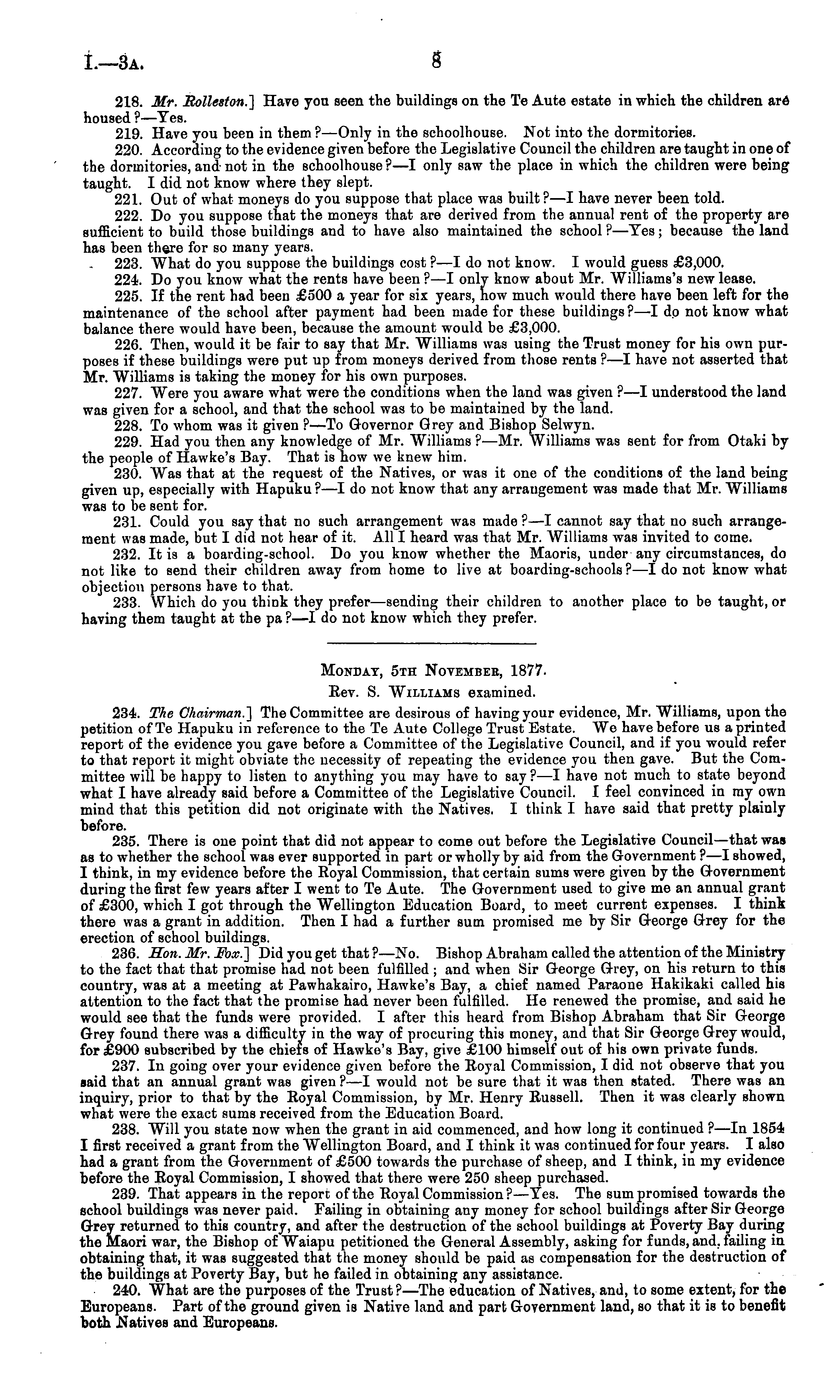 Monday, 5th November, 1877. Rev. S. Williams examined. 234. The Chairman.] The Committee are desirous of having your evidence, Mr. Williams, upon the petition of Te Hapuku in reference to the Te Aute College Trust Estate. We have before us a printed report of the evidence you gave before a Committee of the Legislative Council, and if you would refer to that report it might obviate the necessity of repeating the evidence you theu gave. But the Committee will be happy to listen to anything you may have to say ? —I have not much to state beyond what I have already said before a Committee of the Legislative Council. I feel convinced in my own mind that this petition did not originate with the Natives. I think I have said that pretty plainly before. 235. There is one point that did not appear to come out before the Legislative Council —that was as to whether the school was ever supported in part or wholly by aid from the Government ? —I showed, I think, in my evidence before the Royal Commission, that certain sums were given by the Government during the first few years after I went to Te Aute. The Government used to give me an annual grant of £300, which I got through the Wellington Education Board, to meet current expenses. I think there was a grant in addition. Then I had a further sum promised me by Sir George Grey for the erection of school buildings. 236. Hon. Mr. Fox.] Did you get that ?—No. Bishop Abraham called the attention of the Ministry to the fact that that promise had not been fulfilled ; and when Sir George Grey, on his return to this country, was at a meeting at Pawhakairo, Hawke's Bay, a chief named Paraone Hakikaki called his attention to the fact that the promise had never been fulfilled. He renewed the promise, and said he would see that the funds were provided. I after this heard from Bishop Abraham that Sir George Grey found there was a difficulty in the way of procuring this money, and that Sir George Grey would, for £900 subscribed by the chiefs of Hawke's Bay, give £100 himself out of his own private funds. 237. In going over your evidence given before the Royal Commission, I did not observe that you said that an annual grant was given ?—I would not be sure that it was then stated. There was an inquiry, prior to that by the Royal Commission, by Mr. Henry Russell. Then it was clearly shown what were the exact sums received from the Education Board. 238. Will you state now when the grant in aid commenced, and how long it continued ? —In 1854 I first received a grant from the Wellington Board, and I think it was continued for four years. I also had a grant from the Government of £500 towards the purchase of sheep, and I think, in my evidence before the Royal Commission, 1 showed that there were 250 sheep purchased. 239. That appears in the report of the Royal Commission ? —Yes. The sum promised towards the school buildings was never paid. Failing in obtaining any money for school buildings after Sir George Grey returned to this country, and after the destruction of the school buildings at Poverty Bay during the Maori war, the Bishop of Waiapu petitioned the General Assembly, asking for funds, and. failing in obtaining that, it was suggested that the money should be paid as compensation for the destruction of the buildings at Poverty Bay, but he failed in obtaining any assistance. 240. What are the purposes of the Trust?—The education of Natives, and, to some extent, for the Europeans. Part of the ground given is Native land and part Government land, so that it is to benefit both Natives and Europeans.