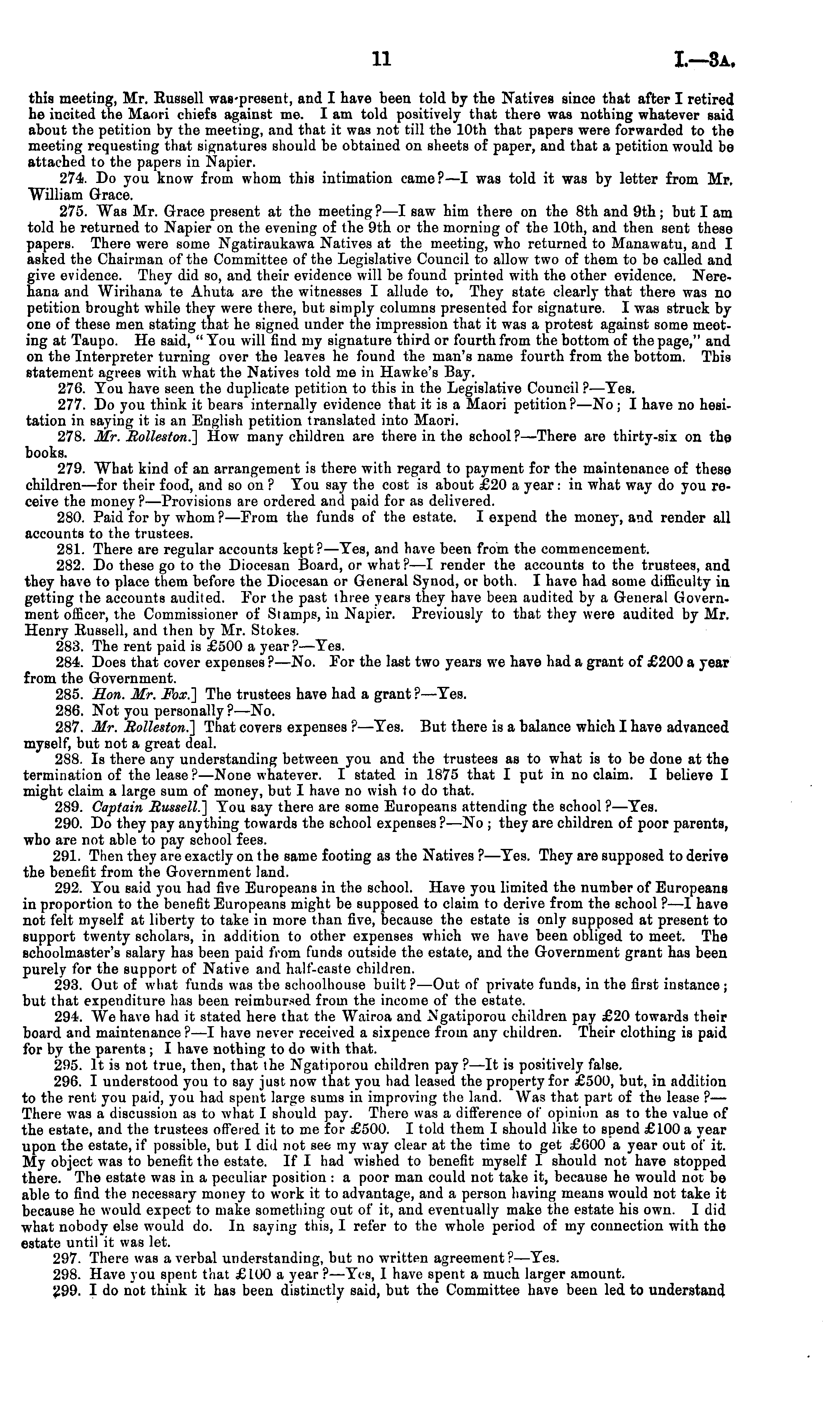 this meeting, Mr, Eussell was-present, and I have been told by the Natives since that after I retired he incited the Maori chiefs against me. I am told positively that there was nothing whatever said about the petition by the meeting, and that it was not till the 10th that papers were forwarded to the meeting requesting that signatures should be obtained on sheets of paper, and that a petition would be attached to the papers in Napier. 274. Do you know from whom this intimation came?—I was told it was by letter from Mr. William Grace. 275. Was Mr. Grace present at the meeting ? —I saw him there on the 8th and 9th; but I am told he returned to Napier on the evening of the 9th or the morning of the 10th, and theii sent these papers. There were some Ngatiraukawa Natives at the meeting, who returned to Manawatu, and I asked the Chairman of the Committee of the Legislative Council to allow two of them to be called and give evidence. They did so, and their evidence will be found printed with the other evidence. Nerehana and Wirihana te Ahuta are the witnesses I allude to. They state clearly that there was no petition brought while they were there, but simply columns presented for signature. I was struck by one of these men stating that he signed under the impression that it was a protest against some meeting at Taupo. He said, " You will find my signature third or fourth from the bottom of the page," and on the Interpreter turning over the leaves he found the man's name fourth from the bottom. This statement agrees with what the Natives told me in Hawke's Bay. 276. You have seen the duplicate petition to this in the Legislative Council ?—Yes. 277. Do you think it bears internally evidence that it is a Maori petition?—No ; I have no hesitation in saying it is an English petition translated into Maori. 278. Mr. Rolleston.] How many children are there in the school?—There are thirty-six on the books. 279. What kind of an arrangement is there with regard to payment for the maintenance of these children—for their food, and so on ? You say the cost is about £20 a year: in what way do you receive the money ?—Provisions are ordered and paid for as delivered. 280. Paid for by whom ?—From the funds of the estate. I expend the money, and render all accounts to the trustees. 281. There are regular accounts kept? —Yes, and have been from the commencement. 282. Do these go to the Diocesan Board, or what? —I render the accounts to the trustees, and they have to place them before the Diocesan or General Synod, or both. I have had some difficulty in getting the accounts audited. For the past three years they have been audited by a General Government officer, the Commissioner of Stamps, in Napier. Previously to that they were audited by Mr. Henry liussell, and then by Mr. Stokes. 283. The rent paid is £500 a year ? —Yes. 284. Does that cover expenses ? —No. For the last two years we have had a grant of £200 a year from the Government. 285. Ron. Mr. Fox.] The trustees have had a grant ? —Yes. 286. Not you personally?—No. 287. Mr. BoUeston.] That covers expenses ? —Yes. But there is a balance which I have advanced myself, but not a great deal. 288. Is there any understanding between you and the trustees as to what is to be done at the termination of the lease ?—None whatever. I stated in 1875 that I put in no claim. I believe I might claim a large sum of money, but I have no wish to do that. 289. Captain Russell!] You say there are some Europeans attending the school ? —Yes. 290. Do they pay anything towards the school expenses ? —No ; they are children of poor parents, who are not able to pay school fees. 291. Then they are exactly on the same footing as the Natives ?—Yes. They are supposed to derive the benefit from the Government land. 292. You said you had five Europeans in the school. Have you limited the number of Europeans in proportion to the benefit Europeans might be supposed to claim to derive from the school ? —I have not felt myself at liberty to take in more than five, because the estate is only supposed at present to support twenty scholars, in addition to other expenses which we have been obliged to meet. The schoolmaster's salary has been paid from funds outside the estate, and the Government grant has been purely for the support of Native and halt'-easte children. 293. Out of what funds was the schoolhouse built ?—Out of private funds, in the first instance ; but that expenditure has been reimbursed from the income of the estate. 294. We have had it stated here that the Wairoa and Ngatiporou children pay £20 towards their board and maintenance? —I have never received a sixpence from any children. Their clothing is paid for by the parents; I have nothing to do with that. 205. It is not true, then, that the Ngatiporou children pay?—It is positively false. 296. I understood you to say just now that you had leased the property for £500, but, in addition to the rent you paid, you had spent large sums in improving the land. Was that part of the lease ?— There was a discussion as to what I should pay. There was a difference of opinion as to the value of the estate, and the trustees offered it to me for £500. I told them I should like to spend £100 a year upon the estate, if possible, but 1 did not see my way clear at the time to get £600 a year out of it. My object was to benefit the estate. If I had wished to benefit myself I should not have stopped there. The estate was in a peculiar position : a poor man could not take it, because he would not be able to find the necessary money to work it to advantage, and a person having means would not take it because he would expect to make something out of it, and eventually make the estate his own. I did what nobody else would do. In saying this, I refer to the whole period of my connection with the estate until it was let. 297. There was a verbal understanding, but no written agreement? —Yes. 298. Have