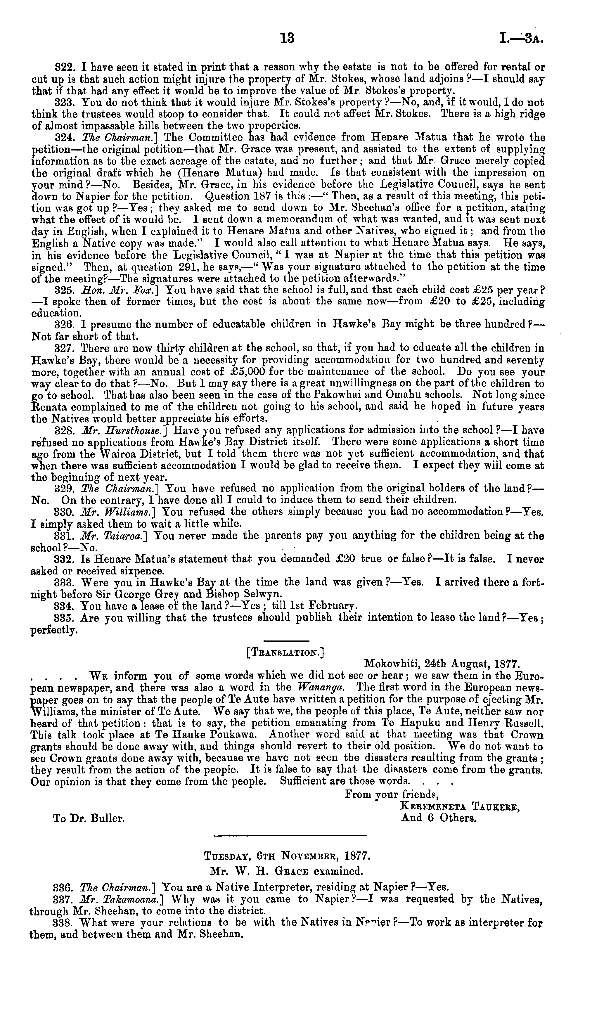 822. I have seen it stated in print that a reason why the estate is not to be offered for rental or cut up is that such action might injure the property of Mr. Stokes, whose land adjoins ?—I should say that if that had any effect it would be to improve the value of Mr. Stokes's property. 323. You do not think that it would injure Mr. Stokes's property P —No, and, if it would, I do not think the trustees would stoop to consider that. It could not affect Mr. Stokes. There is a high ridge of almost impassable hills between the two properties. 324. The Chairman.'] The Committee has had evidence from Henare Matua that he wrote the petition—the original petition —that Mr. Grace was present, and assisted to the extent of supplying information as to the exact acreage of the estate, and no further; and that Mr. Grace merely copied the original draft which ho (Henare Matua) had made. Is that consistent with the impression on your mind ?—No. Besides, Mr. Grace, in his evidence before the Legislative Council, says he sent down to Napier for the petition. Question 187 is this : —" Then, as a result of this meeting, this petition was got up ?—Yes ; they asked me to send down to Mr. Sheehan's office for a petition, stating what the effect of it would be. I sent down a memorandum of what was wanted, and it was sent next day in English, when I explained it to Henare Matua and other Natives, who signed it; and from the English a Native copy was made." I would also call attention to what Henare Matua says. He says, in his evidence before the Legislative Council, " I was at Napier at the time that this petition was signed." Then, at question 291, he says, —" Was your signature attached to the petition at the time of the meeting? —The signatures were attached to the petition afterwards." 325. Hon. Mr. Fox.] You have said that the school is full, and that each child cost £25 per year ? —I spoke then of former times, but the cost is about the same now —from £20 to £25, including education. 326. I presume the number of educatable children in Hawke's Bay might be three hundred ? — Not far short of that. 327. There are now thirty children at the school, so that, if you had to educate all the children in Hawke's Bay, there would be a necessity for providing accommodation for two hundred and seventy more, together with an annual cost of £5,000 for the maintenance of the school. Do you see your way clear to do that ? —No. But I may say there is a great unwillingness on the part of the children to go to school. That has also been seen in the case of the Pakowhai and Omahu schools. Not long since Kenata complained to me of the children not going to his school, and said he hoped in future years the Natives would better appreciate his efforts. 328. Mr. Hursthouse.] Have you refused any applications for admission into the school ?—I have refused no applications from Hawke's Bay District itself. There were some applications a short time ago from the Wairoa District, but I told them there was not yet sufficient accommodation, and that when there was sufficient accommodation I would be glad to receive them. I expect they will come at the beginning of next year. 320. The Chairman.] You have refused no application from the original holders of the land?— No. On the contrary, I have done all I could to induce them to send their children. 330. Mr. Williams.'] You refused the others simply because you had no accommodation?—Yes. I simply asked them to wait a little while. 331. Mr. Taiaroa.] You never made the parents pay you anything for the children being at the school ?—No. 332. Is Henare Matua's statement that you demanded £20 true or false ?—It is false. I never asked or received sixpence. 333. Were you in Hawke's Bay at the time the land was given ?—Yes. I arrived there a fortnight before Sir George Grey and Bishop Selwyn. 334. You have a lease of the land ?—Yes ; till 1st February. 335. Are you willing that the trustees should publish their intention to lease the land ?—Yes; perfectly. [TRANSLATION.] Mokowhiti, 24th August, 1877. . . . . We inform you of some words which we did not see or hear; we saw them in the European newspaper, and there was also a word in the Wananga. The first word in the European newspaper goes on to say that the people of Te Aute have written a petition for the purpose of ejecting Mr. Williams, the minister of Te Aute. We say that we, the people of this place, Te Aute, neither saw nor heard of that petition : that is to say, the petition emanating from Te Hapuku and Henry Eussell. This talk took place at Te Hauke Poukawa. Another word said at that meeting was that Crown grants should be done away with, and things should revert to their old position. We do not want to see Crown grants done away with, because we have not seen the disasters resulting from the grants ; they result from the action of the people. It is false to say that the disasters come from the grants. Our opinion is that they come from the people. Sufficient are those words. . . . From your friends, Keeemkneta Tatjkeee, To Dr. Buller. And 6 Others. Tuesday, 6th Noyembee, 1877. Mr. W. H. Geace examined. 336. The Chairman.] You are a Native Interpreter, residing at Napier ? —Yes. 337. Mr. Takamoana.] Why was it you came to Napier?—I was requested by the Natives, through Mr. Sheehan, to come into the district. 338. What were your relations to be with the Natives in Np^ier ?—To wprk as interpreter for them, and between them and Mr. Sheehan,