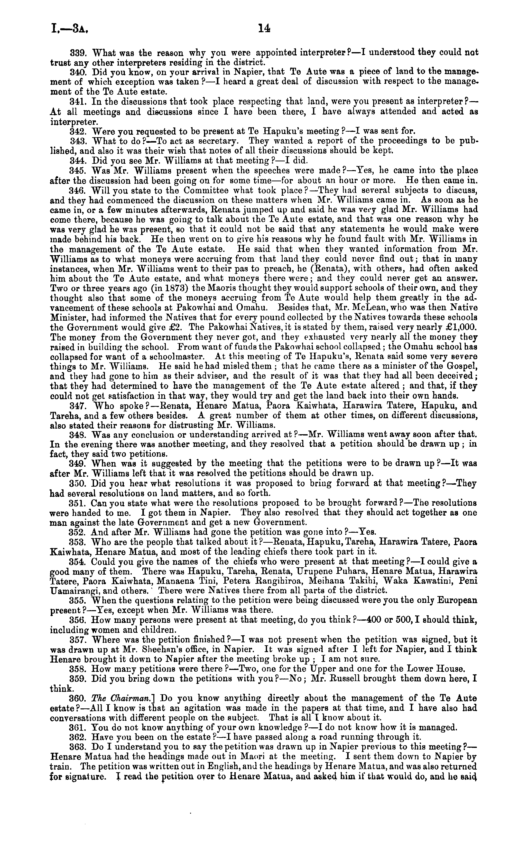 339. What was the reason why you were appointed interpreter ?—I understood they could not trust any other interpreters residing in the district. 340. Did you know, on your arrival in Napier, that Te Aute was a piece of land to the management of which exception was taken?—I heard a great deal of discussion with respect to the management of the Te Aute estate. 341. In the discussions that took place respecting that land, were you present as interpreter?— At all meetings and discussions since I have been there, I have always attended and acted as interpreter. 342. Were you requested to be present at Te Hapuku's meeting ? —I was sent for. 343. What to do ?—To act as secretary. They wanted a report of the proceedings to be published, and also it was their wish that notes of all their discussions should be kept. 344. Did you see Mr. Williams at that meeting ? —I did. 345. Was Mr. Williams present when the speeches were made ?—Yes, he came into the place after the discussion had been going on for some time —for about an hour or more. He then came in. 34G. Will you state to the Committee what took place? —They had several subjects to discuss, and they had commenced the discussion on these matters when Mr. Williams came in. As soon as he came in, or a few minutes afterwards, Renata jumped up and said he was very glad Mr. Williams had come there, because he was going to talk about the Te Aute estate, and that was one reason why he was very glad he was present, so that it could not be said that any statements he would make were made behind his back. He then went on to give his reasons why he found fault with Mr. Williams in the management of the Te Aute estate. He said that when they wanted information from Mr. Williams as to what moneys were accruing from that land they could never find out; that in many instances, when Mr. Williams went to their pas to preach, he (Renata), with others, had often asked him about the Te Aute estate, and what moneys there were; and they could never get an answer. Two or three years ago (in 1873) the Maoris thought they would support schools of their own, and they thought also that some of the moneys accruing from Te Aute would help them greatly in the advancement of these schools at Pakowhai and Omahu. Besides that, Mr. McLean, who was then Native Minister, had informed the Natives that for every pound collected by the Natives towards these schools the Government would give £2. The Pakowhai Natives, it is stated by them, raised very nearly £1,000. The money from the Government they never got, and the}' exhausted very nearly all the money they raised in building the school. From want of funds the Pakowhai school collapsed ; the Omahu school has collapsed for want of a schoolmaster. At this meeting of Te Hapuku's, Renata said some very severe things to Mr. Williams. He said he had misled them ; that he came there as a minister of the Gospel, and they had gone to him as their adviser, and the result of it was that they had all been deceived; that they had determined to have the management of the Te Aute estate altered ; and that, if they could not get satisfaction in that way, they would try and get the land back into their own hands. 347. Who spoke?—Renata, Henare Matua, Paora Kaiwhata, Harawira Tatere, Hapuku, and Tareha, and a few others besides. A great number of them at other times, on different discussions, also stated their reasons for distrusting Mr. Williams. 34S. Was any conclusion or understanding arrived at ?—Mr. Williams went away soon after that. In the evening there was another meeting, and they resolved that a petition should be drawn up ; in fact, they said two petitions. 349. When was it suggested by the meeting that the petitions were to be drawn up ?—It was after Mr. Williams left that it was resolved the petitions should be drawn up. 350. Did you hear what resolutions it was proposed to bring forward at that meeting ?—They had several resolutions on land matters, and so forth. 351. Can you state what were the resolutions proposed to be brought forward? —The resolutions were handed to me. I got them in Napier. They also resolved that they should act together as one man against the late Government and get a new Government. 352. And after Mr. Williams had gone the petition was gone into ? —Yes. 353. Who are the people that talked about it? —Reuata,Hapuku,Tareha, Harawira Tatere, Paora Kaiwhata, Henare Matua, and most of the leading chiefs there took part in it. 354. Could you give the names of the chiefs who were present at that meeting ?—I could give a good many of them. There was Hapuku, Tareha, Renata, Urupene Puhara, Henare Matua, Harawira Tatere, Paora Kaiwhata, Manaena Tini, Petera Rangihiroa, Meihana Takihi, Waka Kawatini, Peni Uamairangi, and others. There were Natives there from all parts of the district. 355. When the questions relating to the petition were being discussed were you the only European present ? —Yes, except when Mr. Williams was there. 356. How many persons were present at that meeting, do you think ? —400 or 500,1 should think, including women and children. 357. Where was the petition finished ?—I was not present when the petition was signed, but it was drawn up at Mr. Sheehan's office, in Napier. It was signed after I left for Napier, and I think Henare brought it down to Napier after the meeting broke up ; I am not sure. 358. How many petitions were there ?—Two, one for the Upper and one for the Lower House. 359. Did you bring down the petitions with you ? —No ; Mr. Russell brought them down here, I think. 360. The Chairman.'] Do you know anything directly about the management of the Te Aute estate? —All I know is that an agitation was made in the papers at that time, and I have also had conversations with different people on the subject. That is all I know about it. 3(31. You do not know anything of your own knowledge ?—I do not know how it is managed. 362. Have you been on