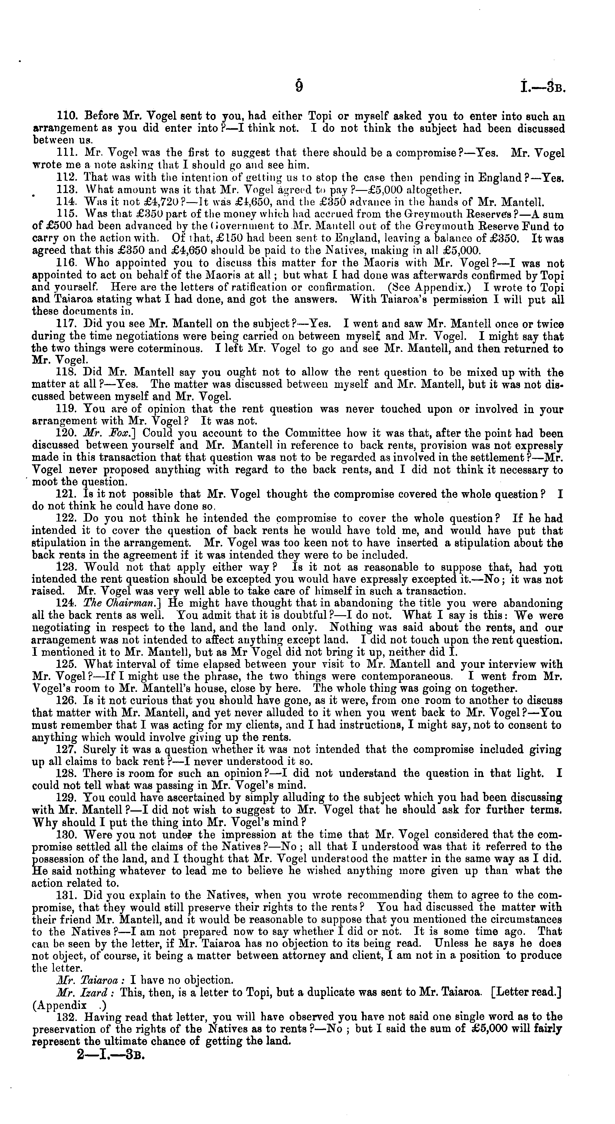 110. Before Mr. Vogel sent to you, had either Topi or myself asked you to enter into such au arrangement as you did enter into ?—I think not. Ido not think the subject had been discussed between us. 111. Mr. Vogel was the first to suggest that there should be a compromise?—Tes. Mr. Vogel ■wrote me a note asking that I should go and see him. 112. That was with the intention of getting us to stop the case then pending in England?—Tes. 113. What amount was it that Mr. Vogel agreed to pay ? —£5,000 altogether. 114. Was it not £4,720?— It was £1,(550, and the £350 advance in the hands of Mr. Mantell. 115. Was that £350 part of the money which had accrued from the Greytnouth Reserves ? —A sum of £500 had been advanced hy the (ioverninent to Mr. Mantell out of the G-reymoulh Reserve Fund to carry on the action with. Of that, £150 had been sent to England, leaving a balance of £350. It was agreed that this £350 and £4,650 should be paid to the Natives, making in all £5,000. 116. Who appointed you to discuss this matter for the Maoris with Mr. Vogel?—l was not appointed to act on behalf of the Maoris at all; but what I had done was afterwards confirmed by Topi and yourself. Here are the letters of ratification or confirmation. (See Appendix.) I wrote to Topi and Taiaroa stating what I had done, and got the answers. With Taiaroa's permission I will put all these documents in. 117. Did you see Mr. Mantell on the subject ?—Yes. I went and saw Mr. Mantell once or twice during the time negotiations were being carried on between myself and Mr. Vogel. I might say that the two things were coterminous. I left Mr. Vogel to go and see Mr. Mantell, and then returned to Mr. Vogel. 118. Did Mr. Mantell say you ought not to allow the rent question to be mixed up with the matter at all ? —Tes. The matter was discussed between myself and Mr. Mantell, but it was not discussed between myself and Mr. Vogel. 119. Tou are of opinion that the rent question was never touched upon or involved in your arrangement with Mr. Vogel ? It was not. 120. Mr. Fox.'] Could you account to the Committee how it was that, after the point had been discussed between yourself and Mr. Mantell in reference to back rents, provision was not expressly made in this transaction that that question was not to be regarded as involved in the settlement ?—Mr. Vogel never proposed anything with regard to the back rents, and I did not think it necessary to moot the question. 121. Is it not possible that Mr. Vogel thought the compromise covered the whole question ? I do not think he could have done so, 122. Do you not think he intended the compromise to cover the whole question ? If he had intended it to cover the question of back rents he would have told me, and would have put that stipulation in the arrangement. Mr. Vogel was too keen not to have inserted a stipulation about the back rents in the agreement if it was intended they were to be included. 123. Would not that apply either way ? Is it not as reasonable to suppose that, had you intended the rent question should be excepted you would have expressly excepted it.—No; it was not raised. Mr. Vogel was very well able to take care of himself in such a transaction. 124. The Chairman.] He might have thought that in abandoning the title you were abandoning all the back rents as well. Tou admit that it is doubtful ?—I do not. What I say is this: We were negotiating in respect to the land, and the land only. Nothing was said about the rents, and our arrangement was not intended to affect anything except land. I did not touch upon the rent question. I mentioned it to Mr. Mautell, but as Mr Vogel did not bring it up, neither did I. 125. What interval of time elapsed between your visit to Mr. Mantell and your interview with Mr. Vogel ? —lf I might use the phrase, the two things were contemporaneous. I went from Mr. Vogel's room to Mr. Mantell's house, close by here. The whole thing was going on together. 126. Is it not curious that you should have gone, as it were, from one room to another to discuss that matter with Mr. Mantell, and yet never alluded to it when you went back to Mr. Vogel ? —Tou must remember that I was acting for my clients, and I had instructions, I might say, not to consent to anything which would involve giving up the rents. 127. Surely it was a question whether it was not intended that the compromise included giving up all claims to back rent ? —I never understood it so. 128. There is room for such an opinion ? —I did not understand the question in that light. I could not tell what was passing in Mr. Vogel's mind. 129. Tou could have ascertained by simply alluding to the subject which you had been discussing with Mr. Mantell ?—I did not wish to suggest to Mr. Vogel that he should ask for further terms. Why should I put the thing into Mr. Vogel's mind ? 130. Were you not under the impression at the time that Mr. Vogel considered that the compromise settled all the claims of the Natives ? —No ; all that I understood was that it referred to the possession of the land, and I thought that Mr. Vogel understood the matter in the same way as I did. Ho said nothing whatever to lead me to believe he wished anything more given up than what the action related to. 131. Did you explain to the Natives, when you wrote recommending them to agree to the compromise, that they would still preserve their rights to the rents ? Tou had discussed the matter with their friend Mr. Mantell, and it would be reasonable to suppose that you mentioned the circumstances to the Natives ?—-I am not prepared now to say whether I did or not. It is some time ago. That can be seen by the letter, if Mr. Taiaroa has no objection to its being read. Unless he says he does not object, of course, it being a matter between attorney and client, I am not in a position to produce the letter. Mf. Taiaroa : I have no objection. Mr. Izard : This, then, is a letter to Topi, but a duplica