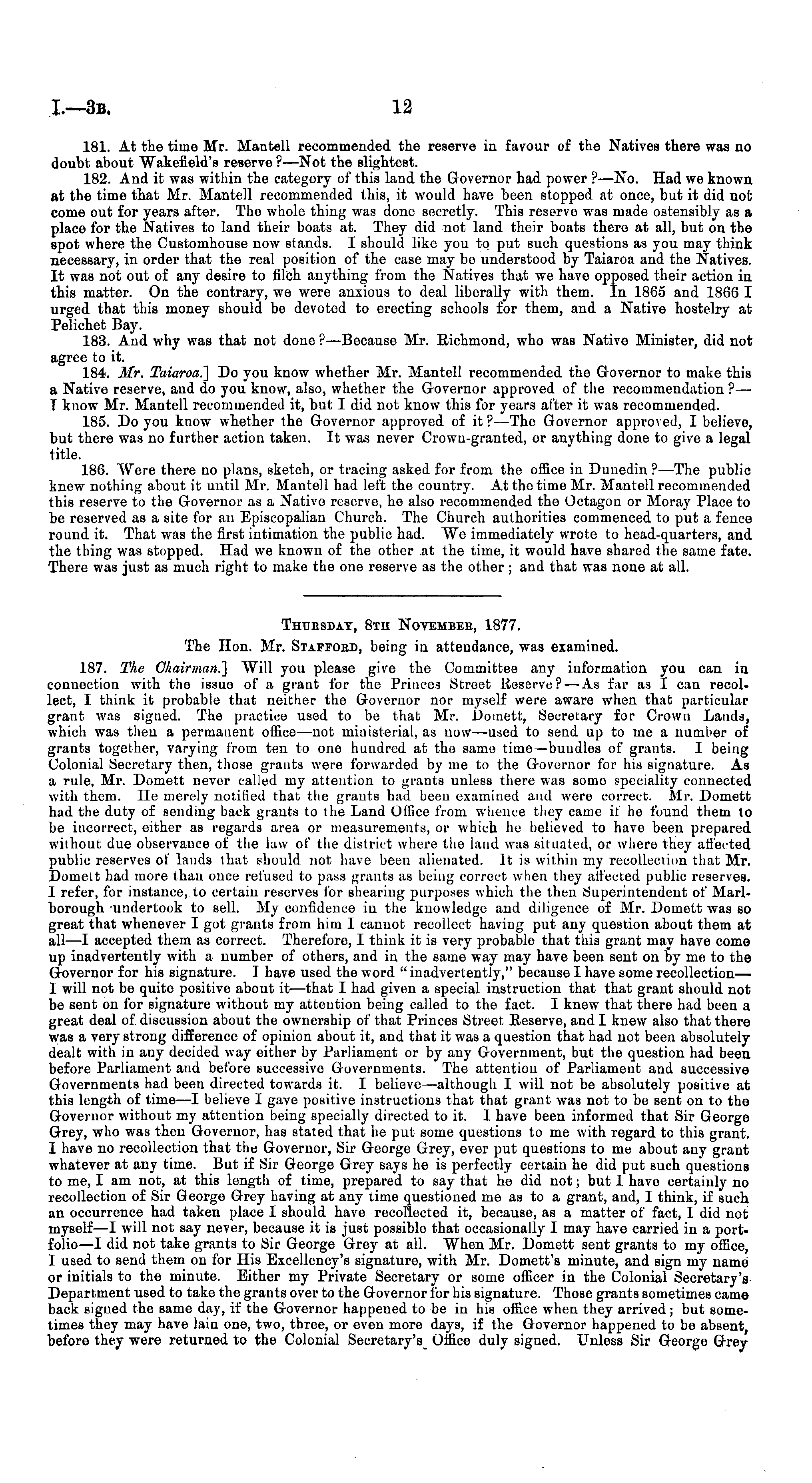 Thubsdat, Bth Noyehbee, 1877. The Hon. Mr. Staffobd, being iv attendance, was examined. 187. The Chairman.'] Will you please give the Committee any information you can in connection with the issue of a grant for the Princes Street Reserve? —As far as 1 can recollect, I think it probable that neither the G-overnor nor myself were aware when that particular grant was signed. The practice used to be that Mr. Domett, Secretary for Crown Lands, which was then a permanent office —not ministerial, as now —used to send up to me a number of grants together, varying from ten to one hundred at the same time—bundles of grants. I being Colonial Secretary then, those grants were forwarded by me to the Governor for his signature. As a rule, Mr. Domett never called my attention to grants unless there was some speciality connected with them. He merely notified that the grants had been examined and were correct. Mr. Domett had the duty of sending back grants to the Land Office from whence they came it' he found them to be incorrect, either as regards area or measurements, or which he believed to have been prepared without due observance of the law of the district where the land was situated, or where they affected public reserves of lands that should not have been alienated. It is within my recollection that Mr. Domeit had more than once refused to pass grants as being correct when they atfected public reserves. 1 refer, for instance, to certain reserves for shearing purposes which the then Superintendent of Marlborough -undertook to sell. My confidence iv the knowledge and diligence of Mr. Domett was so great that whenever I got grants from him I cannot recollect having put any question about them at all —I accepted them as correct. Therefore, I think it is very probable that this grant may have come up inadvertently with a number of others, and in the same way may have been sent on by me to the G-overnor for his signature. J have used the word " inadvertently," because I have some recollection— I will not be quite positive about it —that I had given a special instruction that that grant should not be Bent on for signature without my attention being called to the fact. I knew that there had been a great deal of discussion about the ownership of that Princes Street Keserve, and I knew also that there was a very strong difference of opinion about it, and that it was a question that had not been absolutely dealt with in any decided way either by Parliament or by any Government, but the question had been before Parliament and before successive Governments. The attention of Parliament and successive Governments had been directed towards it. I believe —although I will not be absolutely positive at this length of time —I believe I gave positive instructions that that grant was not to be sent on to the Governor without my attention being specially directed to it. 1 have been informed that Sir George Grey, who was then Governor, has stated that he put some questions to me with regard to this grant. 1 have no recollection that the Governor, Sir George Grey, ever put questions to me about any grant whatever at any time. But if Sir George Grey says he is perfectly certain he did put such questions to me, I am not, at this length of time, prepared to say that he did not; but 1 have certainly no recollection of Sir George Grey having at any time questioned me as to a grant, and, I think, if such an occurrence had taken place 1 should have recollected it, because, as a matter of fact, 1 did not myself —I will not say never, because it is just possible that occasionally I may have carried in a portfolio —I did not take grants to Sir George Grey at all. "When Mr. Domett sent grants to my office, I used to send them on for His Excellency's signature, with Mr. Domett's minute, and sign my name or initials to the minute. Either my Private Secretary or some officer in the Colonial Secretary's Department used to take the grants over to the Governor for his signature. Those grants sometimes came back signed the same day, if the Governor happened to be in his office when they arrived; but sometimes they may have laiu one, two, three, or even more days, if the Governor happened to be absent, before they were returned to the Colonial Secretary's Office duly signed. Unless Sir George Grey