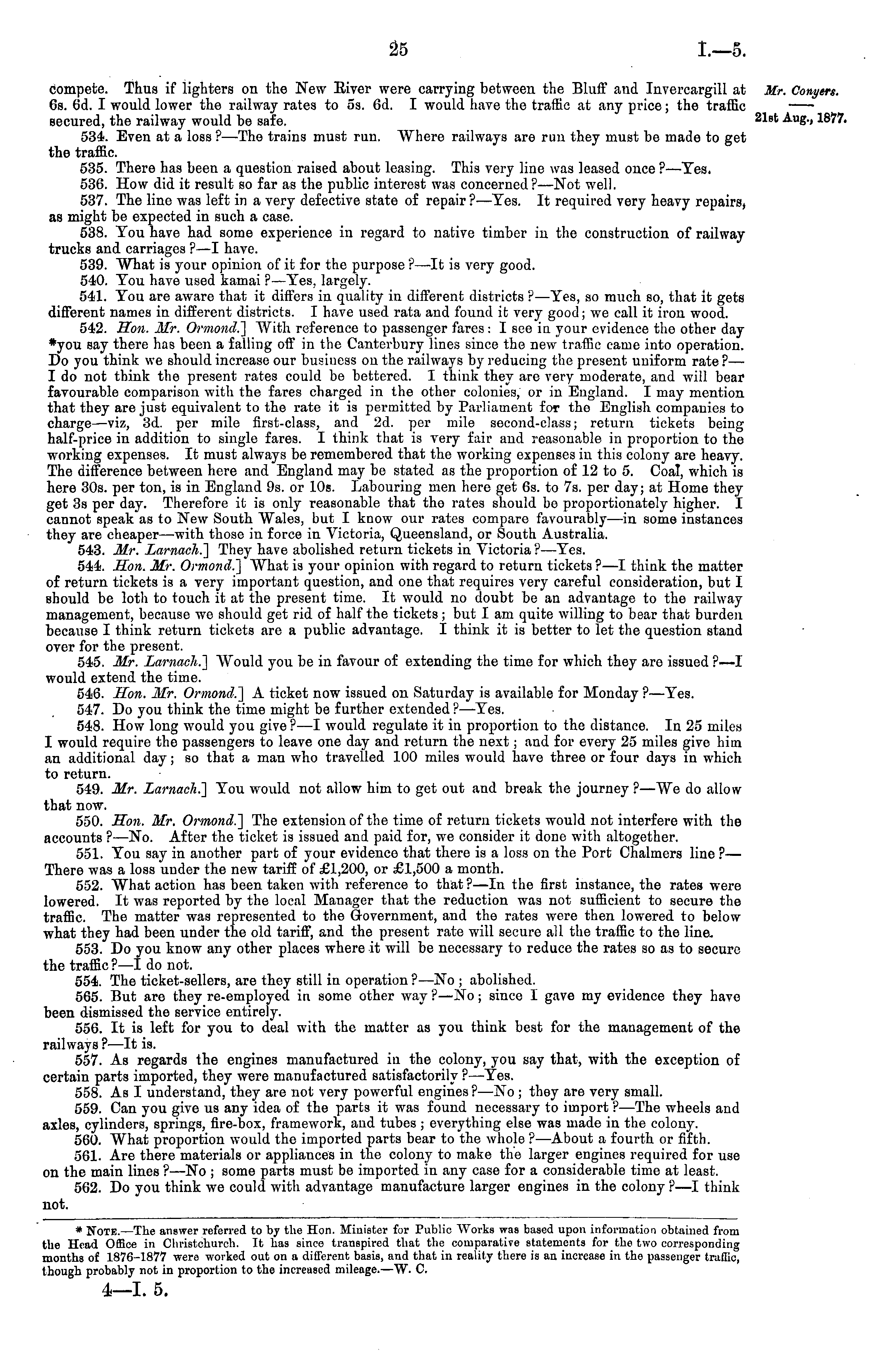compete. Thus if lighters on the New River were carrying between the Bluff and Invercargill at 6s. 6d. I would lower the railway rates to ss. 6d. I would have the traffic at any price; the traffic secured, the railway would be safe. 534. Even at a loss ?—The trains must run. Where railways are run they must be made to get the traffic. 535. There has been a question raised about leasing. This very lino was leased once ?—Yes. 536. How did it result so far as the public interest was concerned? —Not well. 537. The line was left in a very defective state of repair ? —Yes. It required very heavy repairs, as might be expected in such a case. 538. You have had some experience in regard to native timber in the construction of railway trucks and carriages ? —I have. 539. "What is your opinion of it for the purpose ?—lt is very good. 540. You have used kamai ? —Yes, largely. 541. You are aware that it differs in quality in different districts ?—Yes, so much so, that it gets different names in different districts. I have used rata and found it very good; we call it iron wood. 542. Hon. Mr. Ormoncl] "With reference to passenger fares : I see in your evidence the other day *you say there has been a falling off in the Canterbury lines since the new traffic came into operation. Do you think we should increase our business on the railways by reducing the present uniform rate ?— Ido not think the present rates could be bettered. I think they are very moderate, and will bear favourable comparison with the fares charged in the other colonies, or in England. I may mention that they are just equivalent to the rate it ia permitted by Parliament for the English companies to charge—viz, 3d. per mile first-class, and 2d. per mile second-class; return tickets being half-price in addition to single fares. I think that is very fair and reasonable in proportion to the working expenses. It must always be remembered that the working expenses in this colony are heavy. The difference between here and England may be stated as the proportion of 12 to 5. Coal, which is here 30s. per ton, is in England 9s. or 10s. Labouring men here get 6s. to 7s. per day; at Home they get 3s per day. Therefore it is only reasonable that the rates should be proportionately higher. I cannot speak as to New South Wales, but I know our rates compare favourably —in some instances they are cheaper —with those in force in Victoria, Queensland, or South Australia. 543. Mr. Larnach.~\ They have abolished return tickets in "Victoria? —Yes. 544. Hon. Mr. Ormond.] What is your opinion with regard to return tickets ?—I think the matter of return tickets is a very important question, and one that requires very careful consideration, but I should be loth to touch it at the present time. It would no doubt be an advantage to the railway management, because we should get rid of half the tickets; but lam quite willing to bear that burden because I think return tickets are a public advantage. I think it is better to let the question stand over for the present. 545. Mr. Larnach.] Would you be in favour of extending the time for which they are issued ?—1 would extend the time. 546. Hon. Mr. Ormoncl.'] A ticket now issued on Saturday is available for Monday ?—Yes. 547. Do you think the time might be further extended ? —Yes. 548. How long would you give ?—I would regulate it in proportion to the distance. In 25 miles I would require the passengers to leave one day and return the next; and for every 25 miles give him an additional day; so that a man who travelled 100 miles would have three or four days in which to return. 549. Mr. Larnach.'] You would not allow him to get out and break the journey ? —We do allow that now. 550. Hon. Mr. Ormond.~] The extension of the time of return tickets would not interfere with the accounts ?—No. After the ticket is issued and paid for, we consider it done with altogether. 551. You say in another part of your evidence that there is a loss on the Port Chalmers line ?— There was a loss under the new tariff of £1,200, or £1,500 a month. 552. What action has been taken with reference to that? —In the first instance, the rates were lowered. It was reported by the local Manager that the reduction was not sufficient to secure the traffic. The matter was represented to the Government, and the rates were then lowered to below what they had been under the old tariff, and the present rate will secure all the traffic to the line. 553. Do you know any other places where it will be necessary to reduce the rates so as to secure the traffic ? —I do not. 554. The ticket-sellers, are they still in operation ? —No ; abolished. 565. But are they re-employed in some other way ?—No; since I gave my evidence they have been dismissed the service entirely. 556. It is left for you to deal with the matter as you think best for the management of the railways ?—lt is. 557. As regards the engines manufactured in the colony, you say that, with the exception of certain parts imported, they were manufactured satisfactorily ? —Yes. 558. As I understand, they are not very powerful engines ? —No ; they are very small. 559. Can you give us any idea of the parts it was found necessary to import ? —The wheels and axles, cylinders, springs, fire-box, framework, and tubes ; everything else was made in the colony. 560. What proportion would the imported parts bear to the whole ? —About a fourth or fifth. 561. Are there materials or appliances in the colony to make the larger engines required for use on the main lines ?—No ; some parts must bo imported in any case for a considerable time at least. 562. Do you think we could with advantage manufacture larger engines in the colony?—I think not. * Note. —The answer referred to by the Hon. Minister for Public Works -was based upon information obtained from the Head Office in Christehurch. It has since transpired that the comparative statements for the two cor