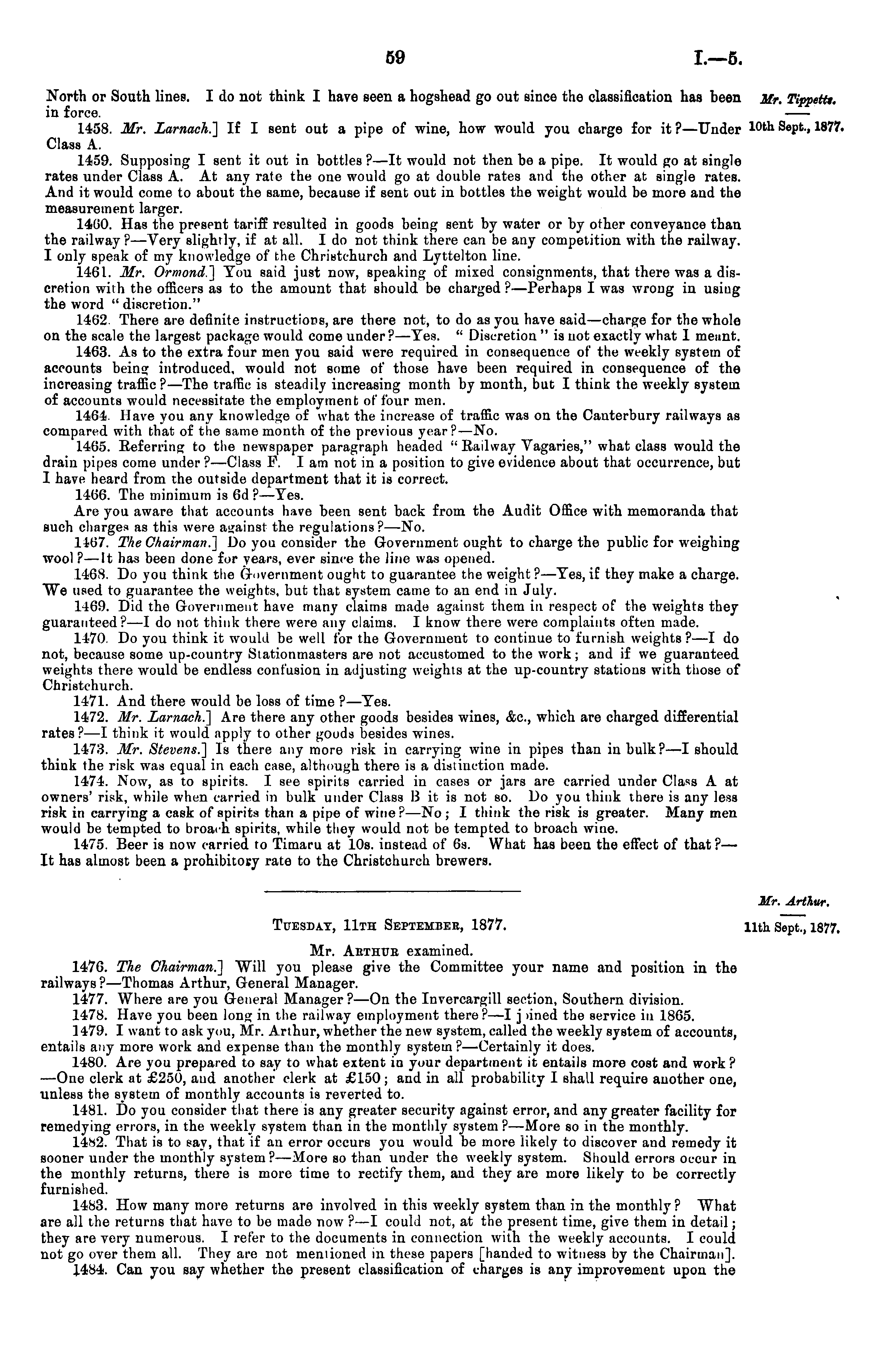 Tuesday, 11th September, 1877. Mr. Aethue examined. 1476. The Chairman.'] "Will you please give the Committee your name and position in the railways?— Thomas Arthur, General Manager. 1477. Where are you General Manager ? —On the Invercargill section, Southern division. 1478. Have you been ions in the railway employment there?—l j >ined the service in 1865. 1479. I want to ask you, Mr. Arthur, whether the new system, called the weekly system of accounts, entails any more work and expense than the monthly system ?—Certainly it does. 1480. Are you prepared to say to what extent in your department it entails more cost and work? —One clerk at £250, and another clerk at £150; and in all probability I shall require another one, unless the system of monthly accounts is reverted to. 1481. Do you consider that there is any greater security against error, and any greater facility for remedying errors, in the weekly system than in the monthly system ? —More so in the monthly. 14>>2. That is to say, that if an error occurs you would be more likely to discover and remedy it sooner under the monthly system? —More so than under the weekly system. Should errors occur in the monthly returns, there is more time to rectify them, aud they are more likely to be correctly furnished. 1483. How many more returns are involved in this weekly system than in the monthly? What are all the returns that have to be made now ?—I could not, at the present time, give them in detail; they are very numerous. I refer to the documents in connection with the weekly accounts. I could not go over them all. They are not mentioned in these papers [handed to witness by the Chairman]. 1484. Can you say whether the present classification of charges is any improvement upon the