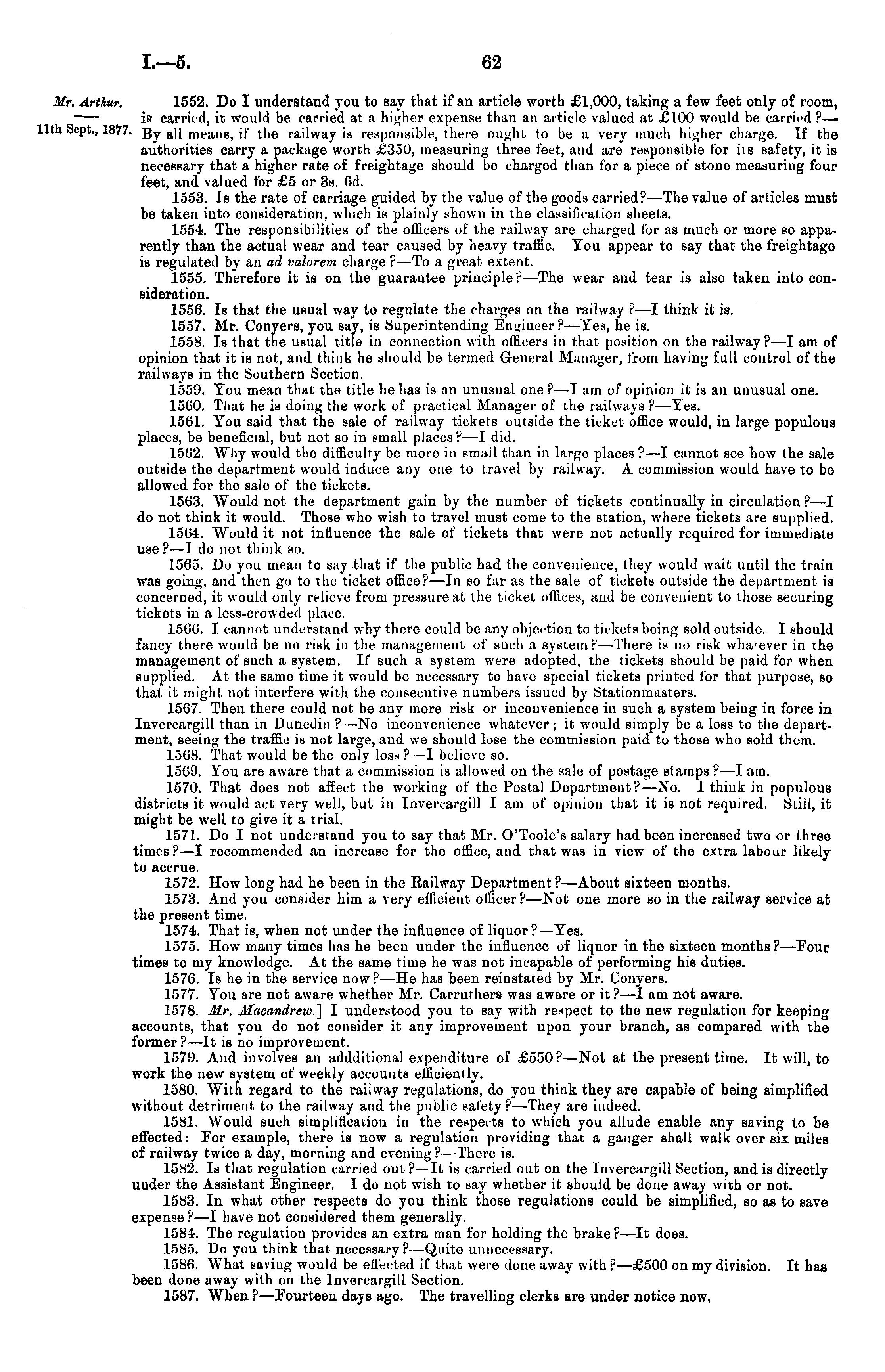 1552. Do 1 understand you to say that if an article worth £1,000, taking a few feet only of room, is carried, it would be carried at a higher expense than au article valued at £100 would be carried ?— •By all means, if the railway is responsible, there oujjht to be a very much higher charge. If the authorities carry a package worth £350, measuring three feet, and are responsible tor iis safety, it is necessary that a higher rate of freightage should be charged thau for a piece of stone measuring four feet, and valued for £5 or 3s. 6d. 1553. 1 s the rate of carriage guided by the value of the goods carried?— The value of articles must be taken into consideration, which is plainly shown in the classification sheets. 1554. The responsibilities of the officers of the railway arc charged for as much or more so apparently than the actual wear and tear caused by heavy traffic. You appear to say that the freightage is regulated by an ad valorem charge ?—To a great extent. 1555. Therefore it is on the guarantee principle? —The wear and tear is also taken into consideration. 1556. Is that the usual way to regulate the charges on the railway ?—I think it is. 1557. Mr. Conyers, you say, is Superintending Engineer?— Yes, he is. 1558. Is that the usual title in connection with officers in that position on the railway ?—I am of opinion that it is not, and think he should be termed General Manager, from having full control of the railways in the Southern Section. 1559. You mean that the title he has is an unusual one ? —I am of opinion it is an unusual one. 15U0. That he is doing the work of practical Manager of the railways ? —Yes. 1581. You said that the sale of railway tickets outside the ticket office would, in large populous places, be beneficial, but not so in small places? —I did. 1502. Why would the difficulty be more in smail than in largo places ?—I cannot see how ihe sale outside the department would induce any oue to travel by railway. A commission would have to be allowed for the sale of the tickets. 1563. Would not the department gain by the number of tickets continually in circulation ?—I do not think it would. Those who wish to travel must come to the station, where tickets are supplied. 1504. "Would it not influence the sale of tickets that were not actually required for immediate use? —I do not think so. 1565. Do you mean to say that if tlte public had the convenience, they would wait until the train was going, and then go to the ticket office? —In so far as the sale of tickets outside the department is concerned, it would only relieve from pressure at the ticket offices, and be convenient to those securing tickets in a less-crowded place. 1560. I cannot understand why there could be any objection to tickets being sold outside. I should fancy there would be no risk in the management of such a system? —There is no risk whatever in the management of such a system. If such a system were adopted, the tickets should be paid for when supplied. At the same time it would be necessary to have special tickets printed for that purpose, so that it might not interfere with the consecutive numbers issued by Statiouinasters. 1507. Then there could not be any more risk or inconvenience in such a system being in force in Invercargill than in Dunedin ? —No inconvenience whatever; it would simply be a loss to the department, seeing the traffic is not large, and we should lose the commission paid to those who sold them. 1568. That would be the only loss ? —I believe so. 1509. You are aware that a commission is allowed on the sale of postage stamps ?—I am. 1570. That does not affect the working of the Postal Department? —No. I thiuk in populous districts it would act very well, but in Invercargill I am of opinion that it is not required, still, it might be well to give it a trial. 1571. Do I not understand you to say that Mr. O'Toole's salary had been increased two or three times?—l recommended an increase for the office, and that was in view of the extra labour likely to accrue. 1572. How long had he been in the Railway Department? —About sixteen months. 1573. And you consider him a very efficient officer? —Not one more so in the railway sei'vice at the present time. 1574. That is, when not under the influence of liquor?— Yes. 1575. How many times has he been uuder the influence of liquor in the sixteen months ?—Four times to my knowledge. At the same time he was not incapable of performing his duties. 1576. Is he in the service now? —He has been reinstated by Mr. Conyers. 1577. You are not aware whether Mr. Carrurhers was aware or it? —I am not aware. 1578. Mr. Macandrew] I understood you to say with respect to the new regulation for keeping accounts, that you do not consider it any improvement upon your branch, as compared with the former ?—lt is no improvement. 1579. And involves an addditional expenditure of £550?— Not at the present time. It will, to work the new system of weekly accounts efficiently. 1580. With regard to th 6 railway regulations, do you think they are capable of being simplified without detriment to the railway and the public safety?— They are indeed. 1581. Would such simplification iv the respects to which you allude enable any saving to be effected: For example, there is now a regulation providing that a ganger shall walk over six miles of railway twice a day, morning and evening?— There is. 1582. Is that regulation carried out? —It is carried out on the Invercargill Section, and is directly under the Assistant Engineer. Ido not wish to say whether it should be done away with or not. 1583. In what other respects do you think those regulations could be simplified, so as to save expense ?—I have not considered them generally. 1584. The regulation provides an extra man for holding the brake?—lt does. 1585. Do you think that necessary?— Quite unnecessary. 1586. What saving would be effected if that were dove aw