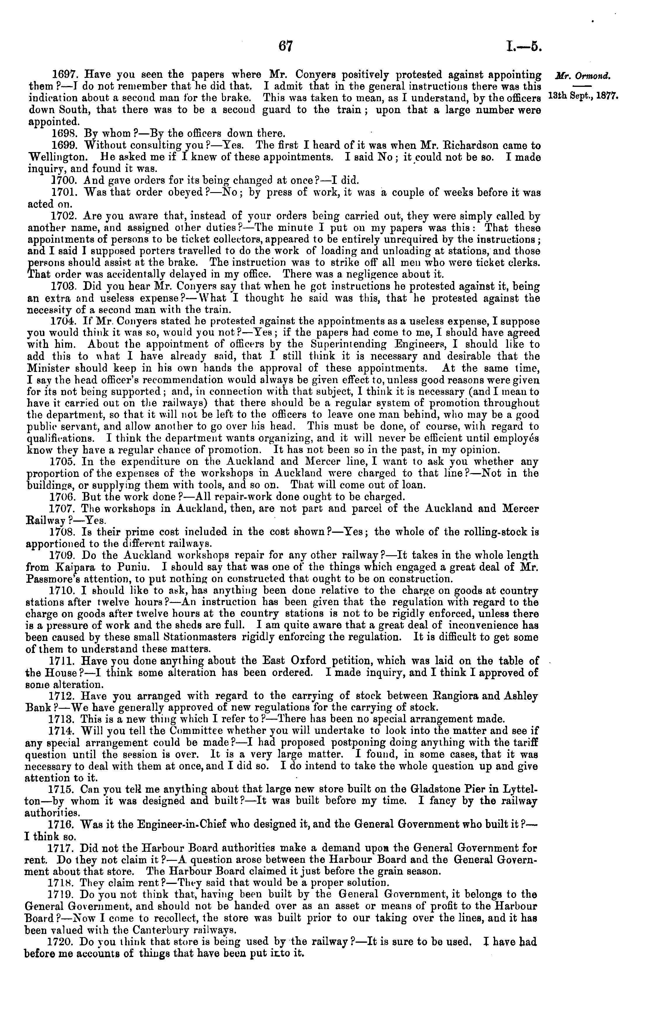1697. Have you seen the papers where Mr. Conyers positively protested against appointing them ? —I do not remember that he did that. I admit that in the general instructions there was this indication about a second man tor the brake. This was taken to mean, as I understand, by the officers down South, that there was to be a second guard to the train ; upon that a large number were appointed. 1695. By whom ?—By the officers down there. 1699. Without consulting you? —Tes. The first I heard of it was when Mr. Eichardson came to Wellington. He asked me if I knew of these appointments. I said No ;it could not be so. I made inquiry, and found it was. 1700. And gave orders for its being changed at once? —I did. 1701. Was that order obeyed? —No; by press of work, it was a couple of weeks before it was acted on. 1702. Are you aware that, instead of your orders being carried out, they were simply called by another name, and assigned oiher duties? —The minute I put on my papers was this: That these appointments of persons to be ticket collectors, appeared to be entirely unrequired by the instructions; and I said I supposed porters travelled to do the work of loading and unloading at stations, and those persons should assist at the brake. The instruction was to strike off all men who were ticket clerks. That order was accidentally delayed in my office. There was a negligence about it. 1703. Did you hear Mr. Conyers say that when he got instructions he protested against it, being an extra and useless expense?— What I thought he said was this, that he protested against the necessity of a second man with the train. 1704. If Mr Conyers stated he protested ngainst the appointments as a useless expense, I suppose you would think it was so, would you not? —Tes ; if the papers had come to me, I should have agreed with him. About the appointment of officers by the Superintending Engineers, I should like to add this to what 1 have already s.-iid, that I still think it is necessary and desirable that the Minister should keep in his own hands tlie approval of these appointments. At the same time, I say the head officer's recommendation would always be given effect to, unless good reasons were given for its not being supported ; and, in connection with that subject, I think it is necessary (and I mean to have it carried out on the railways) that there should be a regular system of promotion throughout the department, so that it will not be left to the officers to leave one man behind, who may be a good public servant, and allow another to go over his head. This must be done, of course, with regard to qualifications. I think the department wants organizing, and it will never be efficient until employes know they have a regular chance of promotion. It has not been so in the past, in my opinion. 1705. In the expenditure on the Auckland and Mercer line, I want to ask you whether any proportion of the expenses of the workshops in Auckland were charged to that line? —Not in the buildings, or supplying them with tools, and so on. That will come out of loan. 1706. But the work done ? —All repair-work done ought to be charged. 1707. The workshops in Auckland, then, are not part and parcel of the Auckland and Mercer Eaihvay ?—Tes. 1708. Is their prime cost included in the cost shown?—Tes; the whole of the rolling-stock is apportioned to the different railways. 1709. Do the Auckland workshops repair for any other railway? —It takes in the whole length from Kaipara to Puniu. I should say that was one of the things which engaged a great deal of Mr. Passmore's attention, to put nothing on constructed that ought to be on construction. 1710. I should like to ask, has anything been done relative to the charge on goods at country stations after twelve hours? —An instruction has been given that the regulation with regard to the charge on goods after twelve hours at the country stations is not to be rigidly enforced, unless there is a pressure of work and the sheds are full. lam quite aware that a great deal of inconvenience has been caused by these small Stationmasters rigidly enforcing the regulation. It is difficult to get some of them to understand these matters. 1711. Have you done anything about the East Oxford petition, which was laid on the table of the House ? —I think some alteration has been ordered. I made inquiry, and I think I approved of some alteration. 1712. Have you arranged with regard to the carrying of stock between Eangiora and Ashley Bank? —We have generally approved of new regulations for the carrying of stock. 1713. This is a new thing which I refer to?— There has been no special arrangement made. 1714. Will you tell the Committee whether you will undertake to look into the matter and see if any special arrangement could be made ? —I had proposed postponing doing anything with the tariff question until the session is over. It is a very large matter. I found, in some cases, that it was necessary to deal with them at once, and I did so. Ido intend to take the whole question up and give attention to it. 1715. Can you tell me anything about that large new store built on the Gladstone Pier in Lyttelton —by whom it was designed and built ? —lt was built before my time. I fancy by the railway authorities. 1716. Was it the Engineer-in-Chief who designed it, and the General Government who built it ?— I think so. 1717. Did not the Harbour Board authorities make a demand upon the General Government for rent. Do they not claim it ?—A question arose between the Harbour Board and the General Government about that store. The Harbour Board claimed it just before the grain season. 1718. They claim rent?— They s;iid that would be a proper solution. 1719. Do you not think that, having been built by the General Government, it belongs to the General Government, and should not be handed over as an asset or means of profit to the Harbour Board? —Now I crime to recollect, the store w