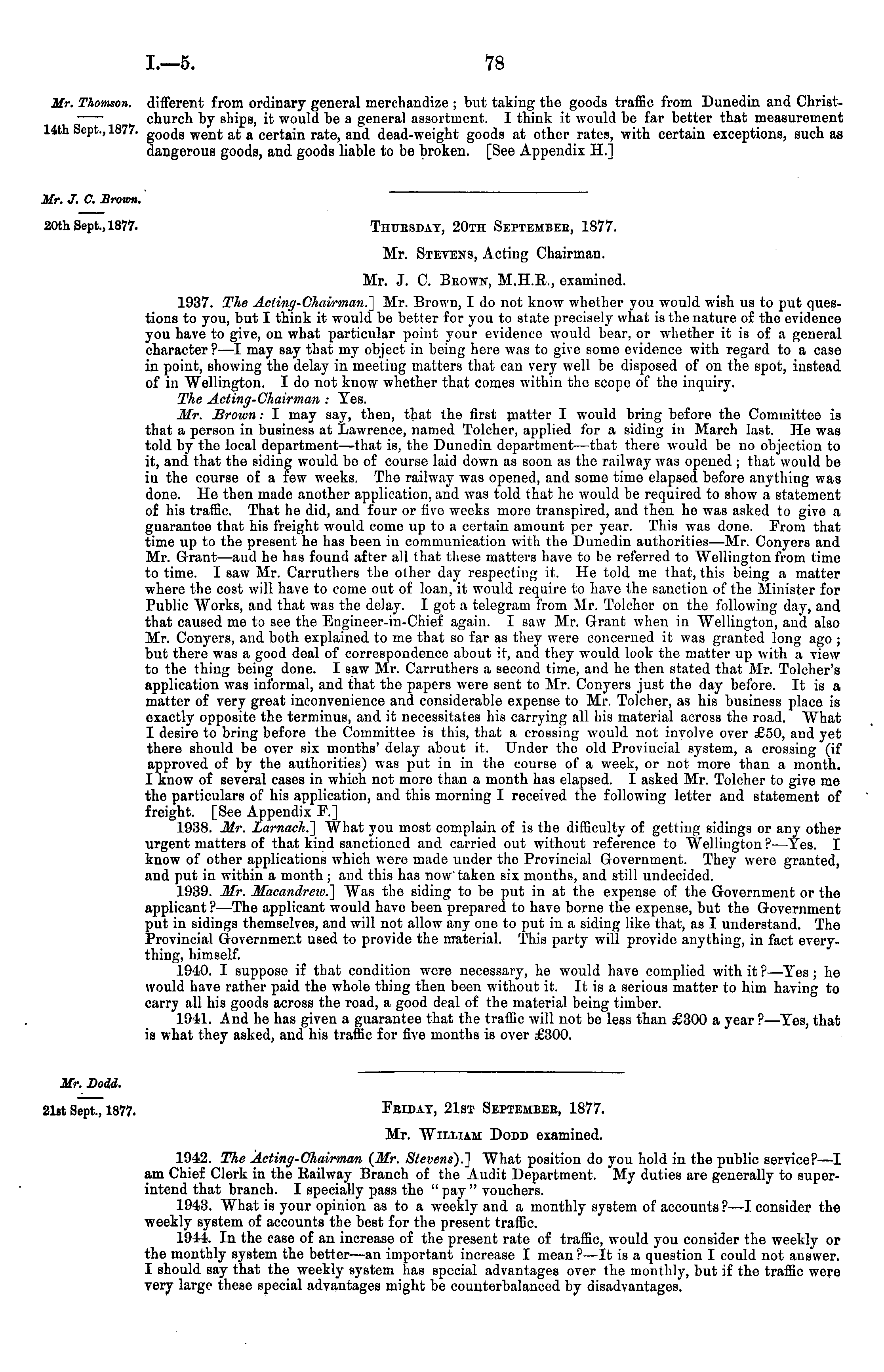 TnuESDAT, 20th Septembee, 1877. Mr. Stevens, Acting Chairman. Mr. J. C. Beown, M.H.E., examined. 1937. The Acting-Chairman.] Mr. Brown, I do not know whether you would wish us to put questions to you, but I think it would be better for you to state precisely what is the nature of the evidence you have to give, on what particular point your evidence would bear, or whether it is of a general character ? —I may say that my object in being here was to give some evidence with regard to a case in point, showing the delay in meeting matters that can very well be disposed of on the spot, instead of in Wellington. Ido not know whether that comes within the scope of the inquiry. The Acting-Chairman : Yes. Mr. JBroivn: I may say, then, that the first matter I would bring before the Committee is that a person in business at Lawrence, named Tolcher, applied for a siding in March last. He was told by the local department—that is, the Dunedin department —that there would be no objection to it, and that the siding would be of course laid down as soon as the railway was opened ; that would be in the course of a few weeks. The railway was opened, and some time elapsed before anything was done. He then made another application, and was told that he would be required to show a statement of his traffic. That he did, and four or five weeks more transpired, and then he was asked to give a guarantee that his freight would come up to a certain amount per year. This was done. From that time up to the present he has been in communication with the Dunedin authorities—Mr. Conyers and Mr. Grant—and ho has found after all that these matters have to bo referred to Wellington from time to time. I saw Mr. Carruthers the other day respecting it. He told me that, this being a matter where the cost will have to come out of loan, it would require to have the sanction of the Minister for Public Works, and that was the delay. I got a telegram from Mr. Tolcher on the following day, and that caused me to see the Engineer-in-Chief again. I saw Mr. Grant when in Wellington, and also Mr. Conyers, and both explained to me that so far as they were concerned it was granted long ago ; but there was a good deal of correspondence about it, and they would look the matter up with a view to the thing being done. I saw Mr. Carruthers a second time, and he then stated that Mr. Tolcher's application was informal, and that the papers were sent to Mr. Conyers just the day before. It is a matter of very great inconvenience and considerable expense to Mr. Tolcher, as his business place is exactly opposite the terminus, and it necessitates his carrying all his material across the road. What I desire to bring before the Committee is this, that a crossing would not involve over £50, and yet there should be over six months' delay about it. Under the old Provincial system, a crossing (if approved of by the authorities) was put in in the course of a week, or not more than a month. I know of several cases in which not more than a month has elapsed. I asked Mr. Tolcher to give mo the particulars of his application, and this morning I received the following letter and statement of freight. [See Appendix F.] 1938. Mr. Larnach.~\ What you most complain of is the difficulty of getting sidings or any other urgent matters of that kind sanctioned and carried out without reference to Wellington ? —Yes. I know of other applications which were made under the Provincial Government. They were granted, and put in within a month; and this has now taken six months, and still undecided. 1939. Mr. Macandrew.~\ Was the siding to be put in at the expense of the Government or the applicant ?—The applicant would have been prepared to have borne the expense, but the Government put in sidings themselves, and will not allow any one to put in a siding like that, as I understand. The Provincial Government used to provide the material. This party will provide anything, in fact everything, himself. 1940. I suppose if that condition were necessary, he would have complied with it ?—Yes; he would have rather paid the whole thing then been without it. It is a serious matter to him having to carry all his goods across the road, a good deal of the material being timber. 1941. And he has given a guarantee that the traffic will not be less than £300 a year ?—Yes, that is what they asked, and his traffic for five months is over £300.