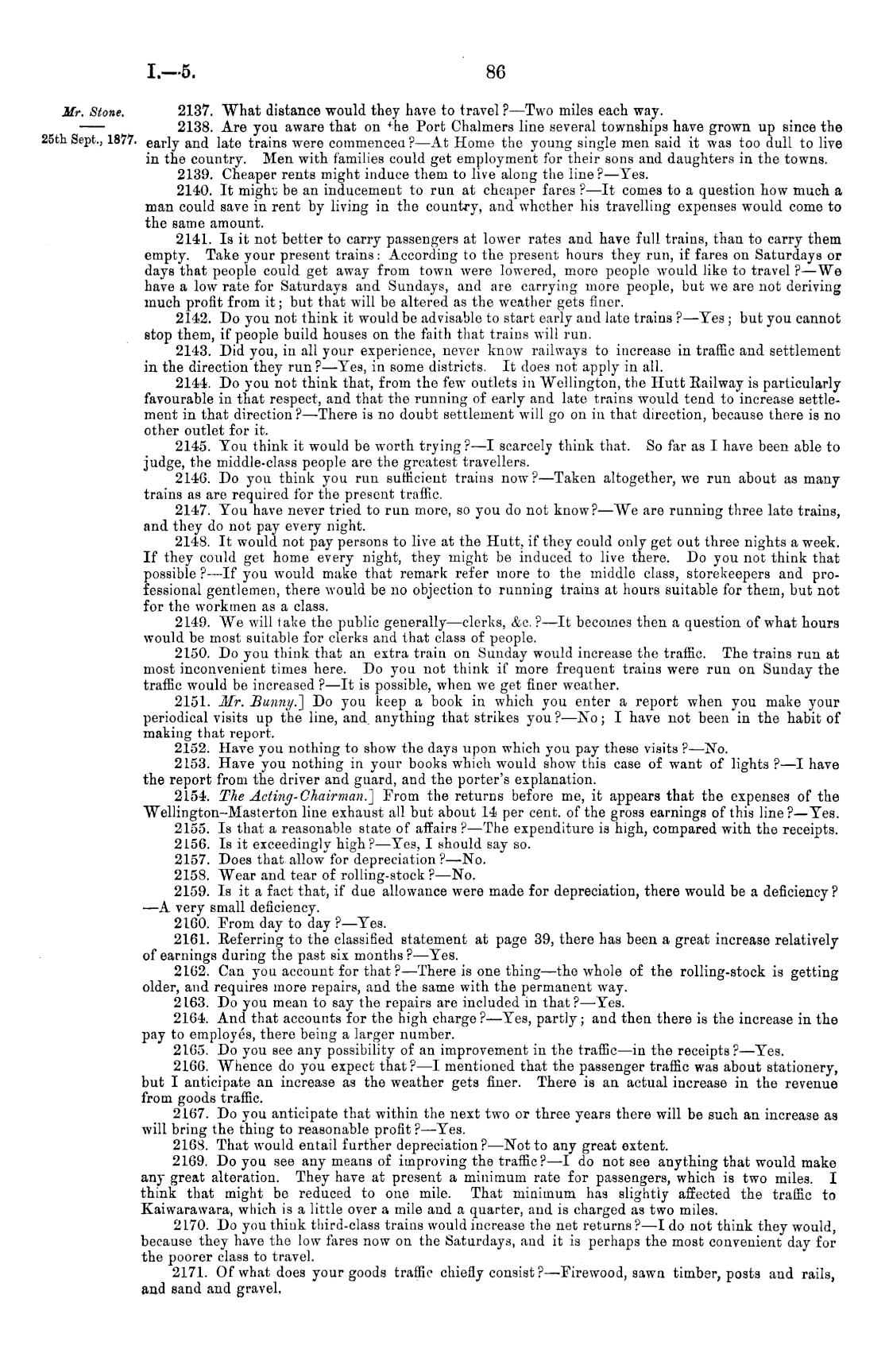 2137. What distance would they have to travel ? —Two miles each way. 2138. Are you aware that ou +he Port Chalmers line several townships have grown up since the early and late trains were commenced ? —At Home the young single men said it was too dull to live in the country. Men with families could get employment for their sons and daughters in the towns. 2139. Cheaper rents might induce them to live along the line?— Yes. 2140. It might be an inducement to run at cheaper fares ?—lt comes to a question how much a man could save in rent by living in the country, and whether his travelling expenses would come to the same amount. 2141. Is it not better to carry passengers at lower rates and have full trains, than to carry them empty. Take your present trains: According to the present hours they run, if fares on Saturdays or days that people could get away from town were lowered, more people would like to travel ?—We have a low rate for Saturdays and Sundays, and are carrying more people, but we are not deriving much profit from it; but that will be altered as the weather gets finer. 2142. Do you not think it would be advisable to start early and late trains ? —Tes; but you cannot stop them, if people build houses on the faith that trains will run. 2143. Did you, in all your experience, never know railways to increase in traffic and settlement in the direction they run ?—Yes, in some districts. It does not apply in all. 214-1. Do you not think that, from the few outlets in Wellington, the Hutt Railway is particularly favourable in that respect, and that the running of early and late trains would tend to increase settlement in that direction ? —There is no doubt settlement will go on in that direction, because there is no other outlet for it. 2145. You think it would be worth trying ?—I scarcely think that. So far as I have been able to judge, the middle-class people are the greatest travellers. 2146. Do you think you run sufficient trains now? —Taken altogether, we run about as many trains as are required for the present traffic. 2147. You have never tried to run more, so you do not know?—We are running three late trains, and they do not pay every night. 2148. It would not pay persons to live at the Hutt, if they could only get out three nights a week. If they could get home every night, they might be induced to live there. Do you not think that possible ? —lf you would make that remark refer more to the middle class, storekeepers and professional gentlemen, there would be no objection to running trains at hours suitable for them, but not for the workmen as a class. 2149. We will lake the public generally —clerks, &c. ? —lt becomes then a question of what hours would be most suitable for clerks and that class of people. 2150. Do you think that an extra train on Sunday would increase the traffic. The trains run at most inconvenient times here. Do you not think if more frequent trains were run on Sunday the traffic would be increased ? —lt is possible, when we get finer weather. 2151. Mr. Bunny.~\ Do you keep a book in which you enter a report when you make your periodical visits up the line, and. anything that strikes you? —No; I have not been in the habit of making that report. 2152. Have you nothing to show the days upon which you pay these visits ?—No. 2153. Have you nothing in your books which would show this case of want of lights ?—I have the report from the driver and guard, and the porter's explanation. 2L54. The Acting-Chairman.] From the returns before me, it appears that the expenses of the Wellington-Masterton line exhaust all but about 14 per cent, of the gross earnings of this line ?—Yes. 2155. Is that a reasonable state of affairs ? —The expenditure is high, compared with the receipts. 2156. Is it exceedingly high?— Yes, I should say so. 2157. Does that allow for depreciation ?—No. 2158. Wear and tear of rolling-stock ? —No. 2159. Is it a fact that, if due allowance were made for depreciation, there would be a deficiency ? —A very small deficiency. 21G0. From day to day ?—Yes. 2161. Referring to the classified statement at page 39, there has been a great increase relatively of earnings during the past six months ? —Yes. 2162. Can you account for that? —There is one thing —the whole of the rolling-stock is getting older, and requires more repairs, and the same with the permanent way. 2163. Do you mean to say the repairs are included in that? —Yes. 2164. And that accounts for the high charge ?—Yes, partly; and then there is the increase in the pay to employes, there being a larger number. 2165. Do you see any possibility of an improvement in the traffic—in the receipts?— Yes. 2166. AVhence do you expect that? —I mentioned that the passenger traffic was about stationery, but I anticipate an increase as the weather gets finer. There is an actual increase in the revenue from goods traffic. 2167. Do you anticipate that within the next two or three years there will be such an increase as will bring the thing to reasonable profit ? —Yes. 2168. That would entail further depreciation ? —Not to any great extent. 2169. Do you see any means of improving the traffic? —I do not see anything that would make any great alteration. They have at present a minimum rate for passengers, which is two miles. I think that might be reduced to one mile. That minimum has slightly affected the traffic to Kaiwarawara, which is a little over a mile and a quarter, and is charged as two miles. 2170. Do you think third-class trains would increase the net returns?—l do not think they would, because they have the low fares now ou the Saturdays, and it is perhaps the most convenient day for the poorer class to travel. 2171. Of what does your goods traffic chiefly consist ?—Firewood, sawn timber, posts and rails, and sand and gravel,