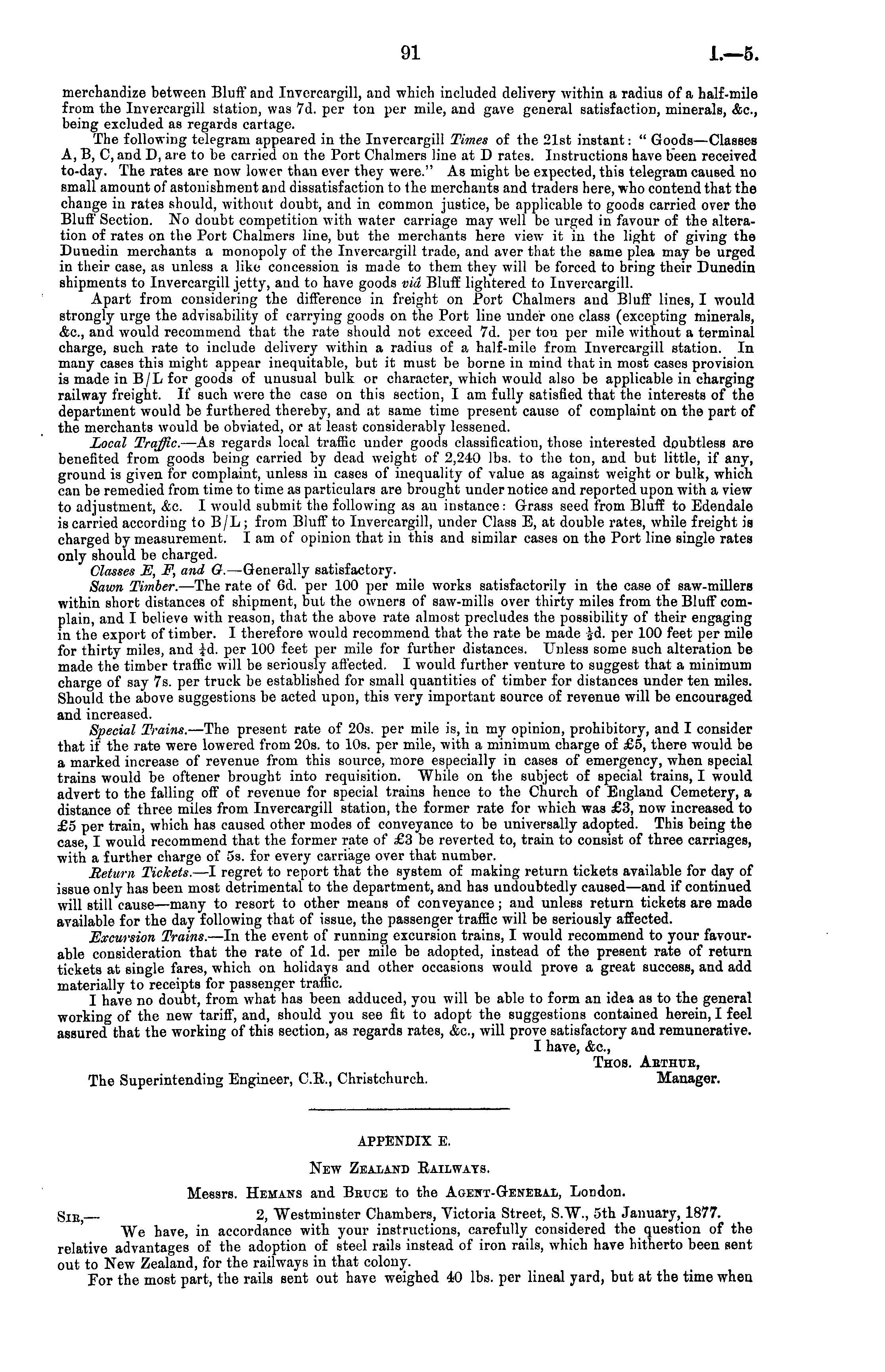 APPENDIX E. New Zealand Eailwats. Messrs. Hemans and Betjce to the Agent-Geneeai, London. g IE) 2, "Westminster Chambers, Victoria Street, S.W., sth January, 1877. We have, in accordance with your instructions, carefully considered the question of the relative advantages of the adoption of steel rails instead of iron rails, which have hitherto been sent out to New Zealand, for the railways in that colony. For the most part, the rails sent out have weighed 40 lbs. per lineal yard, but at the time when