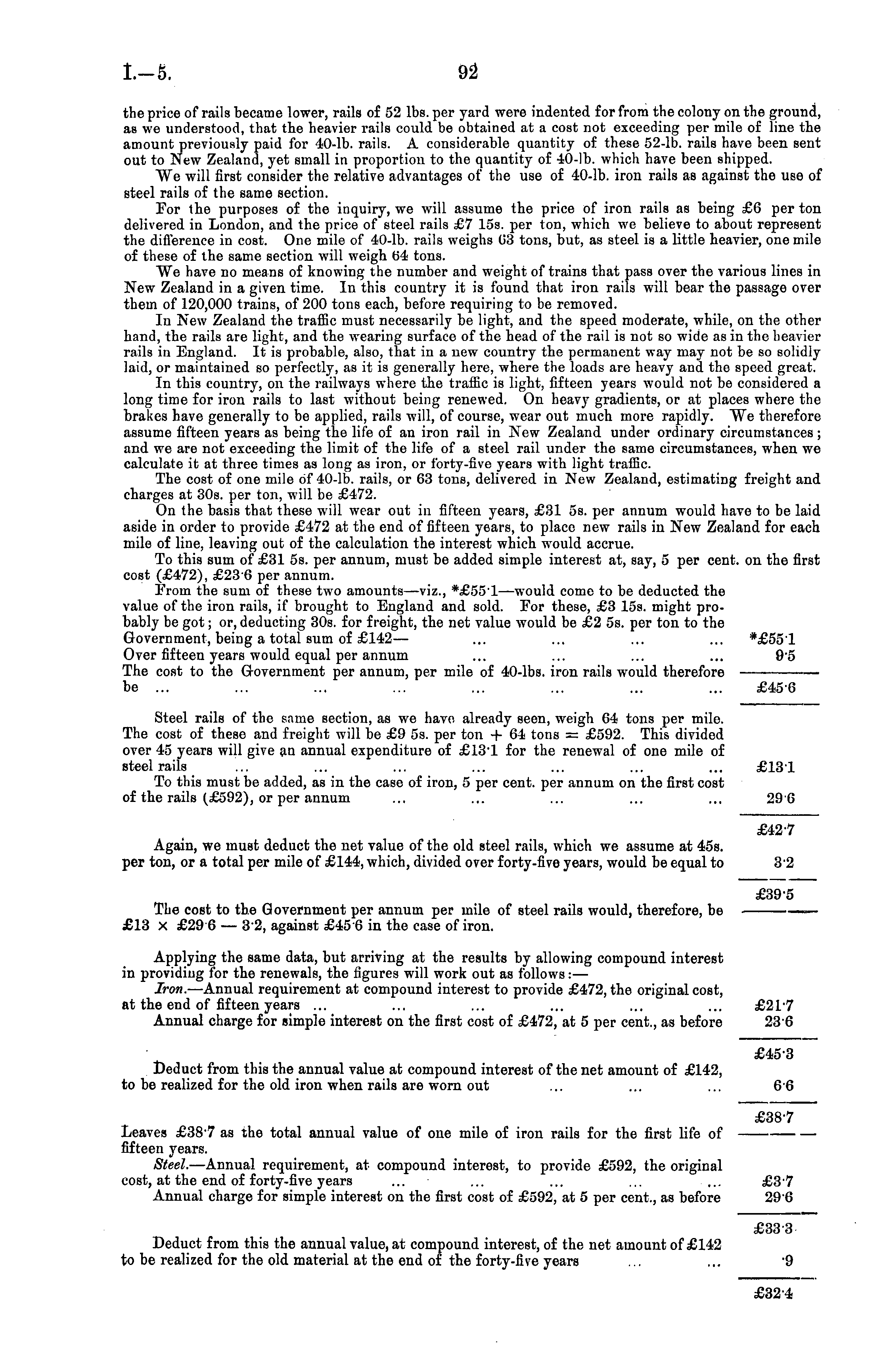 the price of rails became lower, rails of 52 lbs. per yard were indented for from the colony on the ground, as we understood, that the heavier rails could be obtained at a cost not exceeding per mile of line the amount previously paid for 40-lb. rails. A considerable quantity of these 52-lb. rails have been sent out to New Zealand, yet small in proportion to the quantity of -iO-lb. which have been shipped. "We will first consider the relative advantages of the use of 40-lb. iron rails as against the use of steel rails of the same section. For the purposes of the inquiry, we will assume the price of iron rails as being £6 per ton delivered in London, and the price of steel rails £7 15s. per ton, which we believe to about represent the difference in cost. One mile of 40-lb. rails weighs 03 tons, but, as steel is a little heavier, one mile of these of the same section will weigh 64 tons. We have no means of knowing the number and weight of trains that pass over the various lines in New Zealand in a given time. In this country it is found that iron rails will bear the passage over them of 120,000 trains, of 200 tons each, before requiring to be removed. In New Zealand the traffic must necessarily be light, and the speed moderate, while, on the other hand, the rails are light, and the wearing surface of the bead of the rail is not so wide as in the heavier rails in England. It is probable, also, that in a new country the permanent way may not be so solidly laid, or maintained so perfectly, as it is generally here, where the loads are heavy and the speed great. In this country, on the railways where the traffic is light, fifteen years would not be considered a long time for iron rails to last without being renewed. On heavy gradients, or at places where the brakes have generally to be applied, rails will, of course, wear out much more rapidly. "We therefore assume fifteen years as being the life of an iron rail in New Zealand under ordinary circumstances; and we are not exceeding the limit of the life of a steel rail under the same circumstances, when we calculate it at three times as long as iron, or forty-five years with light traffic. The cost of one mile of 40-lb. rails, or 63 tons, delivered in New Zealand, estimating freight and charges at 30s. per ton, will be £472. On the basis that these will wear out in fifteen years, £31 ss. per annum would have to be laid aside in order to provide £472 at the end of fifteen years, to place new rails in New Zealand for each mile of line, leaving out of the calculation the interest which, would accrue. To this sum of £31 ss. per annum, must be added simple interest at, say, 5 per cent, on the first cost (£472), £236 per annum. From the sum of these two amounts—viz., *£55'1 —would come to be deducted the value of the iron rails, if brought to England and sold. For these, £3 15s. might probably be got; or, deducting 30s. for freight, the net value would be £2 ss. per ton to the Government, being a total sum of £142— ... ... ... ... *£551 Over fifteen years would equal per annum ... ... ... ... 9"5 The cost to the Government per annum, per mile of 40-lbs. iron rails would therefore be ... ... ... * ... ... ... ... ... £45-6 Steel rails of the same section, as we have already seen, weigh 64 tons per mile. The cost of these and freight will be £9 ss. per ton +64 tons s= £592. This divided over 45 years will give an annual expenditure of £13"1 for the renewal of one mile of steel rails ... ... ... ... ... ... ... £131 To this must be added, as in the case of iron, 5 per cent, per annum on the first cost of the rails (£592), or per annum ... ... ... ... ... 296 £427 Again, we must deduct the net value of the old steel rails, which we assume at 455. per ton, or a total per mile of £144, which, divided over forty-five years, would be equal to 32 £39-5 The cost to the Government per annum per mile of steel rails would, therefore, be — £13 x £29 6 — 32, against £456 in the case of iron. Applying the same data, but arriving at the results by allowing compound interest in providing for the renewals, the figures will work out as follows: — Iron. —Annual requirement at compound interest to provide £472, the original cost, at the end of fifteen years ... ... ... ... ... ... £217 Annual charge for simple interest on the first cost of £472, at 5 per cent., as before 236 £453 Deduct from this the annual value at compound interest of the net amount of £142, to be realized for the old iron when rails are worn out ... ... 66 £38-7 Leaves £387 as the total annual value of one mile of iron rails for the first life of fifteen years. Steel. —Annual requirement, at compound interest, to provide £592, the original cost, at the end of forty-five years ... ... ... ... ... £37 Annual charge for simple interest on the first cost of £592, at 5 per cent., as before 296 £333 Deduct from this the annual value, at compound interest, of the net amount of £142 to be realized for the old material at the end of the forty-five years ... ... '9 £324
