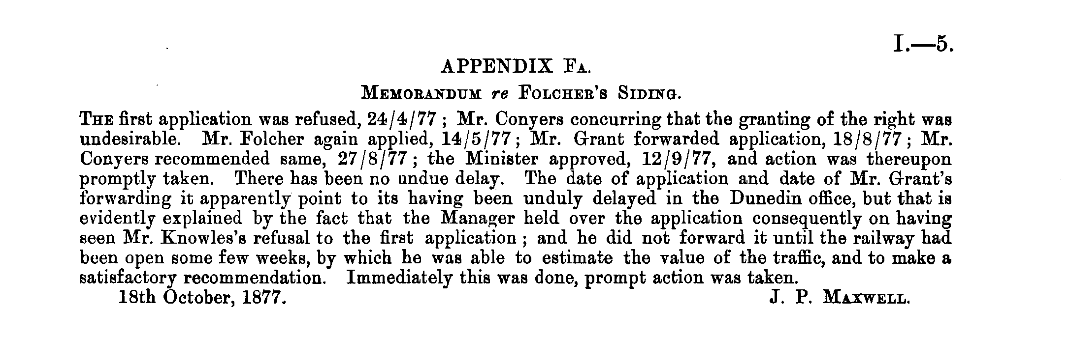 APPENDIX Fa. Memorandum re Folchee's Siding. The first application was refused, 24/4/77 ; Mr. Conyers concurring that the granting of the right was undesirable. Mr. Folcher again applied, 14/5/77; Mr. Grant forwarded application, 18/8/77; Mr. Conyers recommended same, 27/8/77 ; the Minister approved, 12/9/77, and action was thereupon promptly taken. There has been no undue delay. The date of application and date of Mr. Grant's forwarding it apparently point to its having been unduly delayed in the Dunedin office, but that is evidently explained by the fact that the Manager held over the application consequently on having seen Mr. Knowles's refusal to the first application ; and he did not forward it until the railway had been open some few weeks, by which he was able to estimate the value of the traffic, and to make a satisfactory recommendation. Immediately this was done, prompt action was taken. 18th October, 1877. J. P. Maxwell.