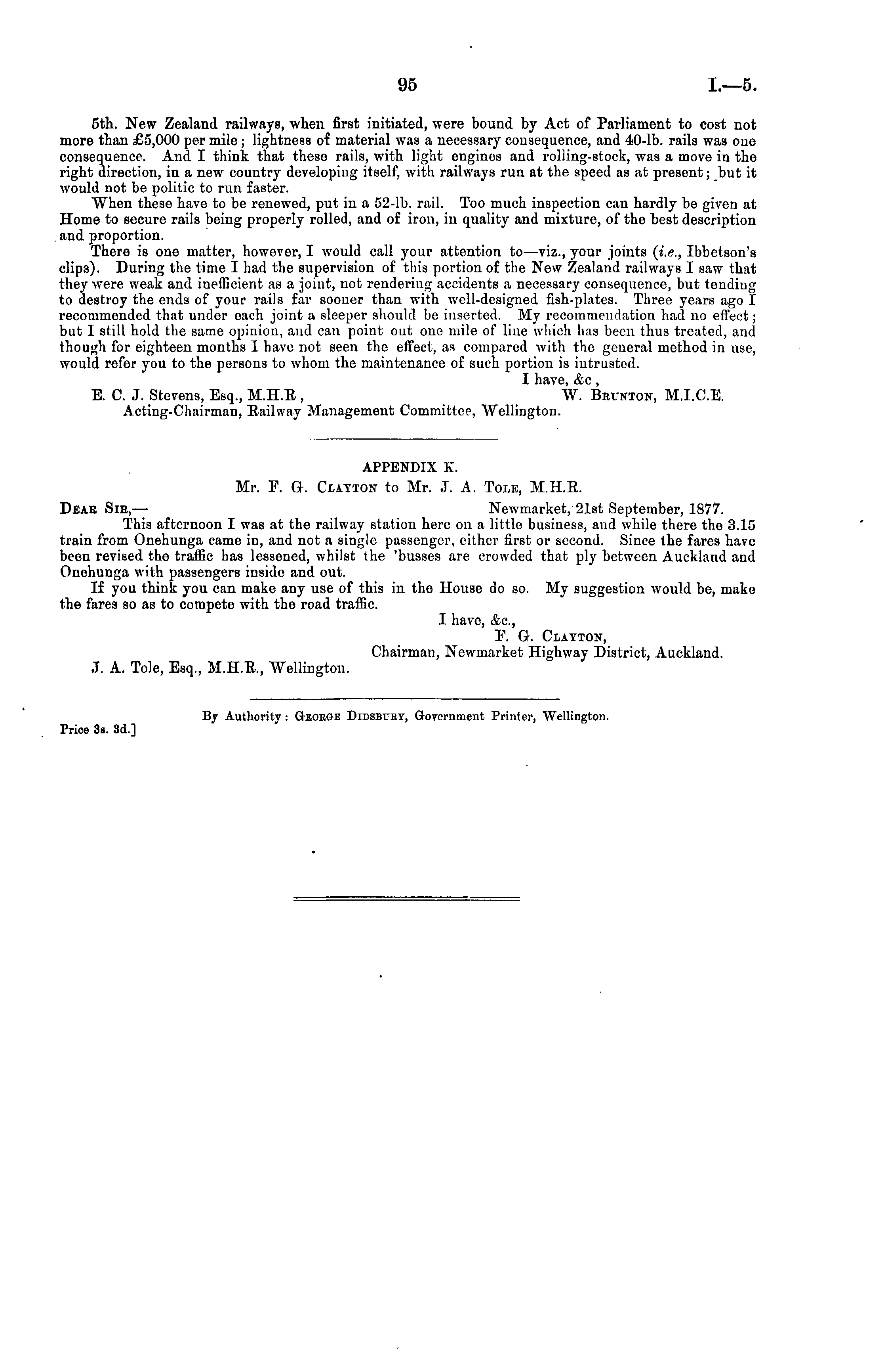 sth. New Zealand railways, when first initiated, were bound by Act of Parliament to cost not more than £5,000 per mile ; lightness of material was a necessary consequence, and 40-lb. rails was one consequence. And I think that these rails, with light engines and rolling-stock, was a move in the right direction, in a new country developing itself, with railways run at the speed as at present; but it would not be politic to run faster. When these have to be renewed, put in a 52-lb. rail. Too much inspection can hardly be given at Home to secure rails being properly rolled, and of iron, in quality and mixture, of the best description and proportion. There is one matter, however, I would call your attention to —viz., your joints (i.e., Ibbetson's clips). During the time I had the supervision of this portion of the New Zealand railways I saw that they were weak and inefficient as a joint, not rendering accidents a necessary consequence, but tending to destroy the ends of your rails far sooner than with well-designed fish-plates. Three years ago I recommended that under each joint n sleeper should be inserted. My recommendation had no effect; but I still hold the same opinion, and can point out one mile of line which has been thus treated, and though for eighteen months I have not seen the effect, as compared with the general method in use, would refer you to the persons to whom the maintenance of such portion is intrusted. I have, &c, E. C. J. Stevens, Esq., M.H.E, W. Bhunton, M.I.C.E. Acting-Chairman, Railway Management Committee, Wellington.