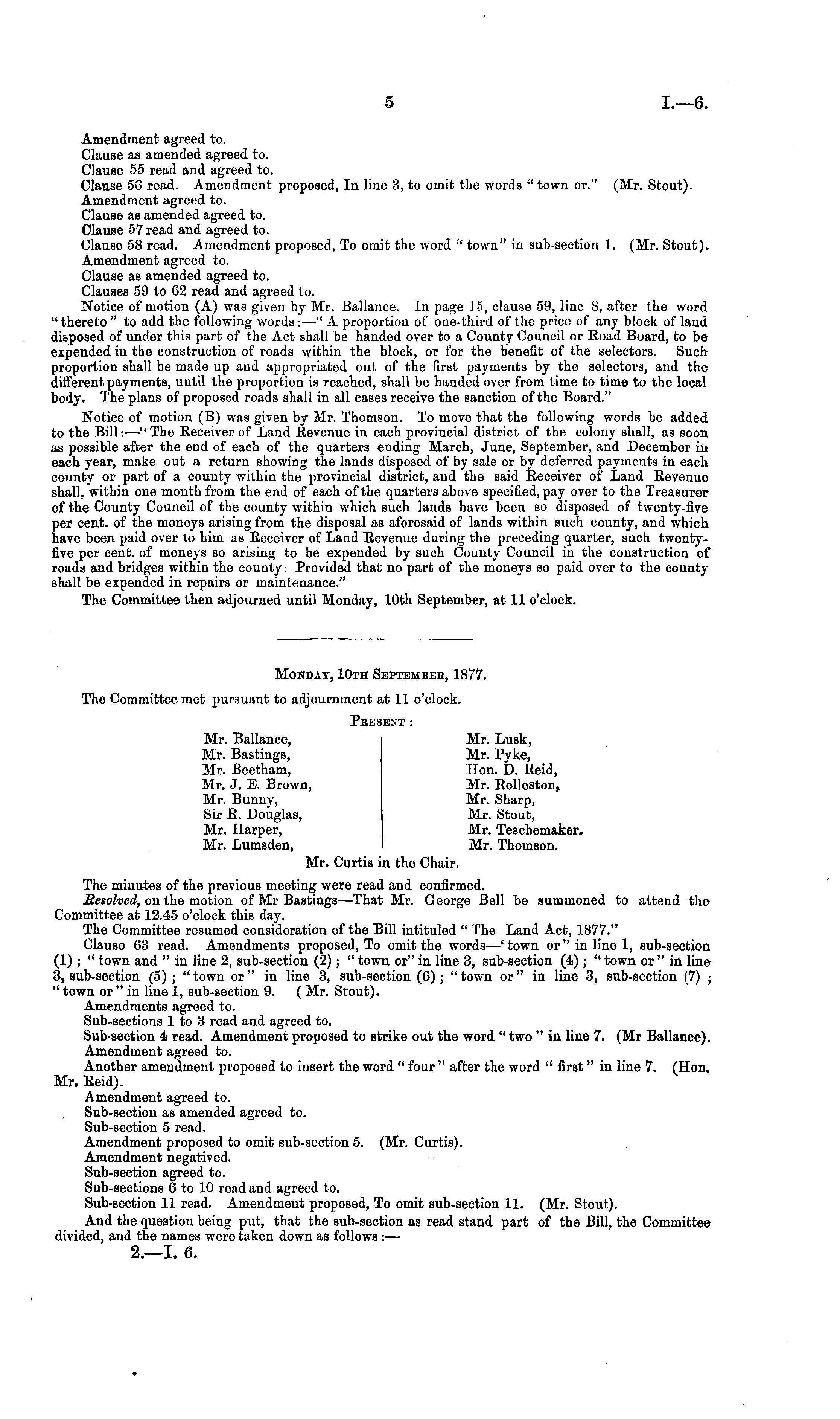 Amendment agreed to. Clause as amended agreed to. Clause 55 read and agreed to. Clause 53 read. Amendment proposed, In line 3, to omit the words "town or." (Mr. Stout). Amendment agreed to. Clause as amended agreed to. Clause 57 read and agreed to. Clause 58 read. Amendment proposed, To omit the word " town" in sub-section 1. (Mr. Stout). Amendment agreed to. Clause as amended agreed to. Clauses 59 to 62 read and agreed to. Notice of motion (A) was given by Mr. Ballance. In page 10, clause 59, line 8, after the word " thereto "to add the following words : —" A proportion of one-third of the price of any block of land disposed of under this part of the Act shall be handed over to a County Council or Eoad Board, to be expended in the construction of roads within the block, or for the benefit of the selectors. Such proportion shall be made up and appropriated out of the first payments by the selectors, and the different payments, until the proportion is reached, shall be handed over from time to time to the local body. The plans of proposed roads shall in all cases receive the sanction of the Board." Notice of motion (B) was given by Mr. Thomson. To move that the following words be added to the Bill: —" The Receiver of Land Revenue in each provincial district of the colony shall, as soon as possible after the end of each of the quarters ending March, June, September, and December in each year, make out a return showing the lands disposed of by sale or by deferred payments in each county or part of a county within the provincial district, and the said Receiver of Land Revenue shall, within one month from the end of each of the quarters above specified, pay over to the Treasurer of the County Council of the county within which such lands have been so disposed of twenty-five per cent, of the moneys arising from the disposal as aforesaid of lands within such county, and which have been paid over to him as Receiver of Land Revenue during the preceding quarter, such twentyfive per cent, of moneys so arising to be expended by such County Council in the construction of ronds and bridges within the county: Provided that no part of the moneys so paid over to the county shall be expended in repairs or maintenance." The Committes then adjourned until Monday, 10th September, at 11 o'clock. Monday, 10th Septembee, 1877. The Committee met pursuant to adjournment at 11 o'clock. Peesent: Mr. Ballance, Mr. Lusk, Mr. Bastings, Mr. Pyke, Mr. Beetham, Hon. D. Reid, Mr. J. E. Brown, Mr. Rolleston, Mr. Bunny, Mr. Sharp, Sir R. Douglas, Mr. Stout, Mr. Harper, Mr. Teschemaker. Mr. Lumsden, Mr. Thomson. Mr. Curtis in the Chair. The minutes of the previous meeting were read and confirmed. Resolved, on the motion of Mr Bastings—That Mr. George Bell be summoned to attend the Committee at 12.45 o'clock this day. The Committee resumed consideration of the Bill intituled " The Land Act, 1877." Clause 63 read. Amendments proposed, To omit the words—'town or" in line 1, sub-section (1) ; " town and "in line 2, sub-section (2); " town or" in line 3, sub-section (4) ; " town or "in line 3, sub-section (5) ; " town or" in line 3, sub-section (6) ; " town or" in line 3, sub-section (7) ; " town or "in line 1, sub-section 9. ( Mr. Stout). Amendments agreed to. Sub-sections 1 to 3 read and agreed to. Subsection 4 read. Amendment proposed to strike out the word "two "in line 7. (Mr Ballance). Amendment agreed to. Another amendment proposed to insert the word " four " after the word " first" in line 7. (Hon. Mr. Reid). Amendment agreed to. Sub-section as amended agreed to. Sub-section 5 read. Amendment proposed to omit sub-section 5. (Mr. Curtis). Amendment negatived. Sub-section agreed to. Sub-sections 6 to 10 read and agreed to. Sub-section 11 read. Amendment proposed, To omit sub-section 11. (Mr. Stout). And the question being put, that the sub-section as read stand part of the Bill, the Committee divided, and the names were taken down as follows:— 2.—1. 6.