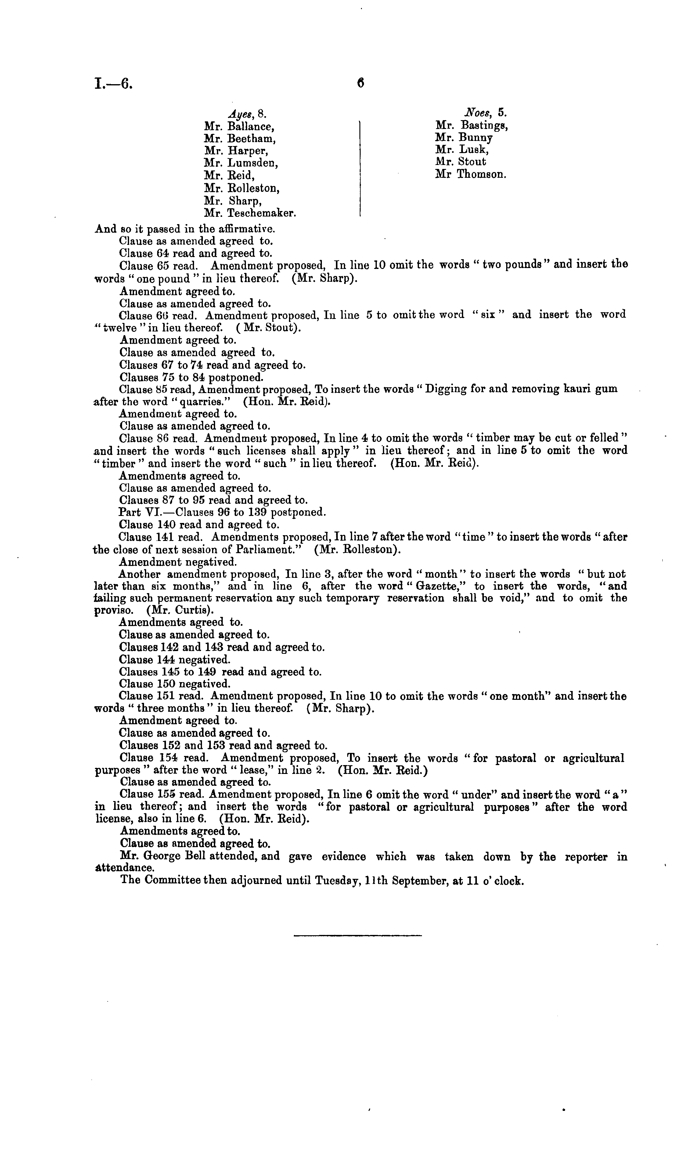 Ayes, 8. Noes, 5. Mr. Ballance, Mr. Bastings, Mr. Beetham, Mr. Bunny Mr. Harper, Mr. Lusk, Mr. Lumsden, Mr. Stout Mr. Reid, Mr Thomson. Mr. Eolleston, Mr. Sharp, Mr. Teschemaker. And so it passed in the affirmative. Clause as amended agreed to. Clause 64 read and agreed to. Clause 65 read. Amendment proposed, In line 10 omit the words " two pounds " and insert the words " one pound "in lieu thereof. (Mr. Sharp). Amendment agreed to. Clause as ameuded agreed to. Clause 6(3 read. Amendment proposed, In line 5 to omit the word "six" and insert the word " twelve "in lieu thereof. ( Mr. Stout). Amendment agreed to. Clause as amended agreed to. Clauses 67 to 74 read and agreed to. Clauses 75 to 84 postponed. Clause 85 read, Amendment proposed, To insert the words " Digging for and removing kauri gum after the word " quarries." (Hon. Mr. Reid). Amendment agreed to. Clause as amended agreed to. Clause 8G read. Amendment proposed, In line 4 to omit the words " timber may be cut or felled " and insert the words "such licenses shall apply" in lieu thereof; and in line 5 to omit the word " timber " and insert the word " such "in lieu thereof. (Hon. Mr. Reid). Amendments agreed to. Clause as amended agreed to. Clauses 87 to 95 read and agreed to. Part Vl.—Clauses 96 to 139 postponed. Clause 140 read and agreed to. Clause 141 read. Amendments proposed, In line 7 after the word " time "to insert the words " after the close of next session of Parliament." (Mr. Rollestou). Amendment negatived. Another amendment proposed, In line 3, after the word " month" to insert the words " but not later than six months," and in line 6, after the word" Gazette," to insert the words, " and failing such permanent reservation any such temporary reservation shall be void," and to omit the proviso. (Mr. Curtis). Amendments agreed to. Clause as amended agreed to. Clauses 142 and 143 read and agreed to. Clause 144 negatived. Clauses 145 to 149 read and agreed to. Clause 150 negatived. Clause 151 read. Amendment proposed, In line 10 to omit the words "one month" and insert the words " three months "in lieu thereof. (Mr. Sharp). Amendment agreed to. Clause as amended agreed to. Clauses 152 and 153 read and agreed to. Clause 154 read. Amendment proposed, To insert the words " for pastoral or agricultural purposes " after the word " lease," in line 2. (Hon. Mr. Reid.) Clause as amended agreed to. Clause 155 read. Amendment proposed, In line 6 omit the word " under" and insert the word " a " in lieu thereof; and insert the words "for pastoral or agricultural purposes" after the word license, also in line 6. (Hon. Mr. Reid). Amendments agreed to. Clause as amended agreed to. Mr. George Bell attended, and gave evidence which was taken down by the reporter in Attendance. The Committee then adjourned until Tuesday, 11th September, at 11 o'clock.