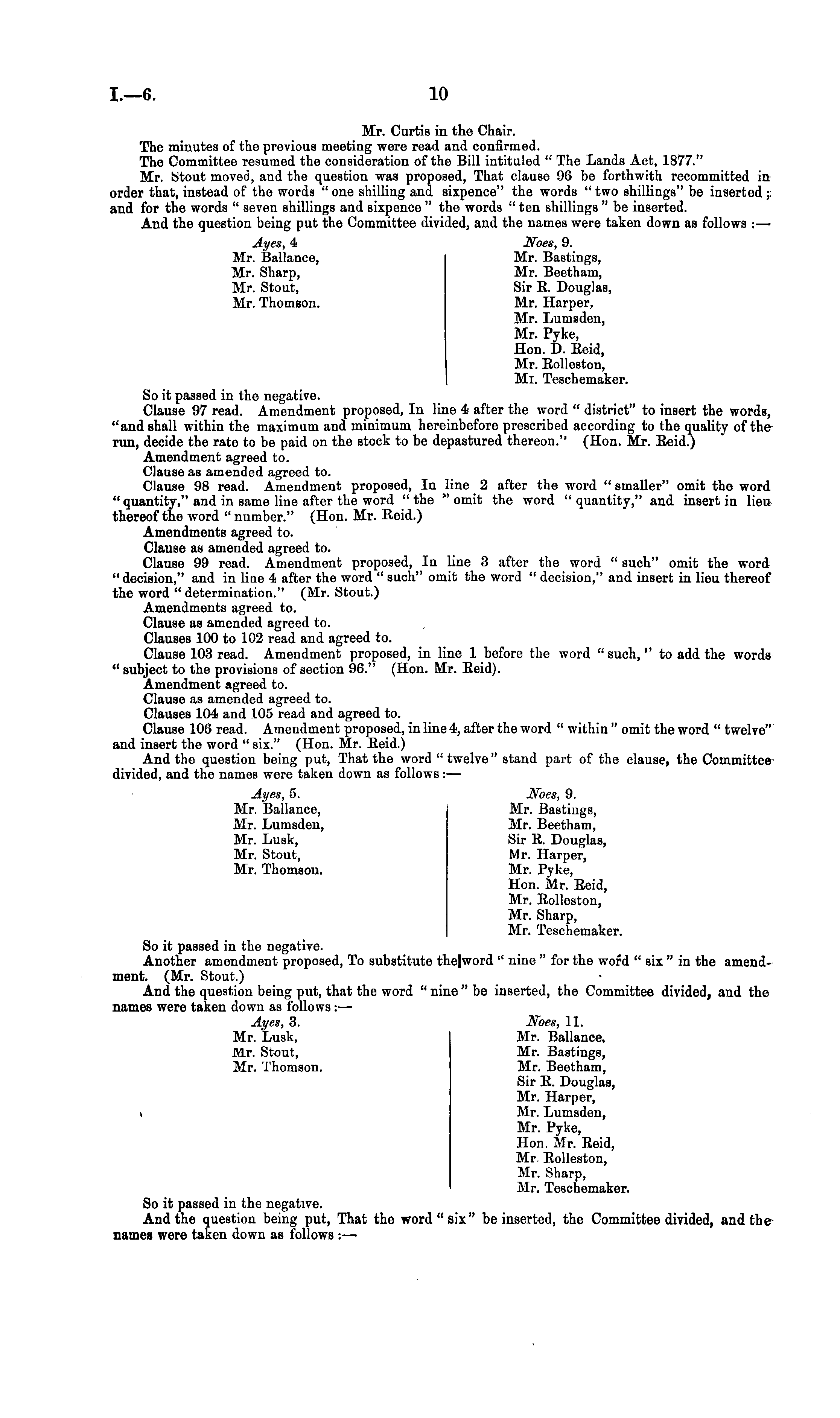 Mr. Curtis in the Chair. The minutes of the previous meeting were read and confirmed. The Committee resumed the consideration of the Bill intituled " The Lands Act, 1877." Mr. Stout moved, and the question was proposed, That clause 96 be forthwith recommitted in order that, instead of the words "one shilling and sixpence" the words "two shillings" be inserted;: and for the words " seven shillings and sixpence " the words " ten shillings " be inserted. And the question being put the Committee divided, and the names were taken down as follows :— Ayes, 4 Noes, 9. Mr. Ballance, Mr. Bastings, Mr. Sharp, Mr. Beetham, Mr. Stout, Sir E. Douglas, Mr. Thomson. Mr. Harper, Mr. Lumsden, Mr. Pyke, Hon. D. Eeid, Mr. Eolleston, Mi. Teschemaker. So it passed in the negative. Clause 97 read. Amendment proposed, In line 4 after the word " district" to insert the words, "and shall within the maximum and minimum hereinbefore prescribed according to the quality of the run, decide the rate to be paid on the stock to be depastured thereon." (Hon. Mr. Eeid.) Amendment agreed to. Clause as amended agreed to. Clause 98 read. Amendment proposed, In line 2 after the word " smaller" omit the word " quantity," and in same line after the word " the " omit the word " quantity," and insert in lieu thereof the word " number." (Hon. Mr. Eeid.) Amendments agreed to. Clause as amended agreed to. Clause 99 read. Amendment proposed, In line 3 after the word " such" omit the word "decision," and in line 4 after the word " such" omit the word " decision," and insert in lieu thereof the word " determination." (Mr. Stout.) Amendments agreed to. Clause as amended agreed to. Clauses 100 to 102 read and agreed to. Clause 103 read. Amendment proposed, in line 1 before the word " such, " to add the words " subject to the provisions of section 96." (Hon. Mr. Eeid). Amendment agreed to. Clause as amended agreed to. Clauses 104 and 105 read and agreed to. Clause 106 read. Amendment proposed, in line 4, after the word " within " omit the word " twelve" and insert the word " six." (Hon. Mr. Eeid.) And the question being put, That the word "twelve" stand part of the clause, the Committee divided, and the names were taken down as follows: — Ayes, 5. Noes, 9. Mr. Ballance, Mr. Bastings, Mr. Lumsden, Mr. Beetham, Mr. Lusk, Sir E. Douglas, Mr. Stout, Mr. Harper, Mr. Thomson. Mr. Pyke, Hon. Mr. Eeid, Mr. Eolleston, Mr. Sharp, Mr. Teschemaker. So it passed in the negative. Another amendment proposed, To substitute the|word " nine " for the word " six " in the amendment. (Mr. Stout.) And the question being put, that the word " nine " be inserted, the Committee divided, and the names were taken down as follows:— Ayes, 3. Noes, 11. Mr. Lusk, Mr. Ballance, Mr. Stout, Mr. Bastings, Mr. Thomson. Mr. Beetham, Sir E. Douglas, Mr. Harper, « Mr. Lumsden, Mr. Pyke, Hon. Mr. Eeid, Mr. Eolleston, Mr. Sharp, Mr. Teschemaker. So it passed in the negative. And the question being put, That the word "six" be inserted, the Committee divided, and the names were taken down as follows :—