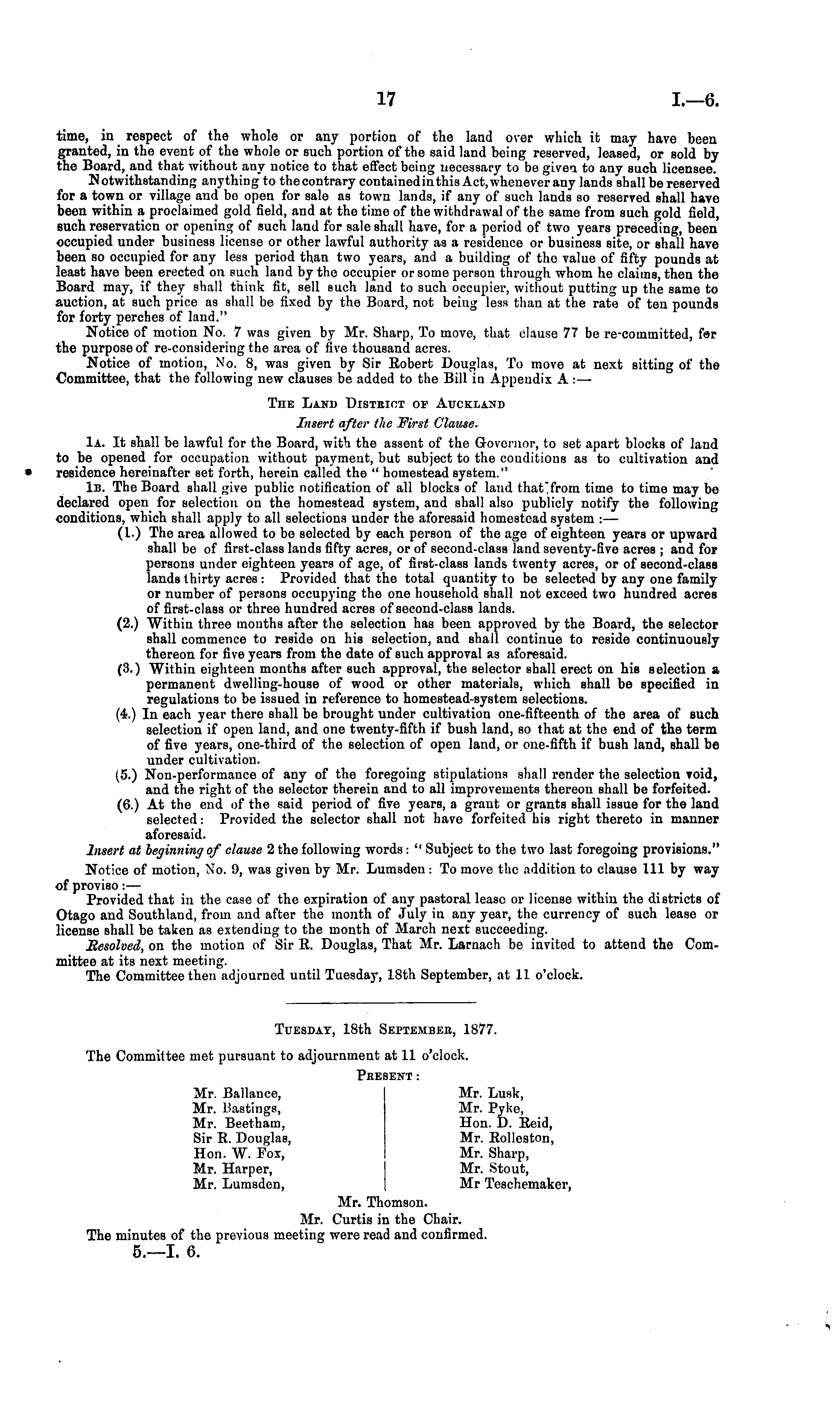 Tuesday, 18th September, 1877. The Committee met pursuant to adjournment at 11 o'clock. Present: Mr. Ballance, Mr. Lusk, Mr. Hastings, Mr. Pyke, Mr. Beetham, Hon. D. Reid, Sir E. Douglas, Mr. Eolleston, Hon. W. Fox, Mr. Sharp, Mr. Harper, Mr. Stout, Mr. Lumsden, Mr Teschemakei', Mr. Thomson. Mr. Curtis in the Chair. The minutes of the previous meeting were read and confirmed. 5.—1. 6.