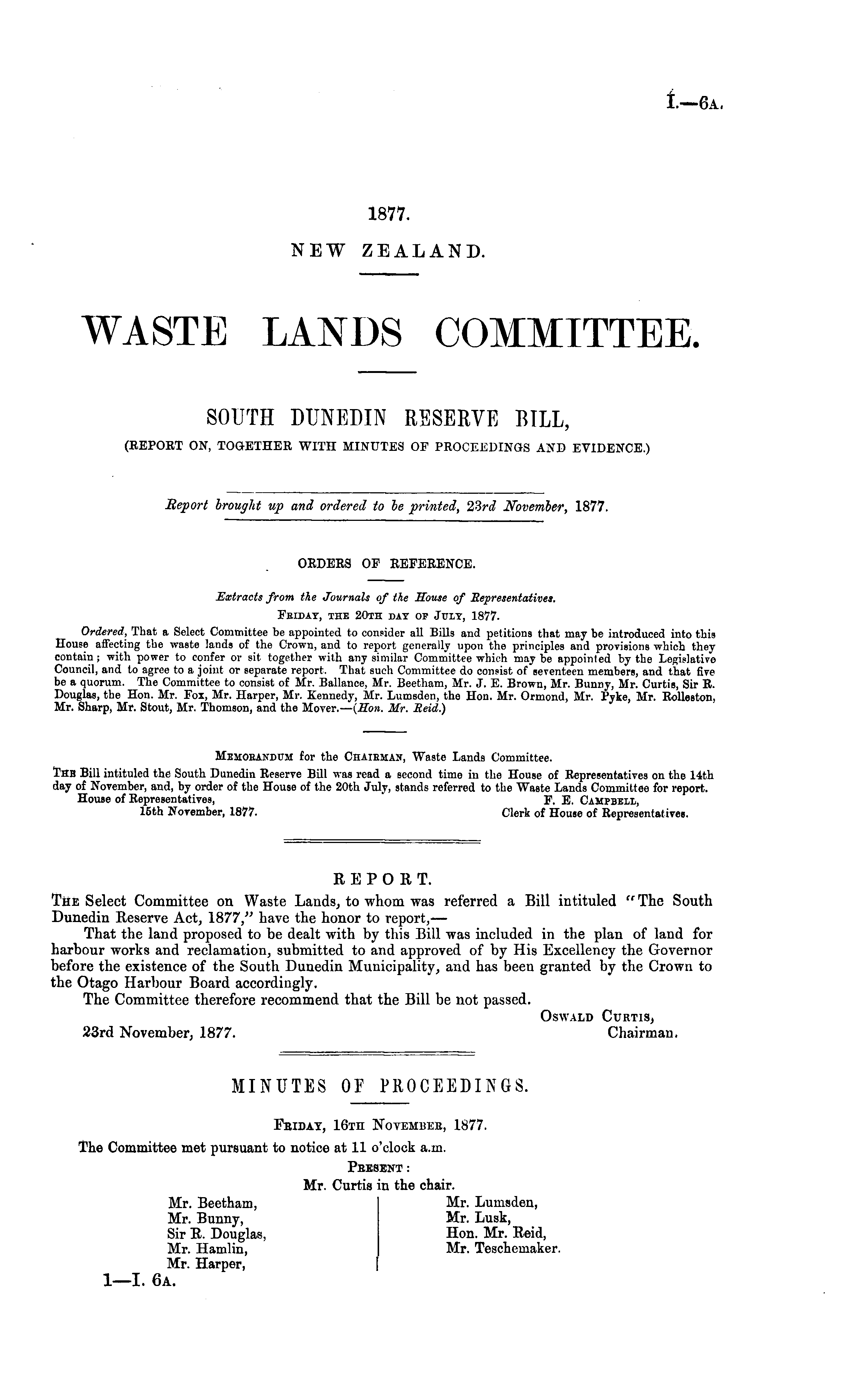 OEDERS OF REFERENCE. Extracts from the Journals of the Souse of 'Representative!. Friday, the 20th day op July, 1877. Ordered, That a Select Committee be appointed to consider all Bills and petitions that may be introduced into this House affecting the waste lands of the Crown, and to report generally upon the principles and provisions which they contain; with power to confer or sit together with any similar Committee which may be appointed by the Legislative Council, and to agree to a joint or separate report. That such Committee do consist of seventeen members, and that five be a quorum. The Committee to consist of Mr. Ballance, Mr. Beetham, Mr. J. E. Brown, Mr. Bunny, Mr. Curtis, Sir R. Douglas, the Hon. Mr. Fox, Mr. Harper, Mr. Kennedy, Mr. Luinsden, the Hon. Mr. Ormond, Mr. Pyke, Mr. Rolloston, Mr. Sharp, Mr. Stout, Mr. Thomson, and the Mover.— (Son. Mr. Reid.) Memorandum for the Chairman, Waste Lands Committee. I'HB Bill intituled the South Dunedin Reserve Bill was read a second time in the House of Representatives on the 14th day of November, and, by order of the House of the 20th July, stands referred to the Waste Lands Committee for report. House of Representatives, J?. E. Campbell, 15th November, 1877. Clerk of House of Representatives.