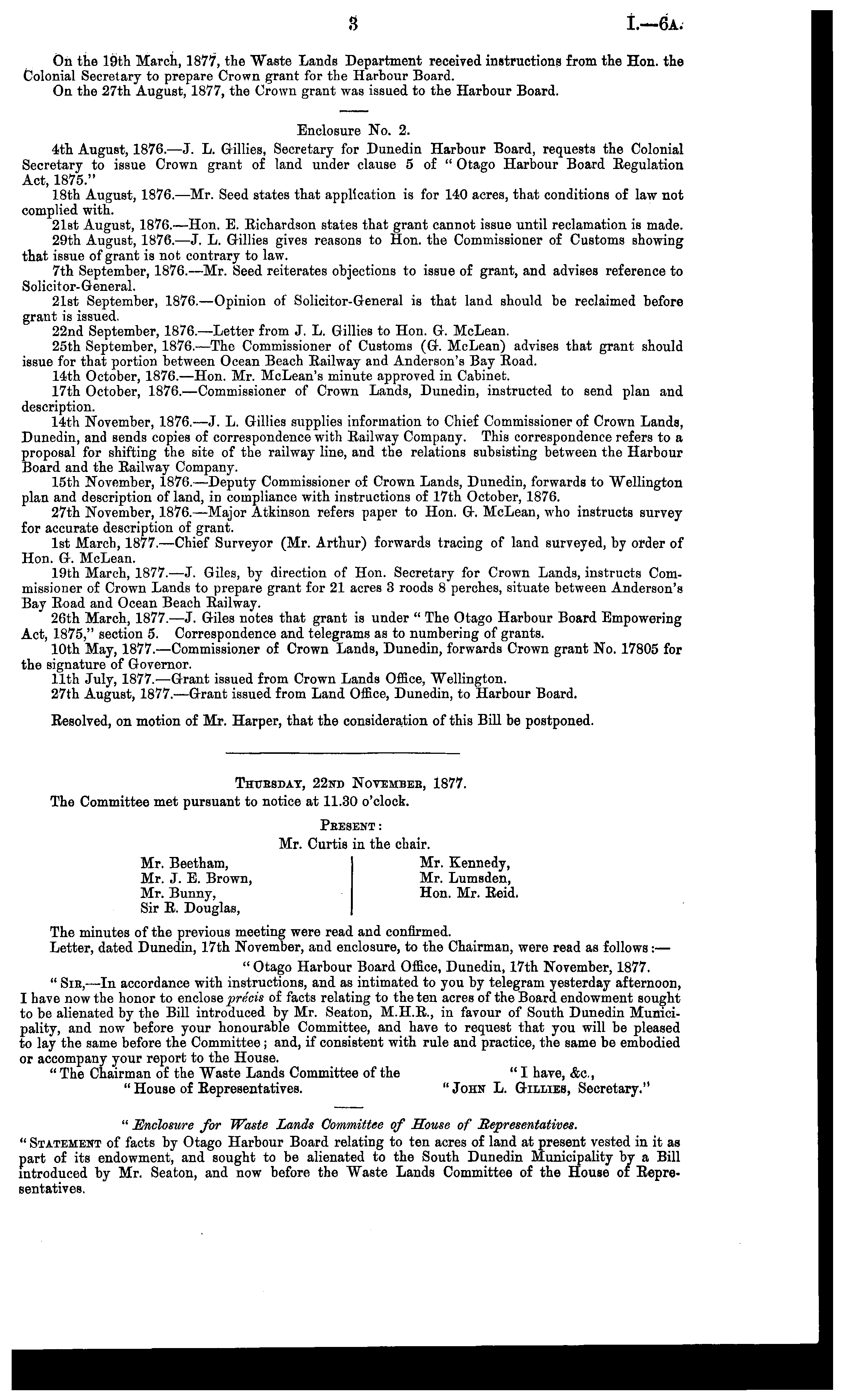 Thursday, 22nd Novembeb, 1877. The Committee met pursuant to notice at 11.30 o'clock. Pbesent: Mr. Curtis in the chair. Mr. Beetham, Mr. Kennedy, Mr. J. E. Brown, Mr. Lumsden, Mr. Bunny, Hon. Mr. Beid. Sir E. Douglas, The minutes of the previous meeting were read and confirmed. Letter, dated Dunedin, 17th November, and enclosure, to the Chairman, were read as follows: — " Otago Harbour Board Office, Dunedin, 17th November, 1877. " Sib, —In accordance with instructions, and as intimated to you by telegram yesterday afternoon, I have now the honor to enclose precis of facts relating to the ten acres of the Board endowment sought to be alienated by the Bill introduced by Mr. Seaton, M.H.E., in favour of South Dunedin Municipality, and now before your honourable Committee, and have to request that you will be pleased to lay the same before the Committee; and, if consistent with rule and practice, the same be embodied or accompany your report to the House. " The Chairman of the Waste Lands Committee of the " I have, &c, " House of Eepresentatives. "John L. Gillies, Secretary." " Enclosure for Waste Lands Committee of Souse of Representatives. " Statement of facts by Otago Harbour Board relating to ten acres of land at present vested in it as part of its endowment, and sought to be alienated to the South Dunedin Municipality by a Bill introduced by Mr. Seaton, and now before the "Waste Lands Committee of the House of Eepresentatives.