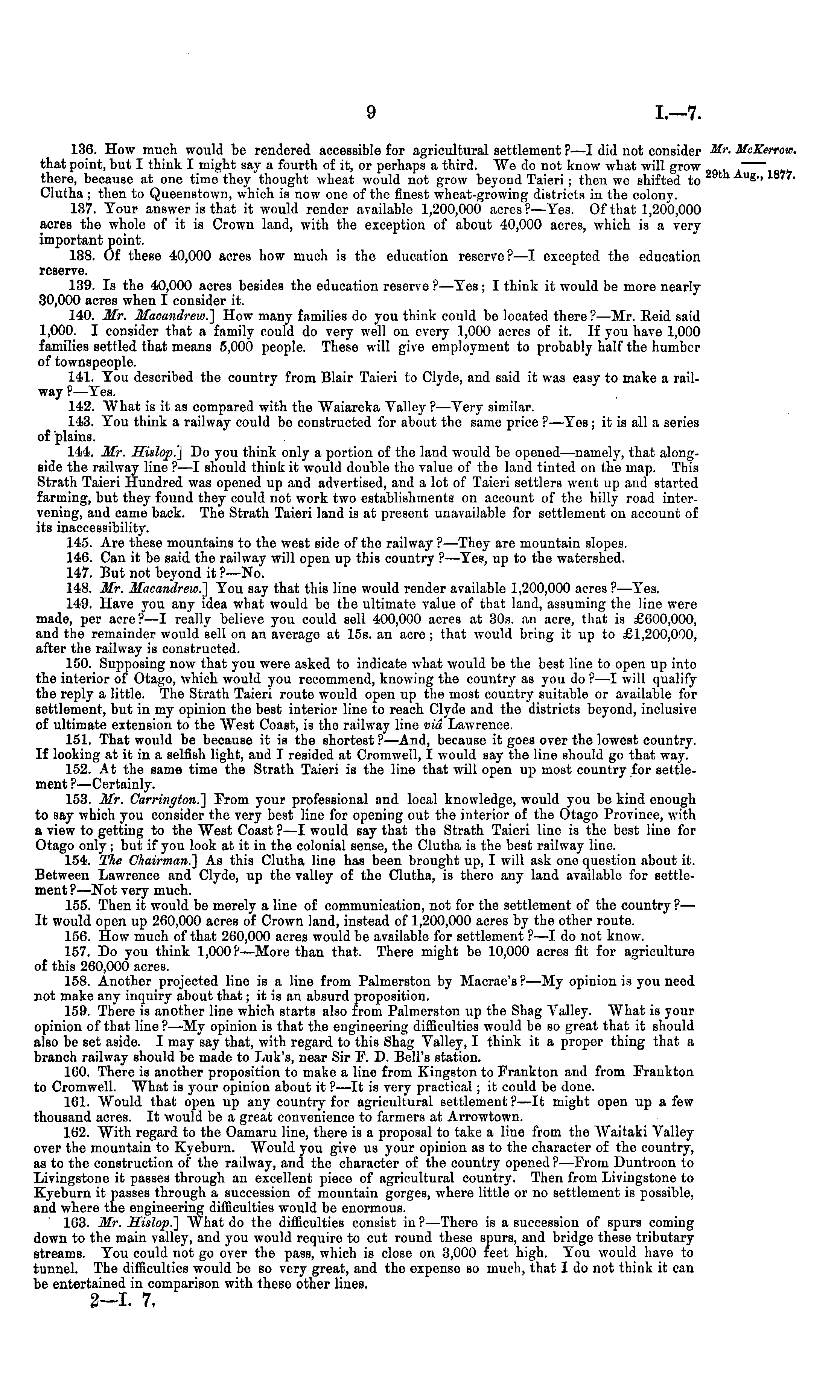 136. How much would be rendered accessible for agricultural settlement ?—I did not consider that point, but I think I might say a fourth of it, or perhaps a third. We do not know what will grow there, because at one time they thought wheat would not grow beyond Taieri ; then we shifted to Clutha ; then to Queenstown, which is now one of the finest wheat-growing districts in the colony. 137. Your answer is that it would render available 1,200,000 acres? —Yes. Of that 1,200,000 acres the whole of it is Crown land, with the exception of about 40,000 acres, which is a very important point. 138. Of these 40,000 acres how much is the education reserve?—l excepted the education reserve. 139. Is the 40,000 acres besides the education reserve ?—Yes; I think it would be more nearly 30,000 acres when I consider it. 140. Mr. Macandrew.~\ How many families do you think could be located there ?—Mr. Eeid said 1,000. I consider that a family could do very well on every 1,000 acres of it. If you have 1,000 families settled that means 5,000 people. These will give employment to probably half the humber of townspeople. 141. You described the country from Blair Taieri to Clyde, and said it was easy to make a railway ?—Yes. 142. What is it as compared with the Waiareka Valley ? —Very similar. 143. You think a railway could be constructed for about the same price ?—Yes; it is all a series of plains. 144. Mr. Hislop.'j Do you think only a portion of the land would be opened—namely, that alongside the railway line ?—I should think it would double the value of the land tinted on the map. This Strath Taieri Hundred was opened up and advertised, and a lot of Taieri settlers went up and started farming, but they found they could not work two establishments on account of the hilly road intervening, and came back. The Strath Taieri land is at present unavailable for settlement on account of its inaccessibility. 145. Are these mountains to the west side of the railway ?—They are mountain slopes. 146. Can it be said the railway will open up this country ?—Yes, up to the watershed. 147. But not beyond it ?—No. 148. Mr. Macandrew.~\ You say that this line would render available 1,200,000 acres ?—Yes. 149. Have you any idea what would be the ultimate value of that land, assuming the line were made, per acre?—l really believe you could sell 400,000 acres at 30s. an acre, that is £600,000, and tho remainder would sell on an average at 15s. an acre; that would bring it up to £1,200,000, after the railway is constructed. 150. Supposing now that you were asked to indicate what would be the best line to open up into the interior of Otago, which would you recommend, knowing the country as you do ?—I will qualify the reply a little. The Strath Taieri route would open up the most country suitable or available for settlement, but in my opinion the best interior line to reach Clyde and the districts beyond, inclusive of ultimate extension to the West Coast, is the railway line via Lawrence. 151. That would be because it is the shortest ? —And, because it goes over the lowest country. If looking at it in a selfish light, and I resided at Cromwell, I would say the line should go that way. 152. At the same time the Strath Taieri is the line that will open up most country for settlement ?—Certainly. 153. Mr. Carrington.~\ From your professional and local knowledge, would you be kind enough to say which you consider the very best line for opening out the interior of the Otago Province, with a view to getting to the West Coast ?—I would say that the Strath Taieri line is the best line for Otago only; but if you look at it in the colonial sense, the Clutha is the best railway line. 154. The Chairman.'] As this Clutha line has been brought up, I will ask ono question about it. Between Lawrence and Clyde, up the valley of the Clutha, is there any land available for settlement ? —Not very much. 155. Then it would be merely a line of communication, not for the settlement of the country ?— It would open up 260,000 acres of Crown land, instead of 1,200,000 acres by the other route. 156. How much of that 260,000 acres would be available for settlement ?—I do not know. 157. Do you think 1,000? —More than that. There might be 10,000 acres fit for agriculture of this 260,000 acres. 158. Another projected line is a line from Palmerston by Macrae's ?—My opinion is you need not make any inquiry about that; it is an absurd proposition. 159. There is another line which starts also from Palmerston up the Shag Valley. What is your opinion of that line ? —My opinion is that the engineering difficulties would be so great that it should also be set aside. I may say that, with regard to this Shag Valley, I think it a proper thing that a branch railway should be made to Luk's, near Sir F. D. Bell's station. 160. There is another proposition to make a line from Kingston to Frankton and from Frankton to Cromwell. What is your opinion about it ?—lt is very practical; it could be done. 161. Would that open up any country for agricultural settlement?—lt might open up a few thousand acres. It would be a great convenience to farmers at Arrowtown. 162. With regard to the Oamaru line, there is a proposal to take a line from the Waitaki Valley over the mountain to Kyeburn. Would you give us your opinion as to the character of the country, as to the construction of the railway, and the character of the country opened ? —From Duntroon to Livingstone it passes through an excellent piece of agricultural country. Then from Livingstone to Kyeburn it passes through a succession of mountain gorges, where little or no settlement is possible, and where the engineering difficulties would bo enormous. 163. Mr. Hislop.~\ What do the difficulties consist in ? —There is a succession of spurs coming down to the main valley, and you would require to cut round these spurs, and bridge these tributary streams. You could not go over