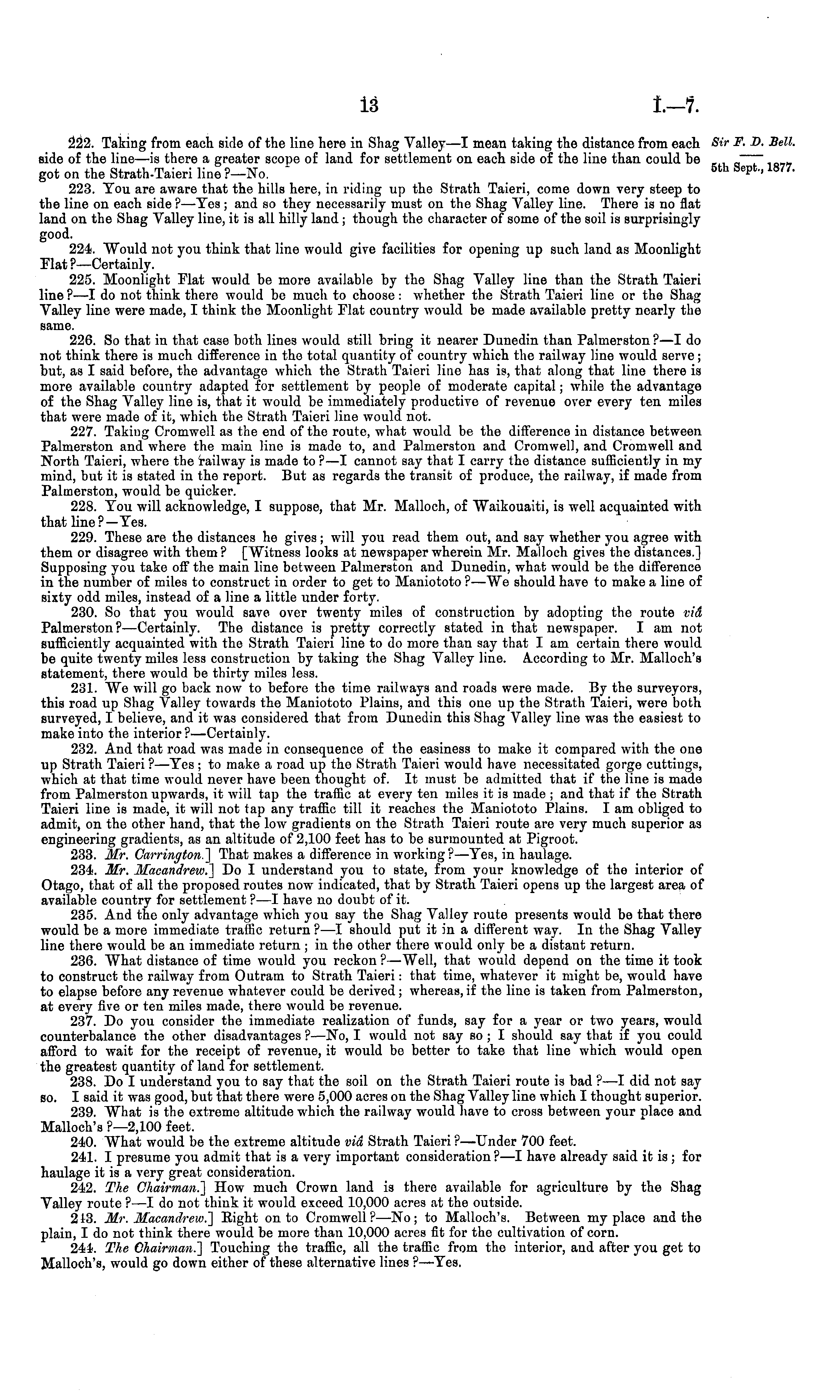 222. Taking from each side of the line here in Shag Valley—l mean taking the distance from each side of the line —is there a greater scope of land for settlement on each side of the line than could be got on the Strath-Taieri line?— No. 223. You are aware that the hills here, in riding up the Strath Taieri, come down very steep to the line on each side ? —Yes ; and so they necessarily must on the Shag Valley line. There is no flat land on the Shag Valley line, it is all hilly land ; though the character of some of the soil is surprisingly good. 224. "Would not you think that line would give facilities for opening up such land as Moonlight Hat ?—Certainly. 225. Moonlight Flat would be more available by the Shag Valley line than the Strath Taieri line ? —I do not think there would be much to choose : whether the Strath Taieri line or the Shag Valley line were made, I think the Moonlight Hat country would be made available pretty nearly the same. 226. So that in that case both lines would still bring it nearer Dunedin than Palmerston? —I do not think there is much difference in the total quantity of country which the railway line would serve; but, as I said before, the advantage which the Strath Taieri line has is, that along that line there is more available country adapted for settlement by people of moderate capital; while the advantage of the Shag Valley line is, that it would be immediately productive of revenue over every ten miles that were made of it, which the Strath Taieri line would not. 227. Taking Cromwell as the end of the route, what would be the difference in distance between Palmerston and where the main line is made to, and Palmerston and Cromwell, and Cromwell and North Taieri, where the railway is made to ? —I cannot say that I carry the distance sufficiently in my mind, but it is stated in the report. But as regards the transit of produce, the railway, if made from Palmerston, would be quicker. 228. You will acknowledge, I suppose, that Mr. Malloch, of "Waikouaiti, is well acquainted with that line?— Yes. 229. These are the distances he gives; will you read them out, and say whether you agree with them or disagree with them ? [Witness looks at newspaper wherein Mr. Malloch gives the distances.] Supposing you take off the main line between Palmerston and Dunedin, what would be the difference in the number of miles to construct in order to get to Maniototo ?—We should have to make a line of sixty odd miles, instead of a line a little under forty. 230. So that you would save over twenty miles of construction by adopting the route vid Palmerston? —Certainly. The distance is pretty correctly stated in that newspaper. I am not sufficiently acquainted with the Strath Taieri line to do more than say that I am certain there would be quite twenty miles less construction by taking the Shag Valley line. According to Mr. Malloch's statement, there would be thirty miles less. 231. We will go back now to before the time railways and roads were made. By the surveyors, this road up Shag Valley towards the Maniototo Plains, and this one up the Strath Taieri, were both surveyed, I believe, and it was considered that from Dunedin this Shag Valley line was the easiest to make into the interior ?—Certainly. 232. And that road was made in consequence of the easiness to make it compared with the one up Strath Taieri ?—Yes ; to make a road up the Strath Taieri would have necessitated gorge cuttings, which at that time would never have been thought of. It must be admitted that if the line is made from Palmerston upwards, it will tap the traffic at every ten miles it is made ; and that if the Strath Taieri line is made, it will not tap any traffic till it reaches the Maniototo Plains. lam obliged to admit, on the other hand, that the low gradients on the Strath Taieri route are very much superior as engineering gradients, as an altitude of 2,100 feet has to be surmounted at Pigroot. 233. Mr. Carrington,'] That makes a difference in working?— Yes, in haulage. 234. Mr. Macandreio.~\ Do I understand you to state, from your knowledge of the interior of Otago, that of all the proposed routes now indicated, that by Strath Taieri opens up the largest area of available country for settlement ? —I have no doubt of it. 235. And the only advantage which you say the Shag Valley route presents would be that there would be a more immediate traffic return? —I should put it in a different way. In the Shag Valley line there would be an immediate return; in the other there would only be a distant return. 236. What distance of time would you reckon ? —Well, that would depend on the time it took to construct the railway from Outram to Strath Taieri: that time, whatever it might be, would have to elapse before any revenue whatever could be derived; whereas, if the line is taken from Palmerston, at every five or ten miles made, there would be revenue. 237. Do you consider the immediate realization of funds, say for a year or two years, would counterbalance the other disadvantages ?—No, I would not say so ; I should say that if you could afford to wait for the receipt of revenue, it would be better to take that line which would open the greatest quantity of land for settlement. 238. Do I understand you to say that the soil on the Strath Taieri route is bad ? —I did not say so. I said it was good, but that there were 5,000 acres on the Shag Valley line which I thought superior. 239. What is the extreme altitude which the railway would have to cross between your nlace and Malloch's ?—2,100 feet. 240. What would be the extreme altitude vid Strath Taieri ?—Under 700 feet. 241. I presume you admit that is a very important consideration? —I have already said it is ; for haulage it is a very great consideration. 242. The Chairman.^ How much Crown land is there available for agriculture by the Shag Valley route ? —I do not think it would exceed 10,000 acres at the outside. 213. Mr.
