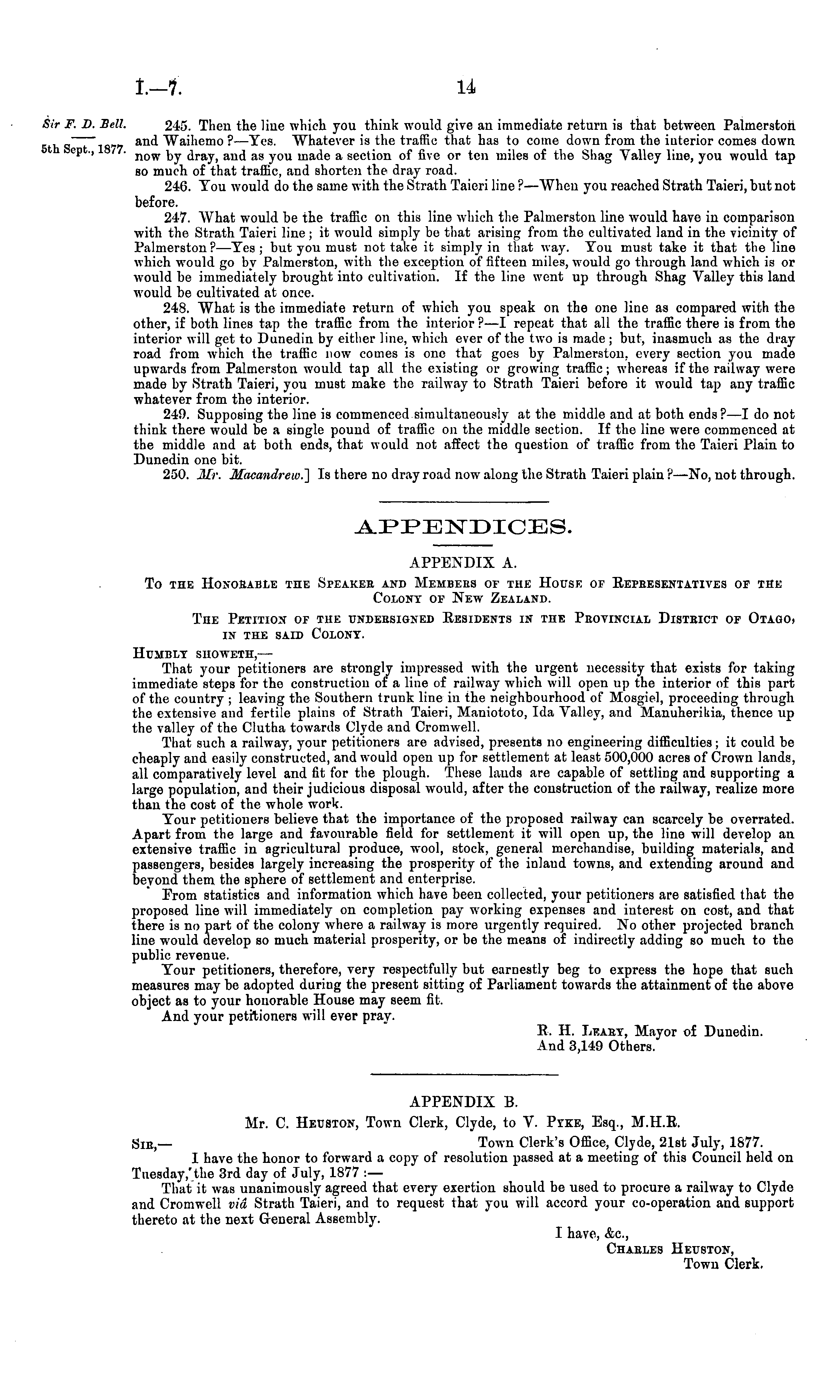 APPENDIX B. Mr. C. Heusxon, Town Clerk, Clyde, to V. Pike, Esq., M.H.E. Sic,— Town Clerk's Office, Clyde, 21st July, 1877. I have the honor to forward a copy of resolution passed at a meeting of this Council held on Tuesday,'the 3rd day of July, 1877 :— That it was unanimously agreed that every exertion should be used to procure a railway to Clyde and Cromwell via Strath Taieri, and to request that you will accord your co-operation and support thereto at the next General Assembly. I have, &c, Charles Heuston, Town Clerk.