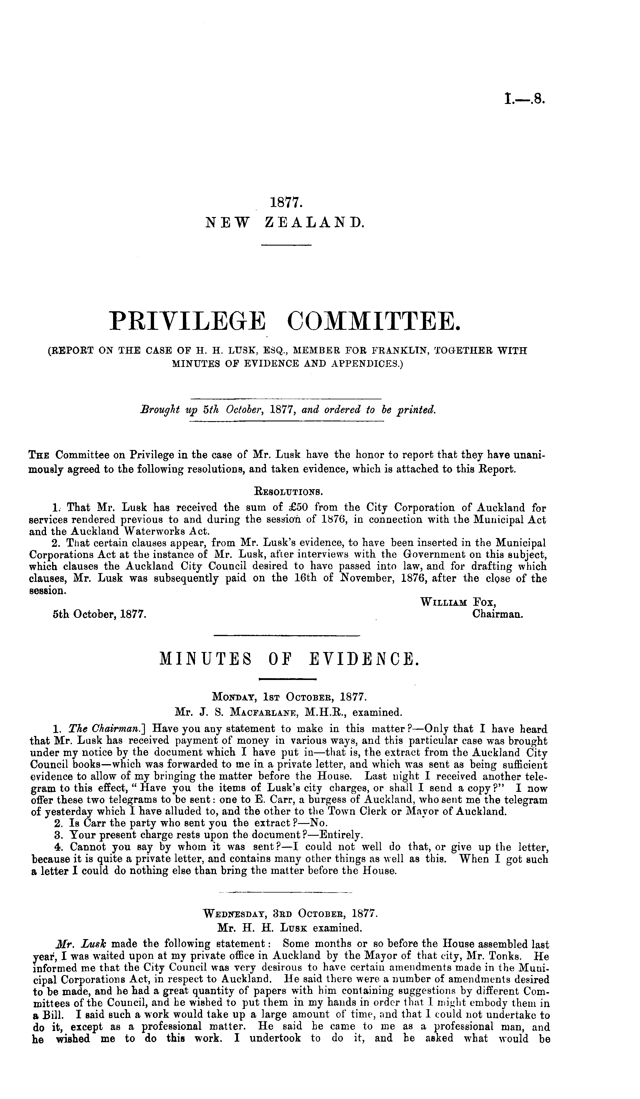 The Committee on Privilege in the case of Mr. Lusk have the honor to report that they have unanimously agreed to the following resolutions, and taken evidence, which is attached to this Report. Resolutions. 1. That Mr. Lusk has received the sum of £50 from the City Corporation of Auckland for services rendered previous to and during the session of 1876, in connection with the Municipal Act and the Auckland Waterworks Act. 2. That certain clauses appear, from Mr. Lusk's evidence, to have been inserted in the Municipal Corporations Act at the instance of Mr. Lusk, afier interviews with the Government on this subject, which clauses the Auckland City Council desired to have passed into law, and for drafting which clauses, Mr. Lusk was subsequently paid on the 16th of November, 1876, after the close of the session. William Fox, sth October, 1877. Chairman.