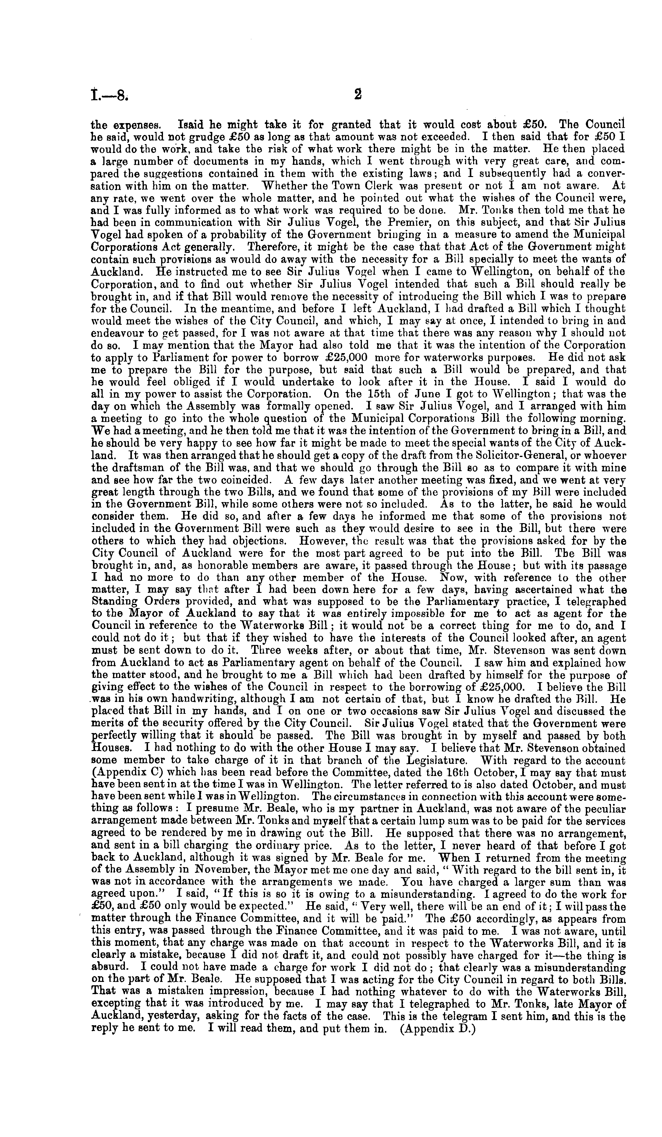 the expenses. Isaid he might take it for granted that it would cost about £50. The Council he said, would not grudge £50 as long as that amount was not exceeded. I then said that for £50 I would do the work, and take the risk of what work there might be in the matter. He then placed a large number of documents in my hands, which I went through with very great care, and compared the suggestions contained in them with the existing laws; and I subsequently had a conversation with him on the matter. "Whether the Town Clerk was present or not I am not aware. At any rate, we went over the whole matter, and he pointed out what the wishes of the Council were, and I was fully informed as to what work was required to be done. Mr. Tonks then told me that ho had been in communication with Sir Julius Vogel, the Premier, on this subject, and that Sir Julius Vogel had spoken of a probability of the Government bringing in a measure to amend the Municipal Corporations Act generally. Therefore, it might be the case that that Act of the Government might contain such provisions as would do away with the necessity for a Bill specially to meet the wants of Auckland. He instructed me to see Sir Julius Vogel when I came to AVellington, on behalf of the Corporation, and to find out whether Sir Julius Vogel intended that such a Bill should really be brought in, and if that Bill would remove the necessity of introducing the Bill which I was to prepare for the Council. In the meantime, and before I left Auckland, I had drafted a Bill which I thought would meet the wishes of the City Council, and which, I may say at once, I intended to bring in and endeavour to get passed, for I was not aware at that time that there was any reason why I should not do so. I may mention that the Mayor had also told me that it was the intention of the Corporation to apply to Parliament for power to borrow £25,000 more for waterworks purposes. He did not ask me to prepare the Bill for the purpose, but said that such a Bill would be prepared, and that he would feel obliged if I would undertake to look after it in the House. I said I would do all in my power to assist the Corporation. On the 15th of June I got to Wellington; that was the day on which the Assembly was formally opened. I saw Sir Julius Vogel, and I arranged with him a meeting to go into the whole question of the Municipal Corporations Bill the following morning. "We had a meeting, and he then told me that it was the intention ofthe Government to bring in a Bill, and he should be very happy to see how far it might be made to meet the special wants of the City of Auckland. It was then arranged that he should get a copy of the draft from the Solicitor-General, or whoever the draftsman of the Bill was, and that we should go through the Bill so as to compare it with mine and see how far the two coincided. A few days later another meeting was fixed, and we went at very great length through the two Bills, and we found that some of the provisions of my Bill were included in the Government Bill, while some others were not so included. As to the latter, he said he would consider them. He did so, and after a few days he informed me that some of the provisions not included in the Government Bill were such as they would desire to see in the Bill, but there were others to which they had objections. However, the result was that the provisions asked for by the City Council of Auckland were for the most part agreed to be put into the Bill. The Bill was brought in, and, as honorable members are aware, it passed through the House; but with its passage I had no more to do than any other member of the House. Now, with reference to the other matter, I may say that after I had been down here for a few days, having ascertained what the Standing Orders provided, and what was supposed to be the Parliamentary practice, I telegraphed to the Mayor of Auckland to say that it was entirely impossible for me to act as agent for the Council in reference to the Waterworks Bill; it would not be a correct thing for me to do, and I could not do it; but that if they wished to have the interests of the Council looked after, an agent must be sent down to do it. Three weeks after, or about that time, Mr. Stevenson was sent down from Auckland to act as Parliamentary agent on behalf of the Council. I saw him and explained how the matter stood, and he brought to me a Bill which had been drafted by himself for the purpose of giving eifect to the wishes of the Council in respect to the borrowing of £25,000. I believe the Bill was in his own handwriting, although lam not certain of that, but I know he drafted the Bill. He placed that Bill in my hands, and I on one or two occasions saw Sir Julius Vogel and discussed the merits of the security offered by the City Council. Sir Julius Vogel stated that the Government were perfectly willing that it should be passed. The Bill was brought in by myself and passed by both Houses. I had nothing to do with the other House I may say. I believe that Mr. Stevenson obtained some member to take charge of it in that branch of the Legislature. With regard to the account (Appendix C) which has been read before the Committee, dated the 16th October, I may say that must have been sent in at the time I was in Wellington. The letter referred to is also dated October, and must have been sent while I was in Wellington. The circumstances in connection with this account were something as follows : I presume Mr. Beale, who is my partner in Auckland, was not aware ofthe peculiar arrangement made between Mr. Tonks and myself that a certain lump sum was to be paid for the services agreed to be rendered by me in drawing out the Bill. He supposed that there was no arrangement, and sent in a bill charging the ordinary price. As to the letter, I never heard of that before I got back to Auckland, although it was signed by Mr. Beale for me. "When I returned from the meeting of the Assembly in November,