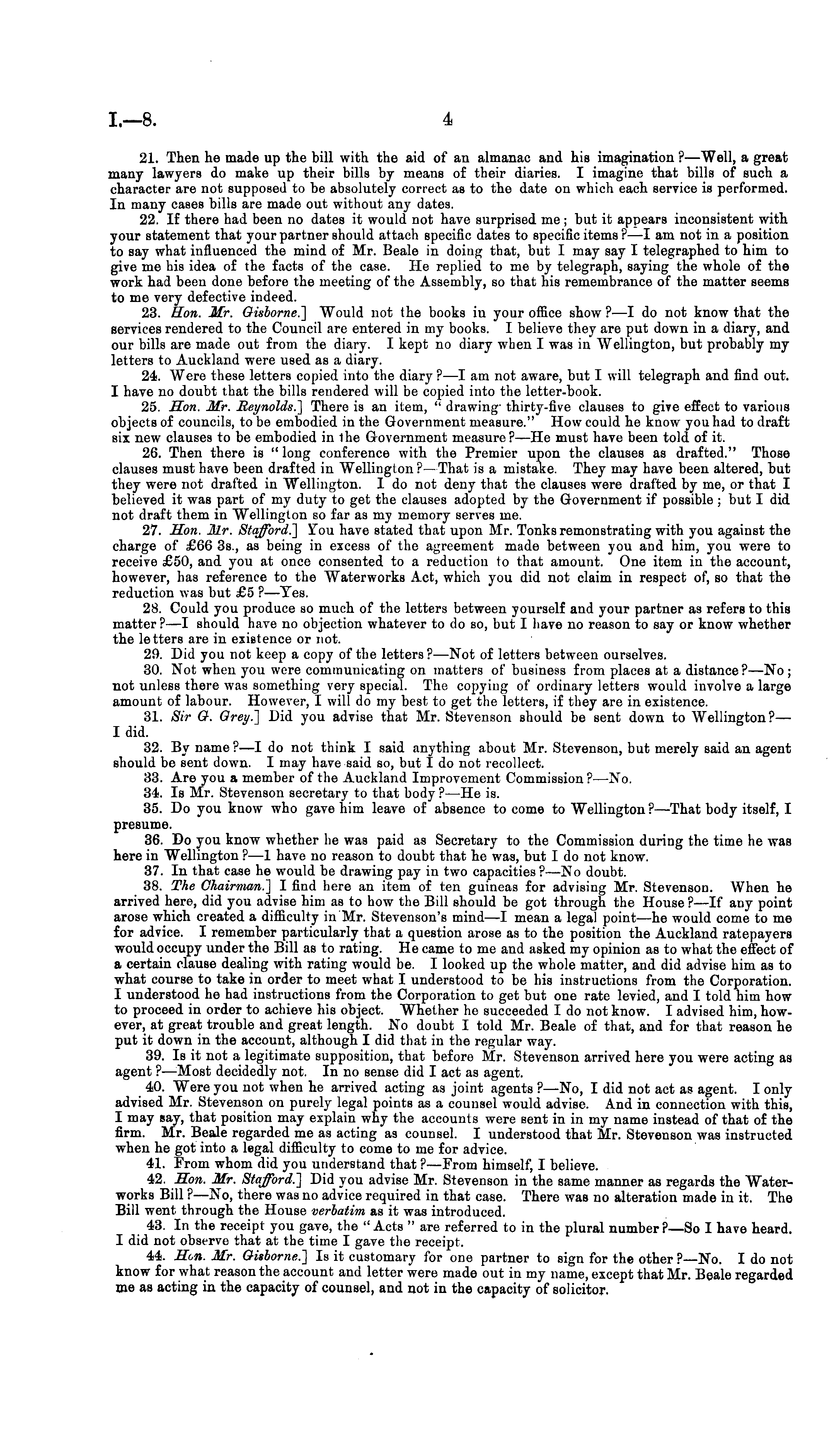 21. Then he made up the bill with the aid of an almanac and his imagination ?—Well, a great many lawyers do make up their bills by means of their diaries. I imagine that bills of such a character are not supposed to be absolutely correct as to the date on which each service is performed. In many cases bills are made out without any dates. 22. If there had been no dates it would not have surprised me ; but it appears inconsistent with your statement that your partner should attach specific dates to specific items ?—I am not in a position to say what influenced the mind of Mr. Beale in doing that, but I may say I telegraphed to him to give me his idea of the facts of the case. He replied to me by telegraph, saying the whole of the work had been done before the meeting of the Assembly, so that his remembrance of the matter seems to me very defective indeed. 23. Son. Mr. Gisborne.~] "Would not the books in your office show ? —I do not know that the services rendered to the Council are entered in my books. I believe they are put down in a diary, and our bills are made out from the diary. I kept no diary wben I was in Wellington, but probably my letters to Auckland were used as a diary. 24. Were these letters copied into the diary ? —I am not aware, but I will telegraph and find out. I have no doubt that the bills rendered will be copied into the letter-book. 25. Son. Mr. Reynolds.] There is an item, " drawing' thirty-five clauses to give effect to various objects of councils, to be embodied in the Government measure." How could he know you had to draft six new clauses to be embodied in ihe Government measure? —He must have been told of it. 26. Then there is " long conference with the Premier upon the clauses as drafted." Those clauses must have been drafted in Wellington ?—That is a mistake. They may have been altered, but they were not drafted in Wellington. I do not deny that the clauses were drafted by me, or that I believed it was part of my duty to get the clauses adopted by the Government if possible ; but I did not draft them in Wellington so far as my memory serves me. 27. Son. Mr. Stafford.] You. have stated that upon Mr. Tonks remonstrating with you against the charge of £66 35., as being in excess of the agreement made between you and him, you were to receive £50, and you at once consented to a reduction to that amount. One item in the account, however, has reference to the Waterworks Act, which you did not claim in respect of, so that the reduction was but £5 ?—Tes. 28. Could you produce so much of the letters between yourself and your partner as refers to this matter ?—I should have no objection whatever to do so, but I have no reason to say or know whether the letters are in existence or not. 29. Did you not keep a copy of the letters ? —Not of letters between ourselves. 30. Not when you were communicating on matters of business from places at a distance?—No; not unless there was something very special. The copying of ordinary letters would involve a large amount of labour. However, I will do my best to get the letters, if they are in existence. 31. Sir Q. Qrey.] Did you advise that Mr. Stevenson should be sent down to Wellington?— I did. 32. By name ?—I do not think I said anything about Mr. Stevenson, but merely said an agent should be sent down. I may have said so, but Ido not recollect. 33. Are you a member of the Auckland Improvement Commission ? —No. 34. Is Mr. Stevenson secretary to that body ? —He is. 35. Do you know who gave him leave of absence to come to Wellington?— That body itself, I presume. 36. Do you know whether he was paid as Secretary to the Commission during the time he was here in Wellington ? —1 have no reason to doubt that he was, but I do not know. 37. In that case he would be drawing pay in two capacities?—No doubt. 38. The Chairman.] I find here an item of ten guineas for advising Mr. Stevenson. When he arrived here, did you advise him as to how the Bill should be got through the House ? —lf any point arose which created a difficulty in Mr. Stevenson's mind—l mean a legal point—he would come to me for advice. I remember particularly that a question arose as to the position the Auckland ratepayers would occupy under the Bill as to rating. He came to me and asked my opinion as to what the effect of a certain clause dealing with rating would be. I looked up the whole matter, and did advise him as to what course to take in order to meet what I understood to be his instructions from the Corporation. I understood he had instructions from the Corporation to get but one rate levied, and I told him how to proceed in order to achieve his object. Whether he succeeded Ido not know. I advised him, however, at great trouble and great length. No doubt I told Mr. Beale of that, and for that reason he put it down in the account, although I did that in the regular way. 39. Is it not a legitimate supposition, that before Mr. Stevenson arrived here you were acting as agent ?—Most decidedly not. In no sense did I act as agent. 40. Were you not when he arrived acting as joint agents ? —No, I did not act as agent. I only advised Mr. Stevenson on purely legal points as a counsel would advise. And in connection with this, I may say, that position may explain why the accounts were sent in in my name instead of that of the firm. Mr. Beale regarded me as acting as counsel. I understood that Mr. Stevenson was instructed when he got into a legal difficulty to come to me for advice. 41. From whom did you understand that ?—From himself, I believe. 42. Son. Mr. Stafford.] Did you advise Mr. Stevenson in the same manner as regards the Waterworks Bill ?—No, there was no advice required in that case. There was no alteration made in it. The Bill went through the House verbatim as it was introduced. 43. In the receipt you gave, the "Acts " are referred to in the plural number?—So I have heard. I did not observe that at the time I gave th