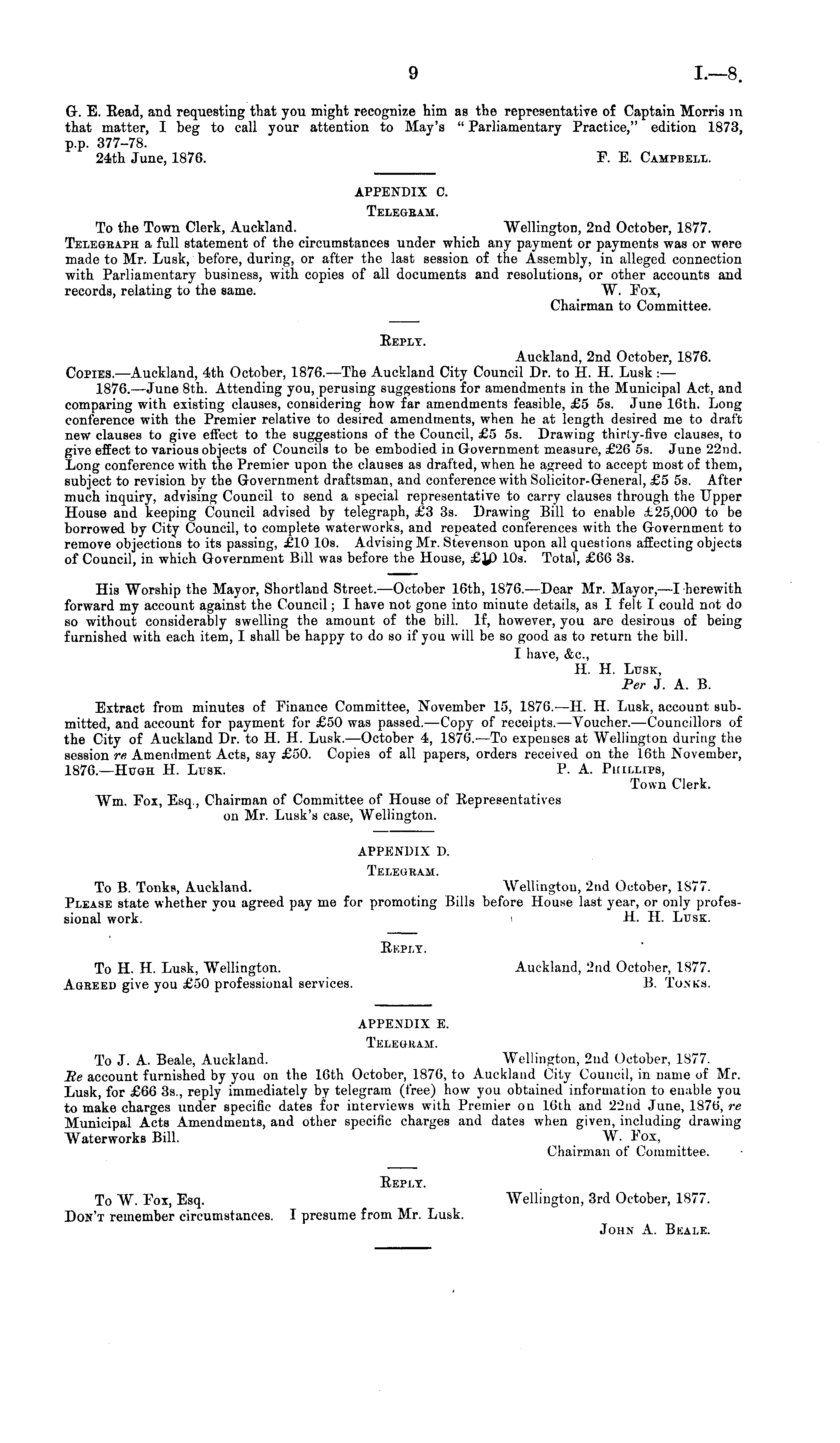 APPENDIX E. Telegram. To J. A. Beale, Auckland. Wellington, 2nd October, 1877. lie account furnished by you on the 16th October, 1870, to Auckland City Council, in name of Mr. Lusk, for £66 35., reply immediately by telegram (tree) how you obtained information to enable you to make charges under specific dates for interviews with Premier on 16th and 22nd June, 1876, re Municipal Acts Amendments, and other specific charges and dates when given, including drawing Waterworks Bill. W. Fox, Chairman of Committee.