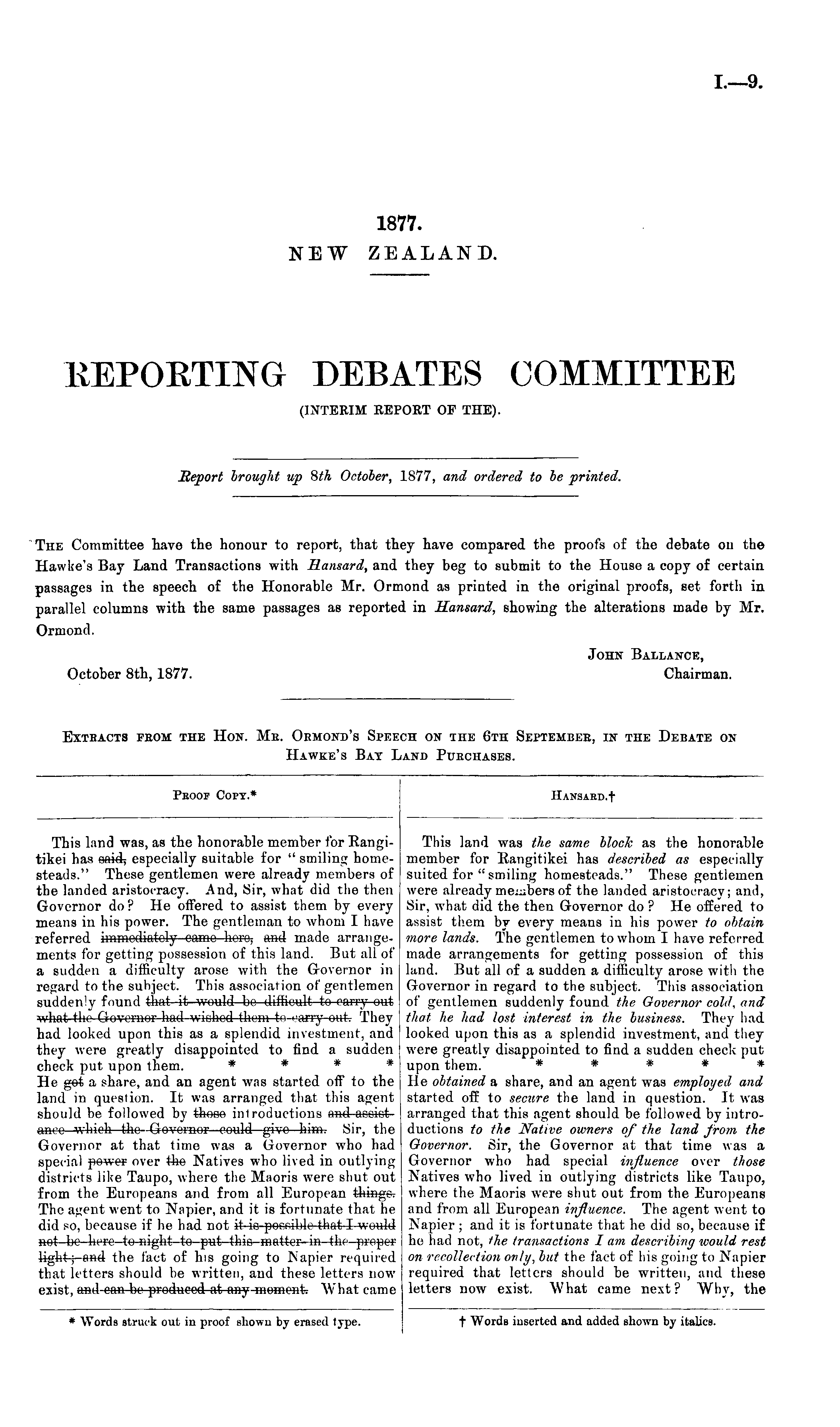The Committee have the honour to report, that they have compared the proofs of the debate on the Hawke's Bay Land Transactions with Hansard, and they beg to submit to the House a copy of certain passages in the speech of the Honorable Mr. Ormond as printed in the original proofs, set forth in parallel columns with the same passages as reported in Hansard, showing the alterations made by Mr. Ormond. John Ballance, October Bth, 1877. Chairman.