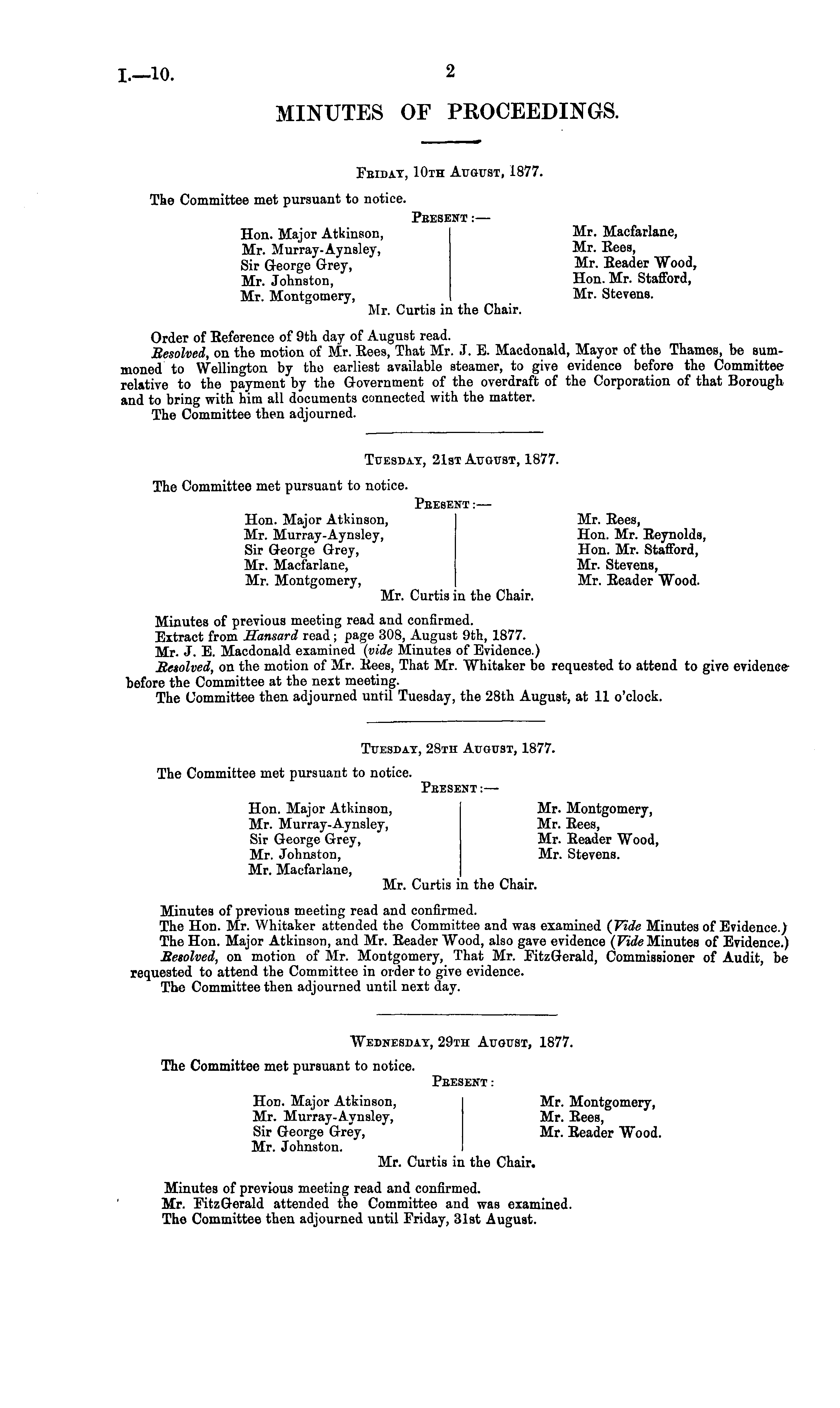 MINUTES OF PKOCEEDINGS. Feiday, 10th August, 1877. The Committee met pursuant to notice. Pbesent : — Hon. Major Atkinson, Mr. Macfarlane, Mr. Murray-Aynsley, Mr. Eees, Sir George Grey, Mr. Eeader Wood, Mr. Johnston, Hon. Mr. Stafford, Mr. Montgomery, Mr. Stevens. Mr. Curtis in the Chair. Order of Eeference of 9th day of August read. Besolved, on the motion of Mr. Eees, That Mr. J. E. Macdonald, Mayor of the Thames, be summoned to Wellington by the earliest available steamer, to give evidence before the Committee relative to the payment by the Government of the overdraft of the Corporation of that Borough and to bring with him all documents connected with the matter. The Committee then adjourned.