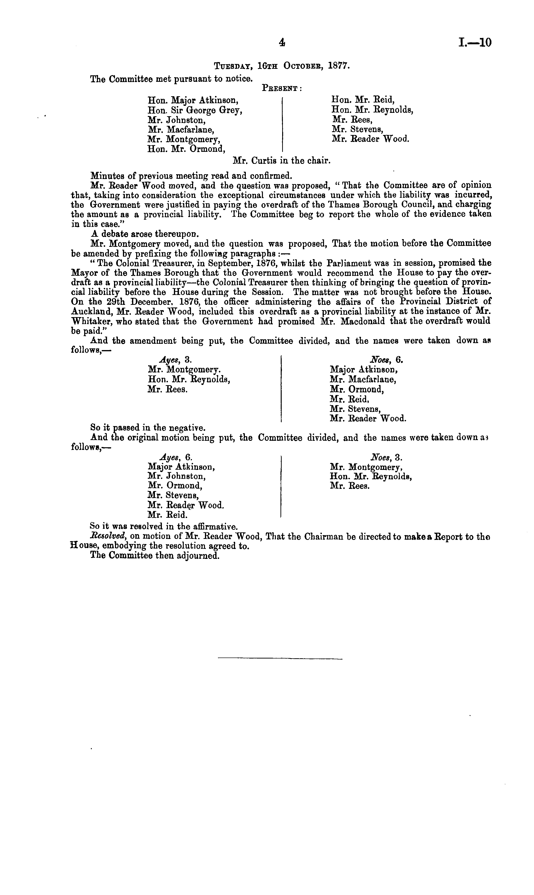 Tuesday, IGth October, 1877. The Committee met pursuant to notice. Peesent: Hon. Major Atkinson, Hon. Mr. Eeid, Hon. Sir George Grey, Hon. Mr. Eeynolds, Mr. Johnston, Mr. Eees, Mr. Macfarlane, Mr. Stevens, Mr. Montgomery, Mr. Eeader Wood. Hon. Mr. Ormond, Mr. Curtis in the chair. Minutes of previous meeting read and confirmed. Mr. Eeader Wood moved, and the question was proposed, " That the Committee are of opinion that, taking into consideration the exceptional circumstances under which the liability was incurred, the Government were justified in paying the overdraft of the Thames Borough Council, and charging the amount as a provincial liability. The Committee beg to report the whole of the evidence taken in this case." A debate arose thereupon. Mr. Montgomery moved, and the question was proposed, That the motion before the Committee be amended by prefixing the following paragraphs : — "The Colonial Treasurer, in September, 1876, whilst the Parliament was in session, promised the Mayor of the Thames Borough that the Government would recommend the House to pay the overdraft as a provincial liability —the Colonial Treasurer then thinking of bringing the question of provincial liability before the House during the Session. The matter was not brought before the House. On the 29th December, 1876, the officer administering the affairs of the Provincial District of Auckland, Mr. Eeader Wood, included this overdraft as a provincial liability at the instance of Mr. Whitaker, who stated that the Government had promised Mr. Macdonald that the overdraft would be paid." And the amendment being put, the Committee divided, and the names were taken down as follows, — Ayes, 3. Noes, 6. Mr. Montgomery. Major Atkinson, Hon. Mr. Eeynolds, Mr. Macfarlane, Mr. Eees. Mr. Ormond, Mr. Eeid, Mr. Stevens, Mr. Eeader Wood. So it passed in the negative. And the original motion being put, the Committee divided, and the names were taken down m follows, — Ayes, 6. Noes, 3. Major Atkinson, Mr. Montgomery, Mr. Johnston, Hon. Mr. Reynolds, Mr. Ormond, Mr. Eees. Mr. Stevens, Mr. Eeader Wood. Mr. Eeid. So it was resolved in the affirmative. Eaolved, on motion of Mr. Eeader Wood, That the Chairman be directed to make a Eeport to the House, embodying the resolution agreed to. The Committee then adjourned.