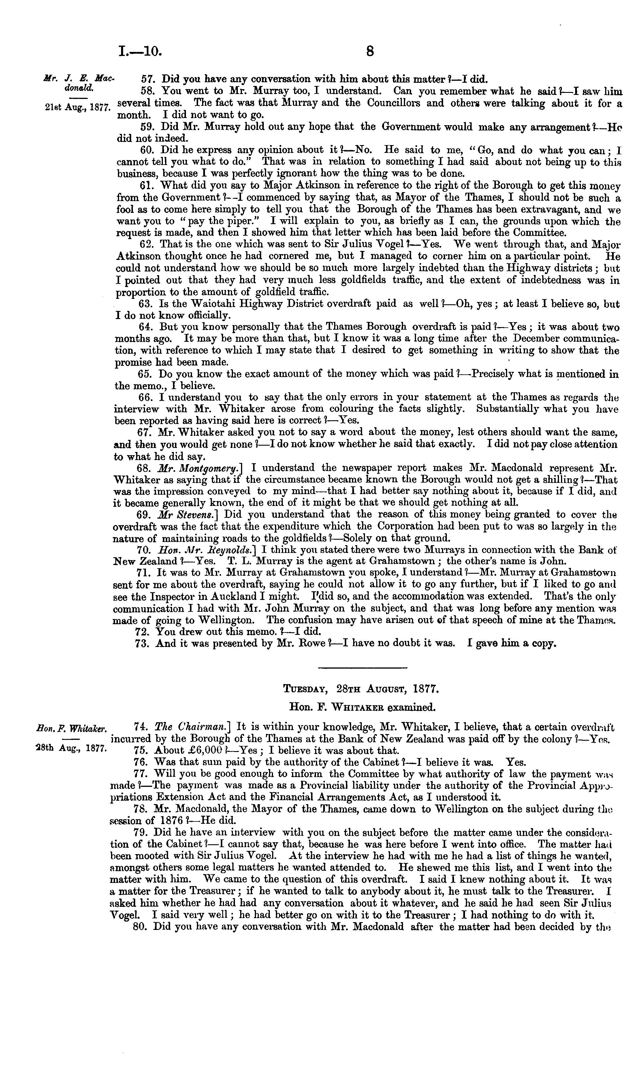 Tuesday, 28th August, 1877. Hon. F. Whitaker examined. 74. The Chairman.] It is within your knowledge, Mr. Whitaker, I believe, that a certain overdraft incurred by the Borough of the Thames at the Bank of New Zealand was paid off by the colony ?—Yrs. 75. About .£6,000 I —Yes ; I believe it was about that. 76. Was that sum paid by the authority of the Cabinet ?—I believe it was. Yes. 77. Will you be good enough to inform the Committee by what authority of law the payment was made ?—The payment was made as a Provincial liability under the authority of the Provincial Appropriations Extension Act and the Financial Arrangements Act, as I understood it. 78. Mr. Macdonald, the Mayor of the Thames, came down to Wellington on the subject during the session of 1876 ?—He did. 79. Did he have an interview with you on the subject before the matter came under the consideration of the Cabinet?—l cannot say that, because he was here before I went into office. The matter had been mooted with Sir Julius Vogel. At the interview he had with me he had a list of things lie wanted, amongst others some legal matters he wanted attended to. He shewed me this list, and I went into the matter with him. We came to the question of this overdraft. I said I knew nothing about it. It was a matter for the Treasurer ; if he wanted to talk to anybody about it, he must talk to the Treasurer. I asked him whether he had had any conversation about it whatever, and he said he had seen Sir Julius Vogel. I said very well; he had better go on with it to the Treasurer ; I had nothing to do with it. 80. Did you have any conversation with Mr. Macdonald after the matter had been decided by tins