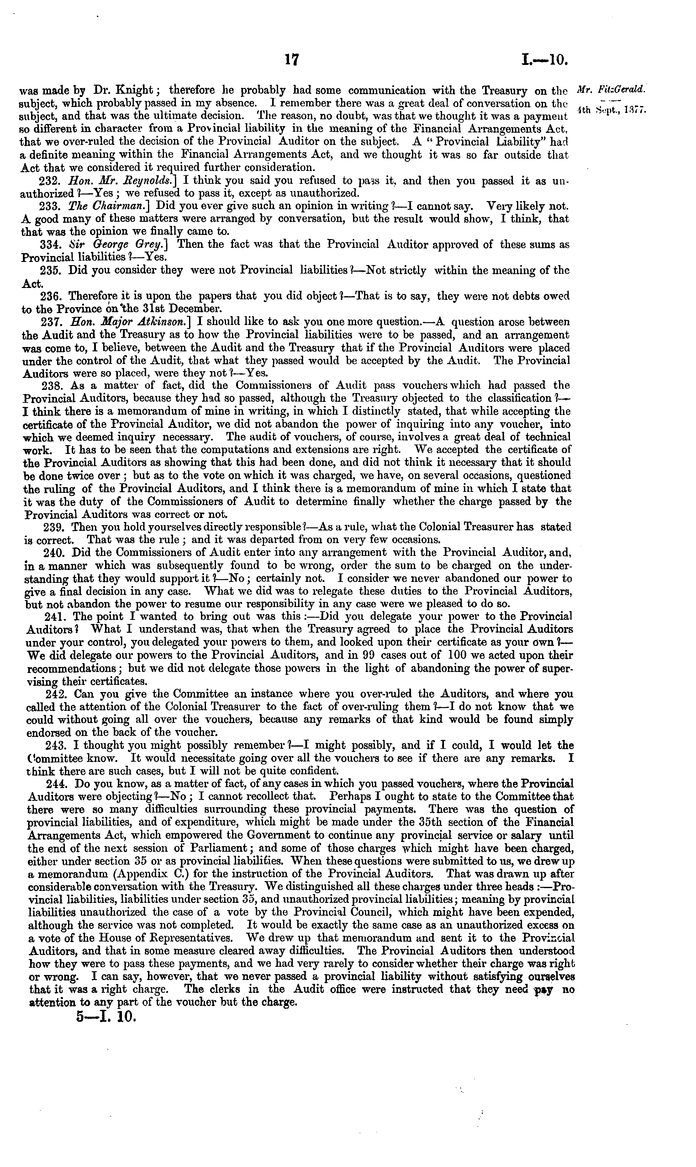 was made by Dr. Knight; therefore lie probably had some communication with the Treasury on the subject, which probably passed in my absence. 1 remember there was a great deal of conversation on thr subject, and that was the ultimate decision. The reason, no doubt, was that we thought it was a payment so different in character from a Provincial liability in the meaning of the Financial Arrangements Act, that we over-ruled the decision of the Provincial Auditor on the subject. A " Provincial Liability" had a definite meaning within the Financial Arrangements Act, and we thought it was so far outside that Act that we considered it required further consideration. 232. Hon. Mr. Reynolds.] I think you said you refused to pass it, and then you passed it as unauthorized I —Yes ; we refused to pass it, except as unauthorized. 233. The Chairman.] Did you ever give such an opinion in writing I —l cannot say. Very likely not. A good many of these matters were arranged by conversation, but the result would show, I think, that that was the opinion we finally came to. 334. Sir George Grey.] Then the fact was that the Provincial Auditor approved of these sums as Provincial liabilities I —Yes. 235. Did you consider they were not Provincial liabilities'(—Not strictly within the meaning of the Act. 236. Therefore it is upon the papers that you did object ? —That is to say, they were not debts owed to the Province on'the 31st December. 237. Hon. Major Atkinson.] I should like to ask you one more question.—A question arose between the Audit and the Treasury as to how the Provincial liabilities were to be passed, and an arrangement was come to, I believe, between the Audit and the Treasury that if the Provincial Auditors were placed under the control of the Audit, that what they passed would be accepted by the Audit. The Provincial Auditors were so placed, were they not t —Yes. 238. As a matter of fact, did the Commissioners of Audit pass vouchers which had passed the Provincial Auditors, because they had so passed, although the Treasury objected to the classification ?— I think there is a memorandum of mine in writing, in which I distinctly stated, that while accepting the certificate of the Provincial Auditor, we did not abandon the power of inquiring into any voucher, intc which we deemed inquiry necessary. The audit of vouchers, of course, involves a great deal of technica work. It has to be seen that the computations and extensions are right. We accepted the certificate o; the Provincial Auditors as showing that this had been done, and did not think it necessary that it shouk be done twice over ; but as to the vote on which it was charged, we have, on several occasions, questionec the ruling of the Provincial Auditors, and I think there is a memorandum of mine in which I state thai it was the duty of the Commissioners of Audit to determine finally whether the charge passed by th< Provincial Auditors was correct or not. 239. Then you hold yourselves directly responsible!—As a rule, what the Colonial Treasurer has statei is correct. That was the rule ; and it was departed from on very few occasions. 240. Did the Commissioners of Audit enter into any arrangement with the Provincial Auditor, and in a manner which was subsequently found to bo wrong, order the sum to be charged on the under standing that they would support it %— -No; certainly not. I consider we never abandoned our power t< give a final decision in any case. What we did was to relegate these duties to the Provincial Auditors but not abandon the power to resume our responsibility in any case were we pleased to do so. 241. The point I wanted to bring ovit was this : —Did you delegate your power to the Provincia Auditors 1 What I understand was, that when the Treasury agreed to place the Provincial Auditor under your control, you delegated your powers to them, and looked upon their certificate as your own?— We did delegate our powers to the Provincial Auditors, and in 99 cases out of 100 we acted upon thei recommendations; but we did not delegate those powers in the light of abandoning the power of super vising their certificates. 242. Can you give the Committee an instance where you over-ruled the Auditors, and where yoi called the attention of the Colonial Treasurer to the fact of over-ruling them ?—I do not know that w could without going all over the vouchers, because any remarks of that kind would be found simpl; endorsed on the back of the voucher. 243. I thought you might possibly remember ?—I might possibly, and if I could, I would let th Committee know. It would necessitate going over all the vouchers to see if there are any remarks, think there are such cases, but I will not be quite confident. 244. Do you know, as a matter of fact, of any cases in which you passed vouchers, where the Provincia Auditors were objecting?—No ; I cannot recollect that. Perhaps I ought to state to the Committeetha there were so many difficulties surrounding these provincial payments. There was the question c provincial liabilities, and of expenditure, which might be made under the 35th section of the Financia Arrangements Act, which empowered the Government to continue any provincial service or salary unti the end of the next session of Parliament; and some of those charges which might have been charged either under section 35 or as provincial liabilities. When these questions were submitted to us, we drew v a memorandum (Appendix C.) for the instruction of the Provincial Auditors. That was drawn up afte considerable conversation with the Treasury. We distinguished all these charges under three heads :—Prc vincial liabilities, liabilities under section 35, and unauthorized provincial liabilities; meaning by provincic liabilities unauthorized the case of a vote by the Provincial Council, which might have been expendec although the service was not completed. It would be exactly the same case as an unauthorized excess o a vote of