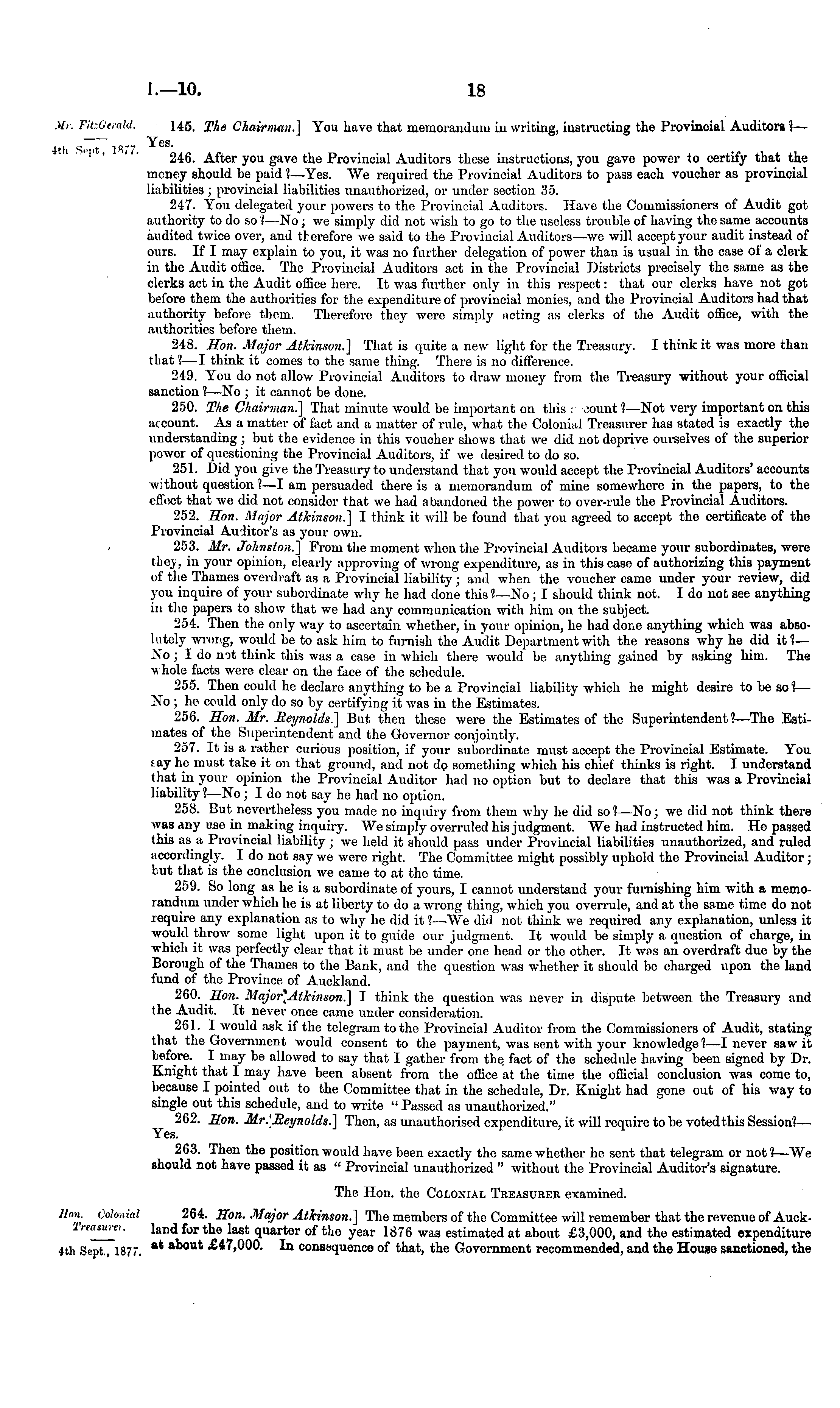 145. The Chairman.] You Lave that memorandum in writing, instructing the Provincial Auditors ?— Yes. 246. After you gave the Provincial Auditors these instructions, you gave power to certify that the mcney should be paid I —Yes. We required the Provincial Auditors to pass each voucher as provincial liabilities ; provincial liabilities unauthorized, or under section 35. 247. You delegated your powers to the Provincial Auditors. Have the Commissioners of Audit got authority to do so I —No; we simply did not wish to go to the useless trouble of having the same accounts audited twice over, and therefore we said to the Provincial Auditors —we will accept your audit instead of ours. If I may explain to you, it was no further delegation of power than is usual in the case of a clerk in the Audit office. The Provincial Auditors act in the Provincial Districts precisely the same as the clerks act in the Audit office here. It was further only in this respect: that our clerks have not got before them the authorities for the expenditure of provincial monies, and the Provincial Auditors had that authority before them. Therefore they were simply acting as clerks of the Audit office, with the authorities before them. 248. Hon. Major Atkinson.] That is quite a new light for the Treasury. I think it was more than that ?—I think it comes to the same thing. There is no difference. 249. You do not allow Provincial Auditors to draw money from the Treasury -without your official sanction ?—No ; it cannot be done. 250. The Chairman.] That minute would be important on this : count ?—Not very important on this account. As a matter of fact and a matter of rule, what the Colonial Treasurer has stated is exactly the understanding ; but the evidence in this voucher shows that we did not deprive ourselves of the superior power of questioning the Provincial Auditors, if we desired to do so. 251. Bid you give the Treasury to understand that you would accept the Provincial Auditors' accounts without question?—l am persuaded there is a memorandum of mine somewhere in the papers, to the effect that we did not consider that we had a bandoned the power to over-rule the Provincial Auditors. 252. Hon. Major Atkinson.] I think it will be found that you agreed to accept the certificate of the Provincial Auditor's as your own. 253. Mr. Johnston.] From the moment when the Provincial Auditors became your subordinates, were they, in your opinion, clearly approving of wrong expenditure, as in this case of authorizing this payment of the Thames overdraft as a Provincial liability ■ and when the voucher came under your review, did you inquire of your subordinate why he had done this?—No; I should think not. Ido not see anything in the papers to show that we had any communication with him on the subject. 254. Then the only way to ascertain whether, in your opinion, he had done anything which was absolutely wiling, would be to ask him to furnish the Audit Department with the reasons why he did it?— No; Ido not think this was a case in which there would be anything gained by asking him. The whole facts were clear on the face of the schedule. 255. Then could he declare anything to be a Provincial liability which he might desire to be so ?— No ; he could only do so by certifying it was in the Estimates. 256. Hon. Mr. Reynolds.] But then these were the Estimates of the Superintendent?— The Estimates of the Superintendent and the Governor conjointly. 257. It is a rather curious position, if your subordinate must accept the Provincial Estimate. You tay he must take it on that ground, and not dp something which his chief thinks is right. I understand that in your opinion the Provincial Auditor had no option but to declare that this was a Provincial liability?—No; I do not say he had no option. 258. But nevertheless you made no inquiry from them why he did so ?—No; we did not think there was any use in making inquiry. Wo simply overruled his judgment. We had instructed him. He passed this as a Provincial liability ; we held it should pass under Provincial liabilities unauthorized, and ruled accordingly. Ido not say we were right. The Committee might possibly uphold the Provincial Auditor; but that is the conclusion we came to at the time. 259. So long as he is a subordinate of yours, I cannot understand your furnishing him with a memorandum under whicli he is at liberty to do a wrong thing, which you overrule, and at the same time do not require any explanation as to why he did it ?—We did not think we required any explanation, unless it would throw some light upon it to guide our judgment. It would be simply a question of charge, in whicli it was perfectly clear that it must be under one head or the other. It wns an overdraft due by the Borough of the Thames to the Bank, and the question was whether it should bo charged upon the land fund of the Province of Auckland. 260. Hon. Major\Atkinson.] I think the question was never in dispute between the Treasury and (he Audit. It never once came under consideration. 261. I would ask if the telegram to the Provincial Auditor from the Commissioners of Audit, stating that the Government would consent to the payment, was sent with your knowledge ?—I never saw it before. I may be allowed to say that I gather from the fact of the schedule having been signed by Dr. Knight that I may have been absent from the office at the time the official conclusion was come to, because I pointed out to the Committee that in the schedule, Dr. Knight had gone out of his way to single out this schedule, and to write " Passed as unauthorized." 262. Hon. Mr.'Reynolds.] Then, as unauthorised expenditure, it will require to be voted this Session?— Yes. 263. Then the position would have been exactly the same whether he sent that telegram or not ?—We should not have passed it as " Provincial unauthorized " without the Provincial Auditor's signature. The Hon. the Colonial Treasurer examined. 264