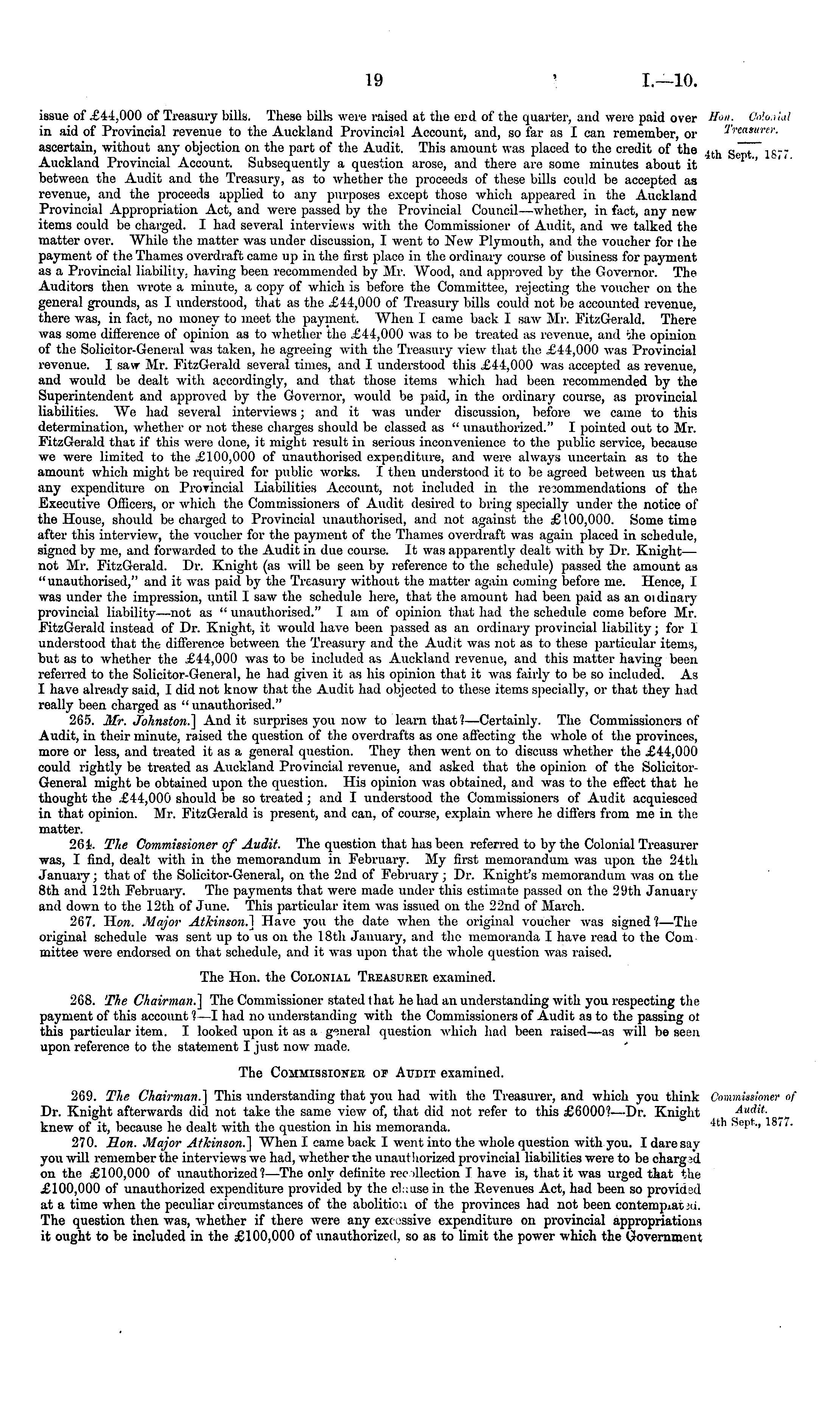 issue of .£44,000 of Treasury bills. These bills were raised at the ecd of the quarter, and were paid over in aid of Provincial revenue to the Auckland Provincial Account, and, so far as I can remember, or ascertain, without any objection on the part of the Audit. This amount was placed to the credit of the Auckland Provincial Account. Subsequently a question arose, and there are some minutes about it between the Audit and the Treasury, as to whether the proceeds of these bills could be accepted as revenue, and the proceeds applied to any purposes except those which appeared in the Auckland Provincial Appropriation Act, and were passed by the Provincial Council—whether, in fact, any new items could be charged. I had several interviews with the Commissioner of Audit, and we talked the matter over. While the matter was under discussion, I went to New Plymouth, and the voucher for the payment of the Thames overdraft came up in the first place in the ordinary course of business for payment as a Provincial liability, having been recommended by Mr. Wood, and approved by the Governor. The Auditors then wrote a minute, a copy of which is before the Committee, rejecting the voucher on the. general grounds, as I understood, that as the £44,000 of Treasury bills could not be accounted revenue, there was, in fact, no money to meet the payment. When I came back I saw Mr. FitzGerald. There was some difference of opinion as to whether the =£44,000 was to be treated as revenue, and she opinion of the Solicitor-General was taken, he agreeing with the Treasury view that the £44,000 was Provincial revenue. I sa\r Mr. FitzGerald several times, and I understood this £44,000 was accepted as revenue, and would be dealt with accordingly, and that those items which had been recommended by the Superintendent and approved by the Governor, would be paid, in the ordinary course, as provincial liabilities. We had several interviews; and it was under discussion, before we came to this determination, whether or not these charges should be classed as " unauthorized." I pointed out to Mr. FitzGerald that if this were done, it might result in serious inconvenience to the public service, because we were limited to the £100,000 of unauthorised expenditure, and were always uncertain as to the amount which might be required for public works. I then understood it to be agreed between us that any expenditure on Provincial Liabilities Account, not included in the recommendations of the Executive Officers, or which the Commissioners of Audit desired to bring specially under the notice of the House, should be charged to Provincial unauthorised, and not against the £ 100,000. Some time after this interview, the voucher for the payment of the Thames overdraft was again placed in schedule, signed by me, and forwarded to the Audit in due course. It was apparently dealt with by Dr. Knight— not Mr. FitzGerald. Dr. Knight (as will be seen by reference to the schedule) passed the amount as " unauthorised," and it was paid by the Treasury without the matter again coming before me. Hence, I was under the impression, until 1 saw the schedule here, that the amount had been paid as an oi dinary provincial liability—not as " unauthorised." I am of opinion that had the schedule come before Mr. FitzGeraid instead of Dr. Knight, it would have been passed as an ordinary provincial liability; for 1 understood that the difference between the Treasury and the Audit was not as to these particular items, but as to whether the £44,000 was to be included as Auckland revenue, and this matter having been referred to the Solicitor-General, he had given it as his opinion that it was fairly to be so included. As I have already said, I did not know that the Audit had objected to these items specially, or that they had really been charged as " unauthorised." 265. Mr. Johnston.] And it surprises yovi now to learn that?— Certainly. The Commissioners of Audit, in their minute, raised the question of the overdrafts as one affecting the whole of the provinces, more or less, and treated it as a general question. They then went on to discuss whether the £44,000 could rightly be treated as Auckland Provincial revenue, and asked that the opinion of the SolicitorGeneral might be obtained upon the question. His opinion was obtained, and was to the effect that he thought the £44,000 should be so treated; and I understood the Commissioners of Audit acquiesced in that opinion. Mr. FitzGerald is present, and can, of course, explain where he differs from me in the matter. 261. The Commissioner of Audit. The question that has been referred to by the Colonial Treasurer was, I find, dealt with in the memorandum in February. My first memorandum was upon the 24th January; that of the Solicitor-General, on the 2nd of February ; Dr. Knight's memorandum was on the Bth and 12th February. The payments that were made under this estimate passed on the 29th January and down to the 12th of June. This particular item was issued on the 22nd of Mai'ch. 267. Hon. Major Atkinson.] Have you the date when the original voucher was signed?— The original schedule was sent up to us on the 18th January, and the memoranda I have read to the Committee were endorsed on that schedule, and it was upon that the whole question was raised. The Hon. the Colonial Treasurer examined. 2GB. The Chairman.] The Commissioner stated that he had an understanding with you respecting the payment of this account ?—I had no understanding with the Commissioners of Audit as to the passing oi this particular item. I looked upon it as a general question which had been raised—as will be seen upon reference to the statement I just now made. The Commissioner of Audit examined. 269. The Chairman.] This understanding that you had with the Treasurer, and which you think Dr. Knight afterwai-ds did not take the same view of, that did not refer to this £6000?— Dr. Knight knew of it, because he dealt with the qu