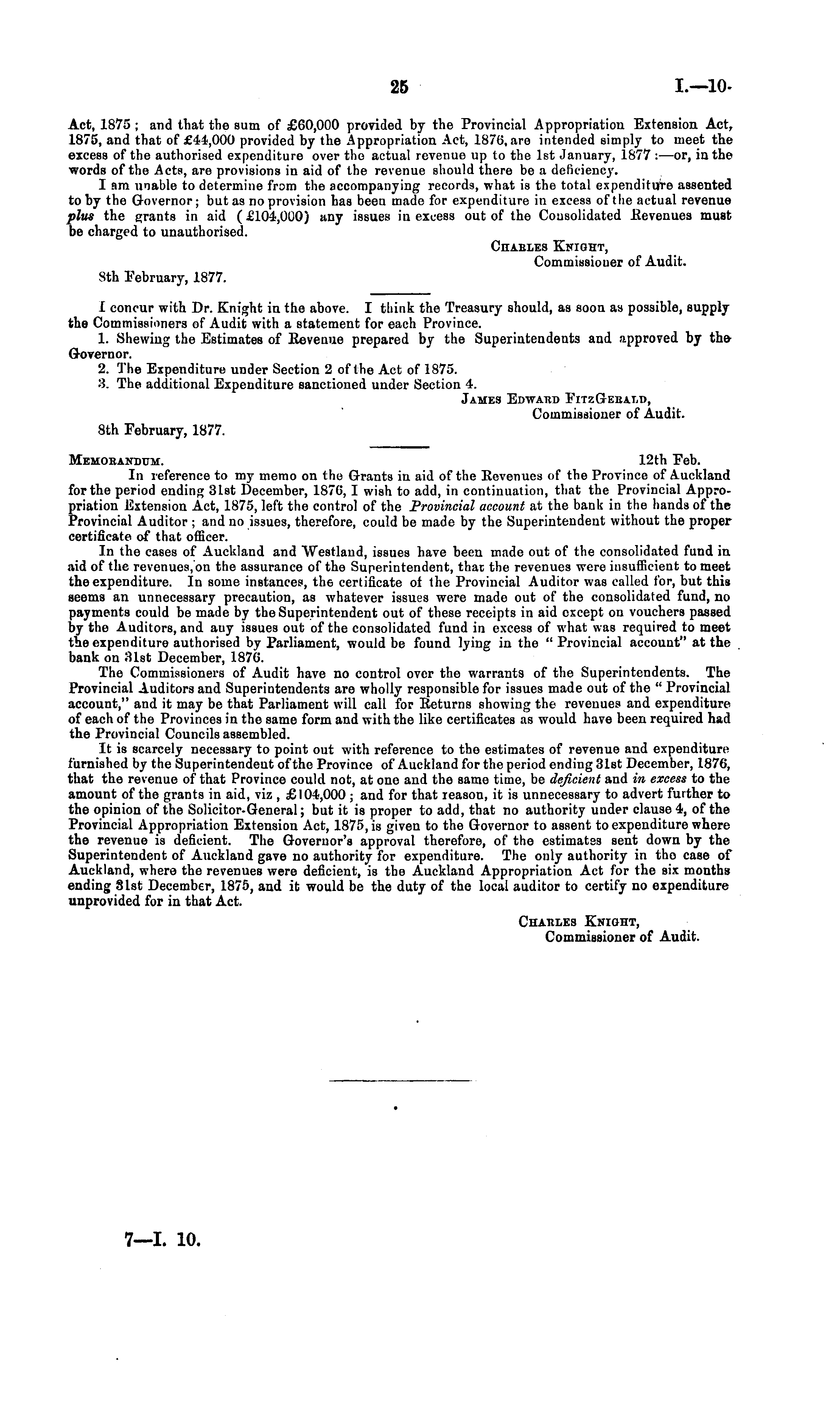 Act, 1875 ; and that the sum of £60,000 provided by the Provincial Appropriation Extension Act, 1875, and that of £44,000 provided by the Appropriation Act, 1876, are intended simply to meet the excess of the authorised expenditure over the actual revenue up to the Ist January, 1877 : —or, in the words of the Acts, are provisions in aid of the revenue should there be a deh'cienc}'. I nm unable to determine from the accompanying records, ■what is the total expenditure assented toby the Governor; but as no provision has been made for expenditure in excess of the actual revenue plus the grants in aid (£104,000) any issues in excess out of the Cousolidated Revenues must be charged to unauthorised. Ceaeles Knight, Commissioner of Audit. Sth February, 1877. 1 concur with Dr. Knight in the above. I think the Treasury should, as soon as possible, supply the Commissioners of Audit with a statement for each Province. 1. Shewing the Estimates of Revenue prepared by the Superintendents and approved by theGovernor. 2. The Expenditure under Section 2 of the Act of 1875. 3. The additional Expenditure sanctioned under Section 4. James Edward FitzGebald, Commissioner of Audit. Bth February, 1877. Memobandum. 12th Feb. In reference to my memo on the Grants in aid of the Revenues of the Province of Auckland for the period ending 31st December, 187(5, I wish to add, in continuation, that the Provincial Appropriation Extension Act, 1875, left the control of the Provincial account at the bank in the hands of the Provincial Auditor ; and no issues, therefore, could be made by the Superintendent without the proper certificate of that officer. In the cases of Auckland and Westland, issues have been made out of the consolidated fund in aid of the revenues,on the assurance of the Superintendent, that the revenues were insufficient to meet the expenditure. In some instances, the certificate of the Provincial Auditor was called for, but this seems an unnecessary precaution, as whatever issues were made out of the consolidated fund, no payments could be made by the Superintendent out of these receipts in aid except on vouchers passed by the Auditors, and auy issues out of the consolidated fund in excess of what was required to meet the expenditure authorised by Parliament, would be found lying in the " Provincial account" at the bank on 31st December, 1876. The Commissioners of Audit have no control over the warrants of the Superintendents. The Provincial Auditors and Superintendents are wholly responsible for issues made out of the " Provincial account," and it may be that Parliament will call for Returns showing the revenues and expenditure of each of the Provinces in the same form and with the like certificates as would have been required had the Provincial Councils assembled. It is scarcely necessary to point out with reference to the estimates of revenue and expenditure furnished by the Superintendent of the Province of Auckland for the period ending 31st December, 1876, that the revenue of that Province could not, at one and the same time, be deficient and in excess to the amount of the grants in aid, viz , £104,000 ; and for that reason, it is unnecessary to advert further to the opinion of the Solicitor-General; but it is proper to add, that no authority under clause 4, of the Provincial Appropriation Extension Act, 1875, is given to the Governor to assent to expenditure where the revenue is deficient. The Governor's approval therefore, of the estimates sent down by the Superintendent of Auckland gave no authority for expenditure. The only authority in tho case of Auckland, where the revenues were deficient, is the Auckland Appropriation Act for the six months ending 31st December, 1875, and it would be the duty of the local auditor to certify no expenditure unprovided for in that Act. Chahles Knight, Commissioner of Audit. 7—l. 10.