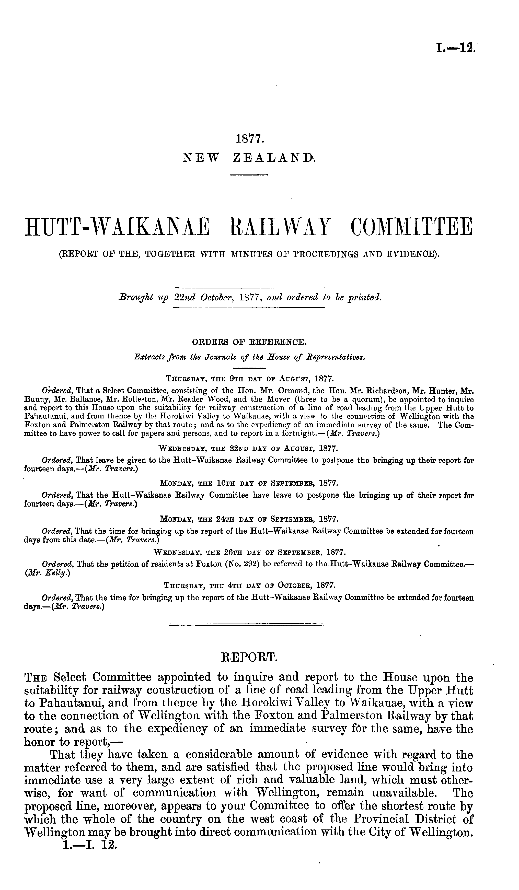 Thubsday, the 9th day op August, 1877. Ordered, That a Select Committee, consisting of the Hon. Mr. Ormond, the Hon. Mr. Richardson, Mr. Hunter, Mr. Bunny, Mr. Ballance, Mr. Rolleston, Mr. Reader Wood, and the Morer (three to be a quorum), be appointed to inquire and report to this House upon the suitability for railway construction of a line of road leading from the Upper Hutt to Paliautanui, and from t.hence by the Horokiwi Valley to Waikanae, with a view to the connection of Wellington with the Foxton and Palmerston Railway by that route ; and as to the expediency of an immediate survey of the same. The Committee to have power to call for papers and persons, and to report in a fortnight.— (Mr. Travers) Wednesday, the 22nd day op Aughtst, 1877. Ordered, That leave be given to the Hutt-Waikanae Railway Committee to postpone the bringing up their report for fourteen days. — {Mr. Travers.) Monday, the 10th day of September, 1877. Ordered, That the Hutt-Waikanae Railway Committee have leave to postpone the bringing up of their report for fourteen days. — (Mr. Travers) Mosday, the 24th day or Septembeb, 1877. Ordered, That the time for bringing up the report of the Hutt-Waikanae Railway Committee be extended for fourteen days from this date.— (Mr. Travers) Wednesday, the 26th day op September, 1877. Ordered, That the petition of residents at Foxton (No. 292) be referred to the.Hutt-Waikanao Railway Committee.— (Mr. Kelly.) Thursday, the 4th day op October, 1877. Ordered, That the time for bringing up the report of the Hutt-Waikanae Railway Committee be extended for fourteen days.— (Mr. Travers)