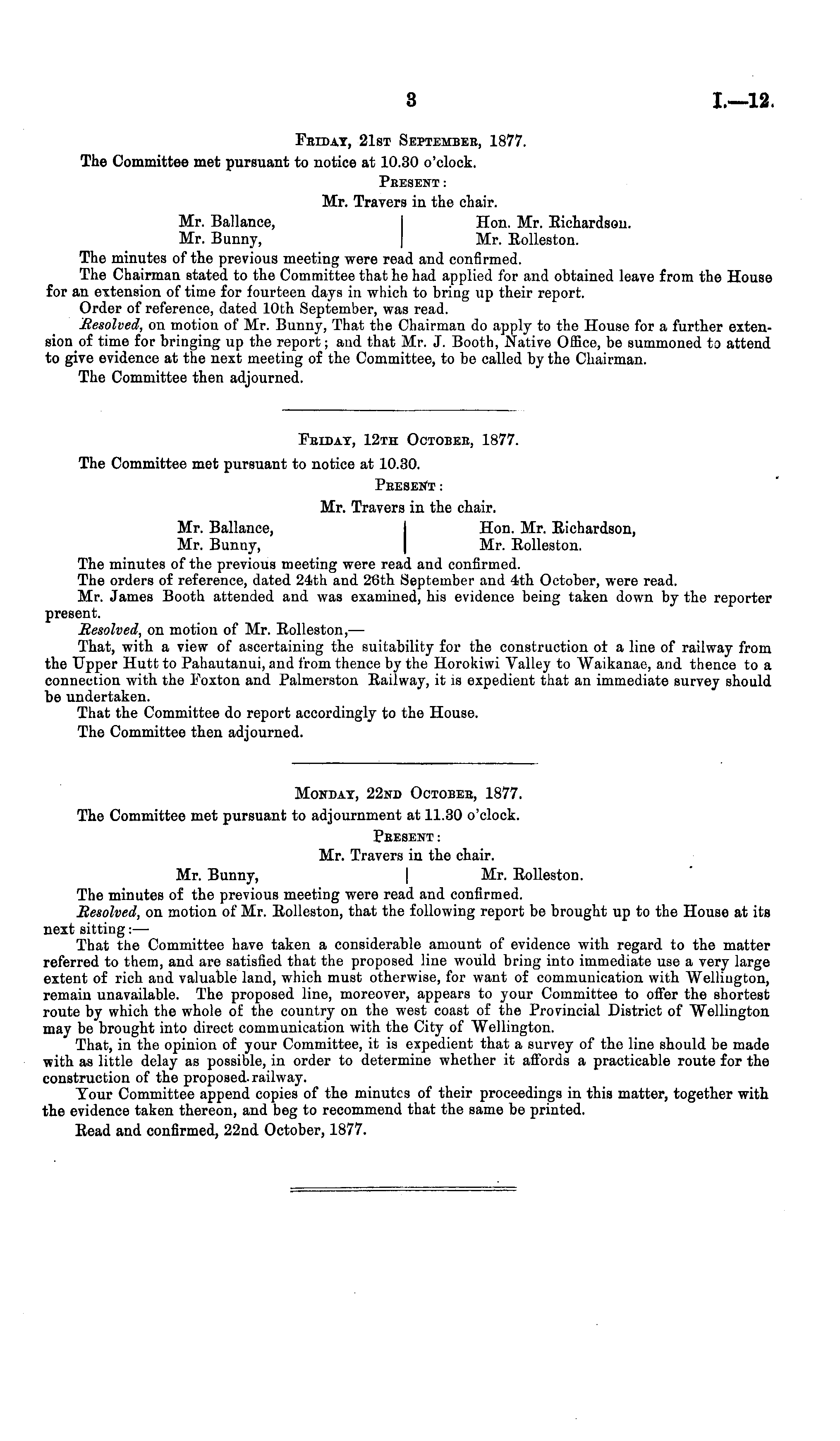 Monday, 22nd Octobeb, 1877. The Committee met pursuant to adjournment at 11.30 o'clock. Pbesent: Mr. Travers in the chair. Mr. Bunny, Mr. Eolleston. The minutes of the previous meeting were read and confirmed. Resolved, on motion of Mr. Eolleston, that the following report be brought up to the House at its next sitting:— That the Committee have taken a considerable amount of evidence with regard to the matter referred to them, and are satisfied that the proposed line would bring into immediate use a very large extent of rich and valuable land, which must otherwise, for want of communication with Wellington, remain unavailable. The proposed line, moreover, appears to your Committee to offer the shortest route by which the whole of the country on the west coast of the Provincial District of Wellington may be brought into direct communication with the City of Wellington. That, in the opinion of your Committee, it is expedient that a survey of the line should be made with as little delay as possible, in order to determine whether it affords a practicable route for the construction of the proposed, railway. Tour Committee append copies of the minutes of their proceedings in this matter, together with the evidence taken thereon, and beg to recommend that the same be printed. Bead and confirmed, 22nd October, 1877.