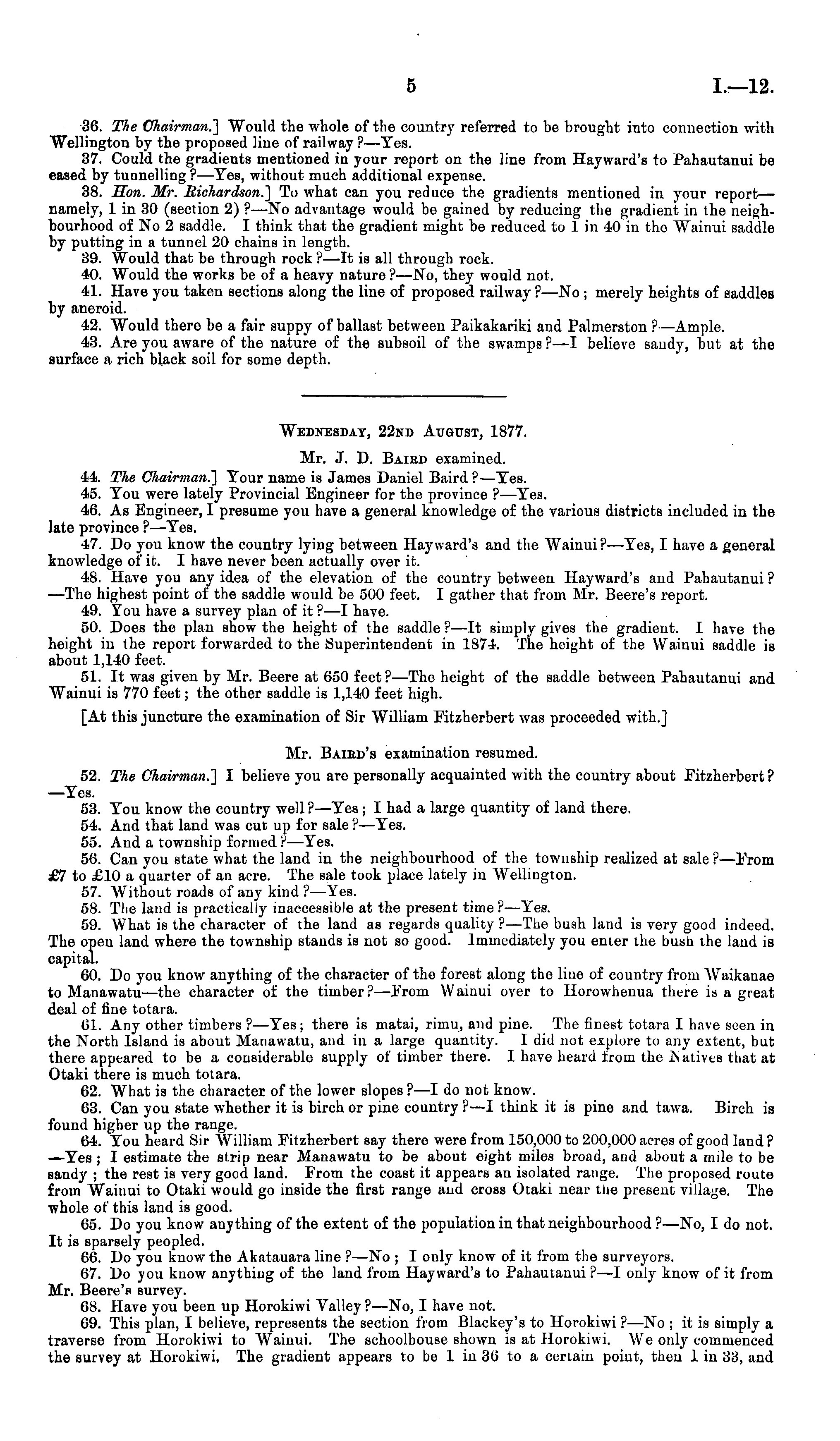 Wednesday, 22nd August, 1877. Mr. J. D. Baied examined. 44. The Chairman] Tour name is James Daniel Baird ?—Tes. 45. You were lately Provincial Engineer for the province ? —Tes. 46. As Engineer, I presume you have a general knowledge of the various districts included iv the late province ? —Tes. 47. Do you know the country lying between Hay ward's and the Wainui?—Tes, I have a general knowledge of it. I have never been actually over it. 48. Have you any idea of the elevation of the country between Hayward's and Pahautanui ? —The highest point of the saddle would be 500 feet. I gather that from Mr. Beere's report. 49. You have a survey plan of it ? —I have. 50. Does the plan show the height of the saddle ?—lt simply gives the gradient. I have the height in the report forwarded to the Superintendent in 1874. The height of the Wainui saddle is about 1,140 feet. 51. It was given by Mr. Beere at 650 feet?— The height of the saddle between Pahautanui and Wainui is 770 feet; the other saddle is 1,140 feet high. [At this juncture the examination of Sir William Fitzherbert was proceeded with.] Mr. Baied's examination resumed. 52. The Chairman.'] I believe you are personally acquainted with the country about Fitzherbert? —Tes. 53. Tou know the country well? —Tes ; I had a large quantity of land there. 54. And that land was cut up for sale ? —Tes. 55. And a township formed r —Yes. 56. Can you state what the land in the neighbourhood of the township realized at sale?— From £7 to £10 a quarter of an acre. The sale took place lately in Wellington. 57. AVithout roads of any kind ? —Yes. 58. Tlie land is practically inaccessible at the present time? —Yes. 59. What is the character of the land as regards quality ?—The bush land is very good indeed. The open land where the township stands is not so good. Immediately you enter the bush the land is capital. 60. Do you know anything of the character of the forest along the line of country from Waikanae to Manawatu —the character of the timber? —From Waiuui over to Horowlienua there is a great deal of line totara. 61. Any other timbers ?—Tes; there is matai, rirnu, and pine. The finest totara I have seen in the 'North Island is about Manawatu, and in a large quantity. I did not explore to any extent, but there appeared to be a considerable supply of timber there. I have heard from the JSatives that at Otaki there is much totara. 62. What is the character of the lower slopes ? —I do not know. 63. Can you state whether it is birch or pine country? —I think it is pine and tawa. Birch is found higher up the range. 64. Tou heard Sir William Fitzherbert say there were from 150,000 to 200,000 acres of good land ? —Tes ; I estimate the strip near Manawatu to be about eight miles broad, and about a mile to be sandy ; the rest is very good land. From the coast it appears an isolated range. The proposed route from Wainui to Otaki would go inside the first range and cross Otaki near the present village. The whole of this land is good. 65. Do you know auything of the extent of the population in that neighbourhood ?—No, I do not. It is sparsely peopled. 66. Do you know the Akatauara line ? —No ; I only know of it from the surveyors. 67. Do you know anything of the land from Hayward's to Pahautanui ? —I only know of it from Mr. Beere's survey. 68. Have you been up Horokivvi Valley ? —No, I have not. 69. This plan, I believe, represents the section from Blackey's to Horokiwi ? —No ; it is simply a traverse from Horokiwi to Wainui. The sehoolhouse shown is at Horokivvi. We only commenced the survey at Horokiwi. The gradient appears to be 1 in 30 to a certain point, then lin 33, and