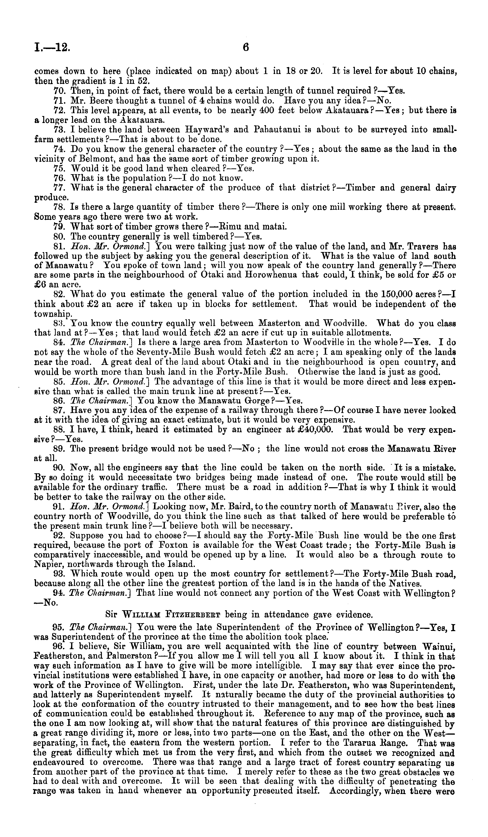 comes down to here (place indicated on map) about 1 in 18 or 20. It is level for about 10 chains, then the gradient is 1 in 52. 70. Then, in point of fact, there would be a certain length of tunnel required ?—Tes. 71. Mr. Beere thought a tunnel of 4 chains would do. Have you any idea?— No. 72. This level appears, at all events, to be nearly 400 feet below Akatauara?—Tes ; but there is a longer lead on the Akatauara. 73. I believe the land between Hayward's and Pahautanui is about to be surveyed into smallfarm settlements ? —That is about to be done. 74. Do you know the general character of the country ? —Yes ; about the same as the land in the vicinity of Belmont, and has the same sort of timber growing upon it. 75. Would it be good land when cleared ? —Yes. 76. "What is the population ? —I do not know. 77. What is the general character of the produce of that district ? —Timber and general dairy produce. 78. Is there a large quantity of timber there ? —There is only one mill working there at present. Some years ago there were two at work. 79. What sort of timber grows there ? —Rimu and matai. 80. The country generally is well timbered ? —Yes. 81. Hon. Mr. Ormond.] You were talking just now of the value of the land, and Mr. Travers has followed up the subject by asking you the general description of it. What is the value of land south of Manawatu? You spoke of town land ; will you now speak of the country land generally?— There are some parts in the neighbourhood of Otaki and Horowhenua that could, I think, be sold for £5 or £6 an acre. 82. What do you estimate the general value of the portion included in the 150,000 acres ?—I think about £2 an acre if taken up in blocks for settlement. That would be independent of the township. 8;$. You know the country equally well between Masterton and Woodville. What do you class that land at ?—Yes; that laud would fetch £2 an acre if cut up in suitable allotments. 84. The Chainnan.~\ Is there a large area from Masterton to Woodviile in the whole?— Yes. Ido not say the whole of the Seventy-Mile Bush would fetch £2 an acre; I am speaking only of the lands near the road. A great deal of the land about Otaki and in the neighbourhood is open country, and would be worth more than bush land in the Forty-Mile Bush. Otherwise the laud is just as good. 85. ILon. Mr. Ormond.] The advantage of this line is that it would be more direct and less expensive than what is called the main trunk line at present? —Yes. 86. The Chairman.] You know the Manawatu Gorge?— Yes. 87. Have you any idea of the expense of a railway through there ?—Of course I have never looked at it with the idea of giving an exact estimate, but it would be very expensive. 88. I have, I think, heard it estimated by an engineer at £40,000. That would be very expensive ? —Yes. 89. The present bridge would not be used ?—-No ; the line would not cross the Manawatu River at all. 90. Now, all the engineers say that the line could be taken on the north side. It is a mistake. By so doing it would necessitate two bridges being made instead of one. The route would still be available for the ordinary traffic. There must be a road in addition ? —That is why I think it would be better to take the railway on the other side. 91. Hon. Mr. Ormond.] Looking now, Mr. Baird, to the country north of Manawatu TMver, also the country north of Woodville, do you think the line such as that talked of here would be preferable to the present main trunk line ? —I believe both will be necessary. 92. Suppose you had to choose? —I should say the Forty-Mile Bush line would be the one first required, because the port of Foxton is available for the West Coast trade; the Forty-Mile Bush is comparatively inaccessible, and would be opened up by a line. It would also be a through route to Napier, northwards through the Island. 93. Which route would open up the most country for settlement?— The Forty-Mile Bush road, because along all the other line the greatest portion of the land is in the hands of the Natives. 94. The Chairman.] That line would not connect any portion of the AVest Coast with Wellington? —No. Sir William Fitzheebeet being in attendance gave evidence. 95. The Chairman.] You were the late Superintendent of the Province of Wellington?— Yes, I was Superintendent of the province at the time the abolition took place. 96. I believe, Sir William, you are well acquainted with the line of country between Wainui, Featherston, and Palmerston ? —lf you allow me I will tell you all I know about it. I think in that way such information as I have to give will be more intelligible. I may say that ever since the provincial institutions were established I have, in one capacity or another, had more or less to do with the work of the Province of Wellington. First, under the late Dr. Featherston, who was Superintendent, and latterly as Superintendent myself. It naturally became the duty of the provincial authorities to look at the conformation of the country intrusted to their management, and to see how the best lines of communication could be established throughout it. Reference to any map of the province, such as the one I am now looking at, will show that the natural features of this province are distinguished by a great range dividing it, more or less, into two parts —one on the East, and the other on the West— separating, in fact, the eastern from the western portion. I refer to the Tararua Range. That was the great difficulty which met us from the very first, and which from the outset we recognized and endeavoured to overcome. There was that range and a large tract of forest country separating us from another part of the province at that time. I merely refer to these as the two great obstacles we had to deal with and overcome. It will be seen that dealing with the difficulty of penetrating the range was taken in hand whenever an opportunity presented itself. Accordingly, w