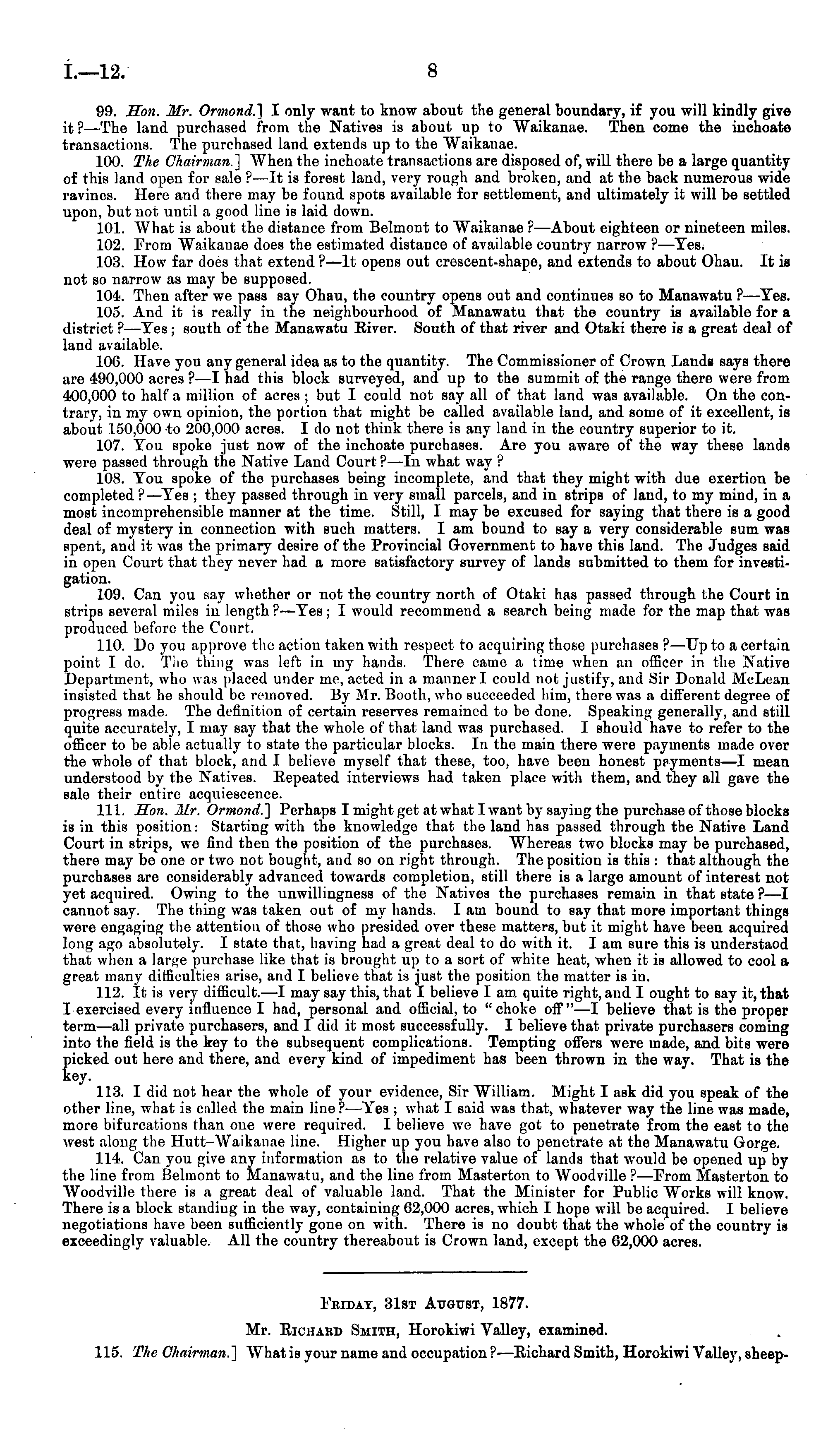 Friday, 31st Augtjst, 1877. Mr. Eiciiaed Smith, Horokiwi Valley, examined. 115. The Chairman.] What is your name and occupation ? —Richard Smith, Horokiwi Valley, sheep-