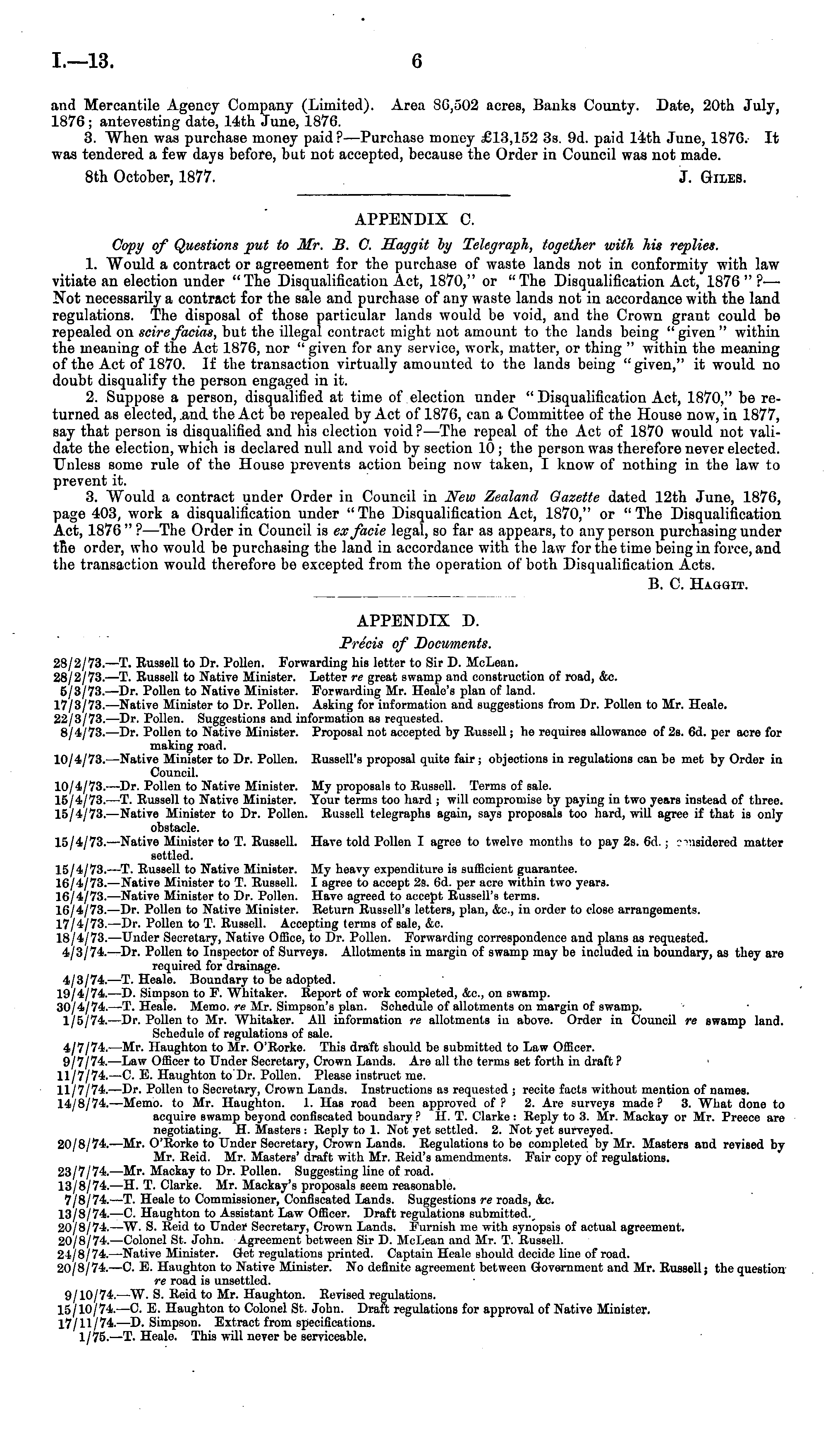 and Mercantile Agency Company (Limited). Area 8G,502 acres, Banks County. Date, 20th July, 1876; antevesting date, 14th June, 1876. 3. When was purchase money paid ?—Purchase money £13,152 3s. 9d. paid 14th June, 1876. It was tendered a few days before, but not accepted, because the Order in Council was not made. Bth October, 1877. J. Giles.