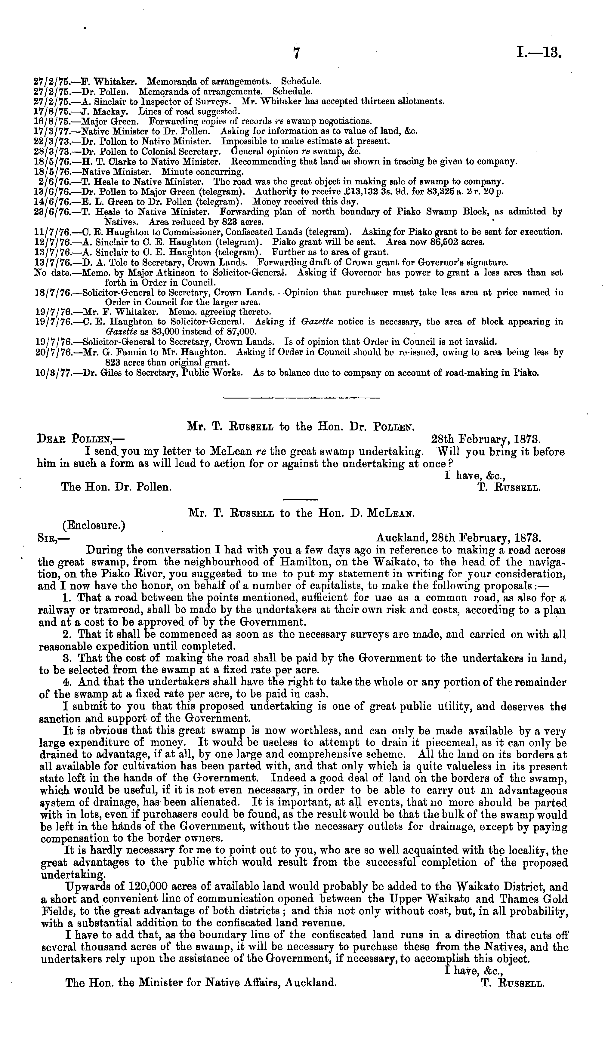 Mr. T. Russell to the Hon. D. McLean. (Enclosure.) Sib,— Auckland, 28th February, 1873. During the conversation I had with you a few days ago in reference to making a road across the great swamp, from the neighbourhood of Hamilton, on the Waikato, to the head of the navigation, on the Piako Eiver, you suggested to me to put my statement in writing for your consideration, and I now have the honor, on behalf of a number of capitalists, to make the following proposals:— 1. That a road between the points mentioned, sufficient for use as a common road, as also for a railway or tramroad, shall be made by the undertakers at their own risk and costs, according to a plan and at a cost to be approved of by the Government. 2. That it shall be commenced as soon as the necessary surveys are made, and carried on with all reasonable expedition until completed. 3. That the cost of making the road shall be paid by the Government to the undertakers in land, to be selected from the swamp at a fixed rate per acre. 4. And that the undertakers shall have the right to take the whole or any portion of the remainder of the swamp at a fixed rate per acre, to be paid in cash. I submit to you that this proposed undertaking is one of great public utility, and deserves the sanction and support of the Government. It is obvious that this great swamp is now worthless, and can only be made available by a very large expenditure of money. It would be useless to attempt to drain it piecemeal, as it can only be drained to advantage, if at all, by one large and comprehensive scheme. All the land on its borders at all available for cultivation has been parted with, and that only which is quite valueless in its present state left in the hands of the Government. Indeed a good deal of land on the borders of the swamp, which would be useful, if it is not even necessary, in order to be able to carry out an advantageous system of drainage, has been alienated. It is important, at all events, that no more should be parted with in lots, even if purchasers could be found, as the result would be that the bulk of the swamp would be left in the hands of the Government, without the necessary outlets for drainage, except by paying compensation to the border owners. It is hardly necessary for me to point out to you, who are so well acquainted with the locality, the great advantages to the public which would result from the successful completion of the proposed undertaking. Upwards of 120,000 acres of available land would probably be added to the Waikato District, and a short and convenient line of communication opened between the Upper Waikato and Thames Gold Fields, to the great advantage of both districts ; and this not only without cost, but, in all probability, with a substantial addition to the confiscated land revenue. I have to add that, as the boundary line of the confiscated land runs in a direction that cuts off several thousand acres of the swamp, it will be necessary to purchase these from the Natives, and the undertakers rely upon the assistance of the Government, if necessary, to accomplish this object. I have, &c, The Hon. the Minister for Native Affairs, Auckland. T. Russell.
