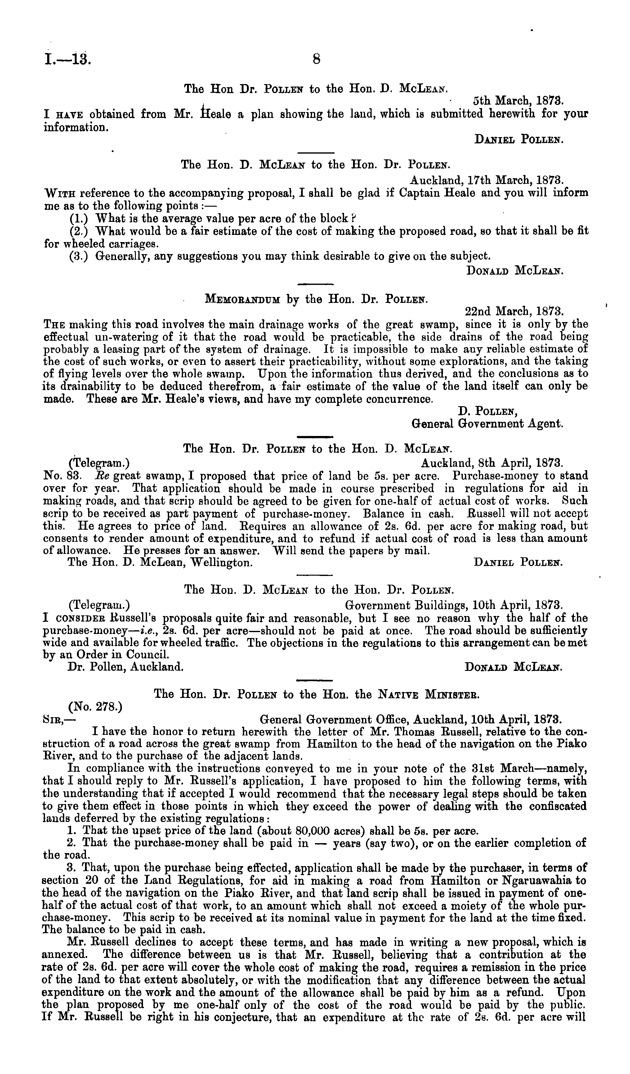 The Hon. Dr. Pollen to the Hon. the Native Minister. (No. 278.) Sib, — General Government Office, Auckland, 10th April, 1873. I have the honor to return herewith the letter of Mr. Thomas Russell, relative to the construction of a road across the great swamp from Hamilton to the head of the navigation on the Piako River, and to the purchase of the adjacent lands. In compliance with the instructions conveyed to me in your note of the 31st March—namely, that I should reply to Mr. Russell's application, I have proposed to him the following terms, with the understanding that if accepted I would recommend that the necessary legal steps should be taken to give them effect in those points in which they exceed the power of dealing with the confiscated lands deferred by the existing regulations : 1. That the upset price of the land (about 80,000 acres) shall be ss. per acre. 2. That the purchase-money shall be paid in — years (say two), or on the earlier completion of the road. 3. That, upon the purchase being effected, application shall be made by the purchaser, in terms of section 20 of the Land Regulations, for aid in making a road from Hamilton or Ngaruawahia to the head of the navigation on the Piako River, and that land scrip shall be issued in payment of onehalf of the actual cost of that work, to an amount which shall not exceed a moiety of the whole pur-chase-money. This scrip to be received at its nominal value in payment for the land at the time fixed. The balance to be paid in cash. Mr. Russell declines to accept these terms, and has made in writing a new proposal, which is annexed. The difference between us is that Mr. Russell, believing that a contribution at the rate of 2s. 6d. per acre will cover the whole cost of making the road, requires a remission in the price of the land to that extent absolutely, or with the modification that any difference between the actual expenditure on the work and the amount of the allowance shall be paid by him as a refund. Upon the plan proposed by me one-half only of the cost of the road would be paid by the public. If Mr. Russell be right in his conjecture, that an expenditure at the rate of 2s. 6d. per acre will